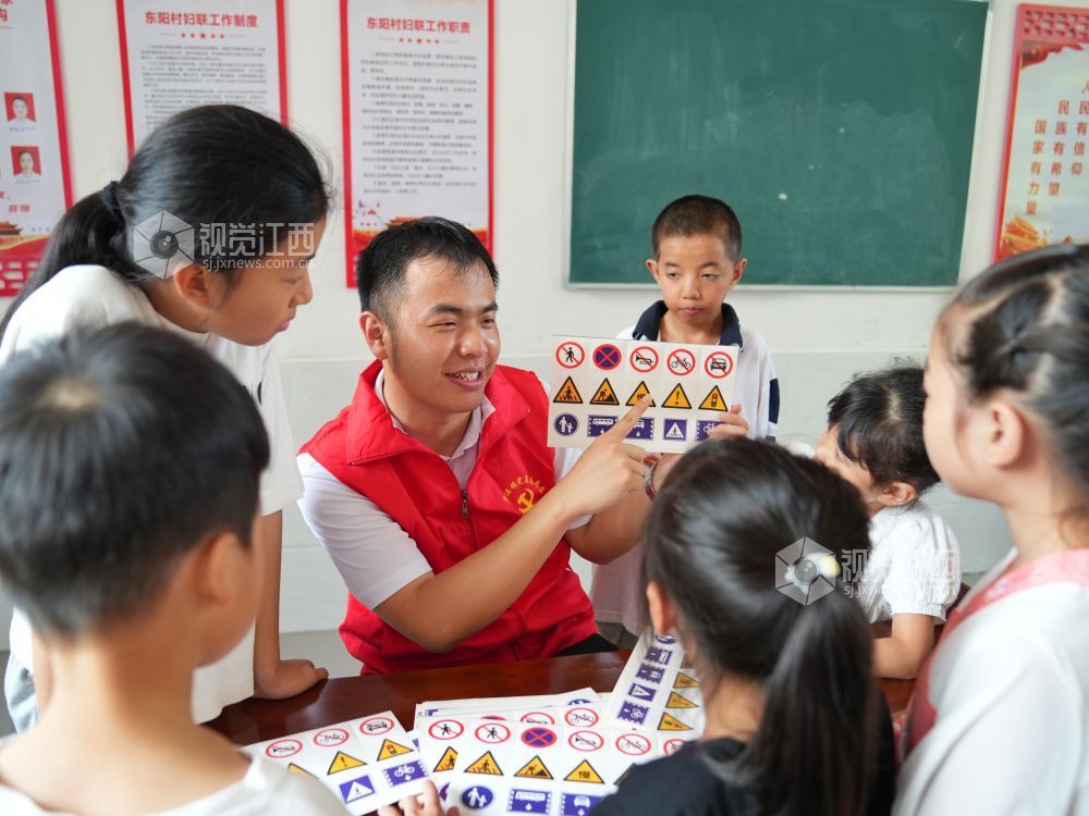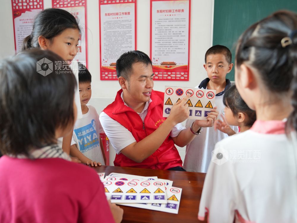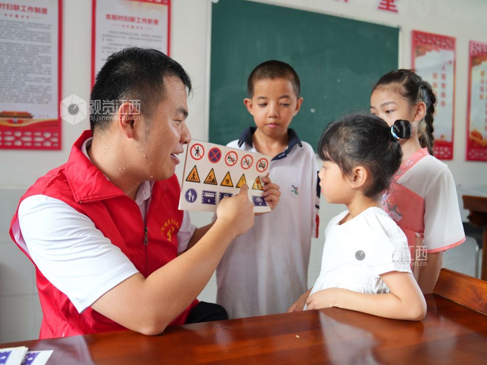 2023年7月16日,在江西省萍乡市芦溪县芦溪镇东阳村儿童书院,党员志愿者带领小朋友认识交通安全标识。