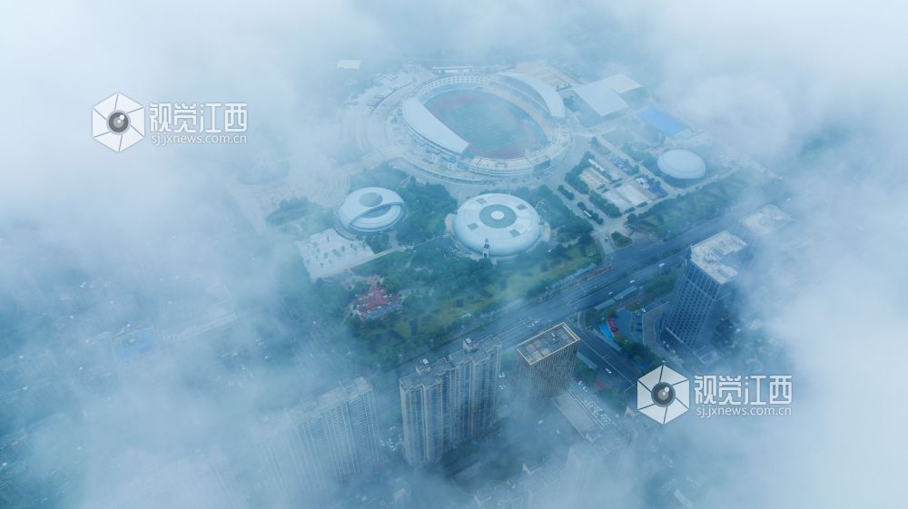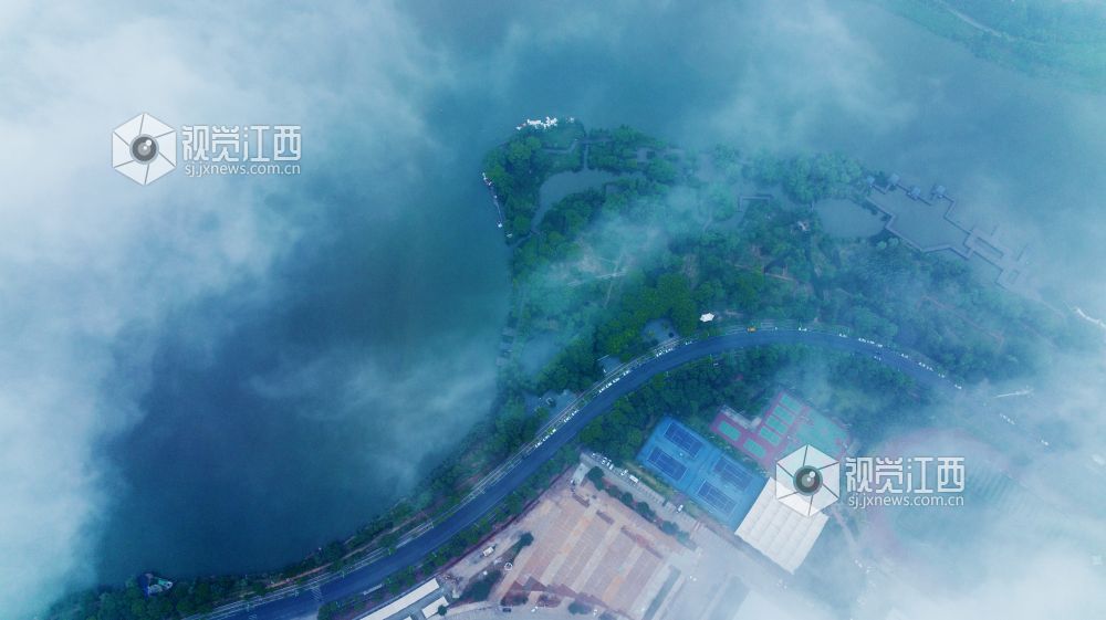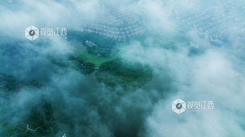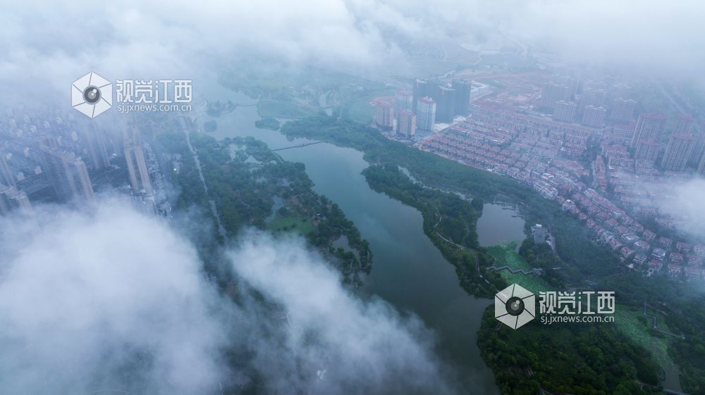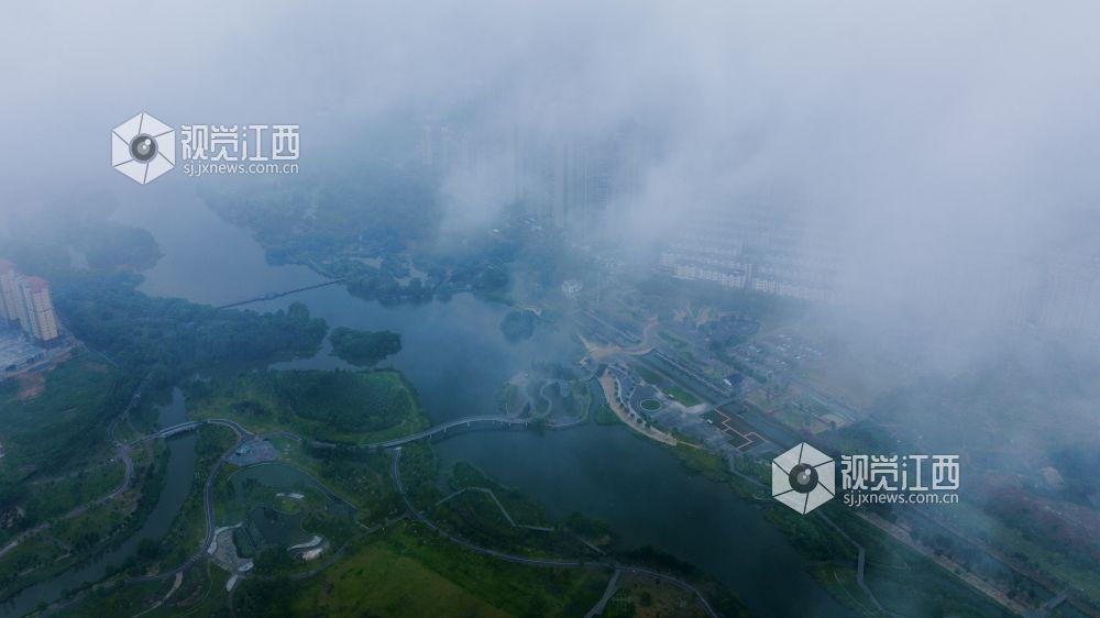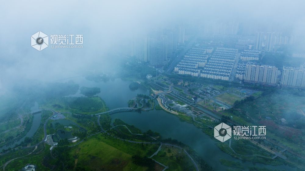 7月18日凌晨,江西新余孔目江国家湿地公园上空云雾缭绕,公园、道路、河流、桥梁、房屋、体育中心在云雾中忽隐忽现,如诗如画。