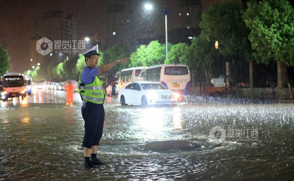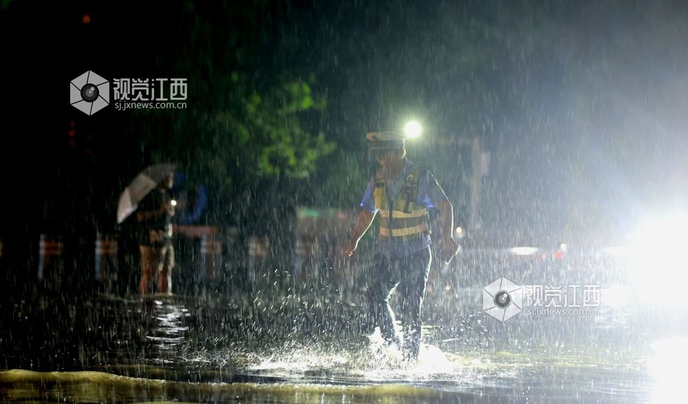 2023年7月19日,江西省瑞昌市城区各交通要道,交警冒雨上路指挥疏导交通。