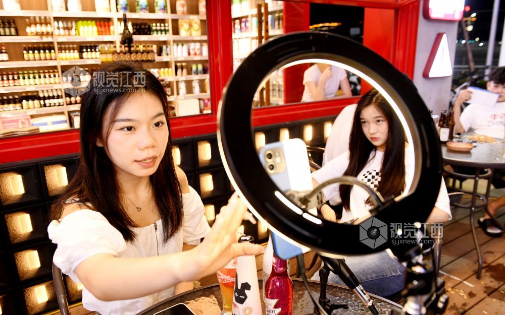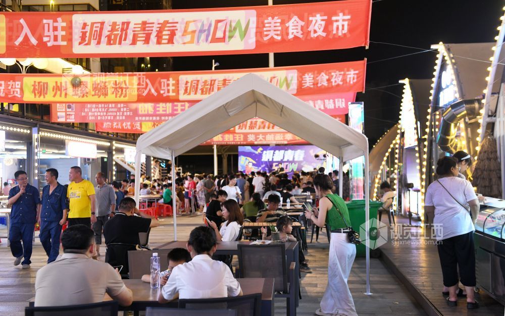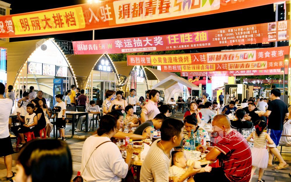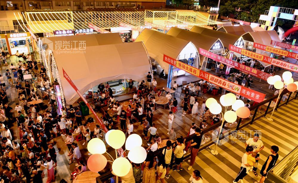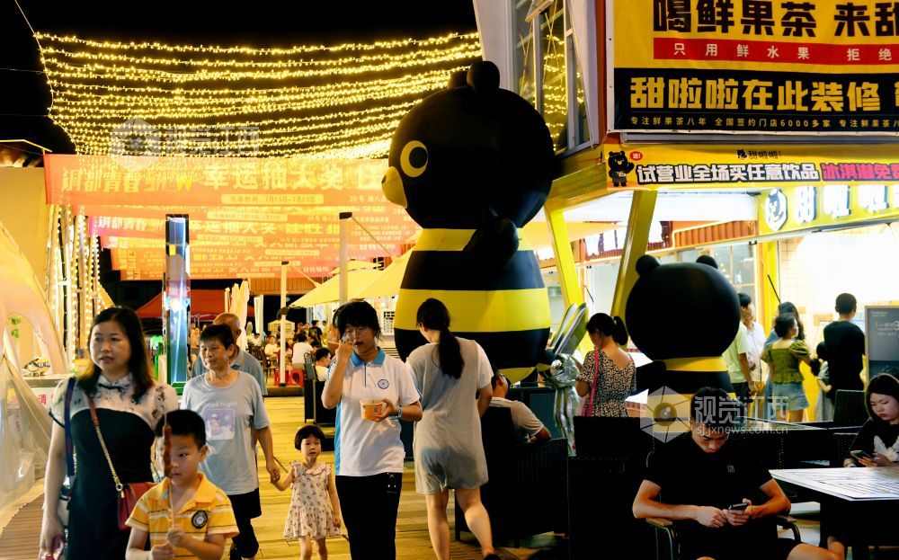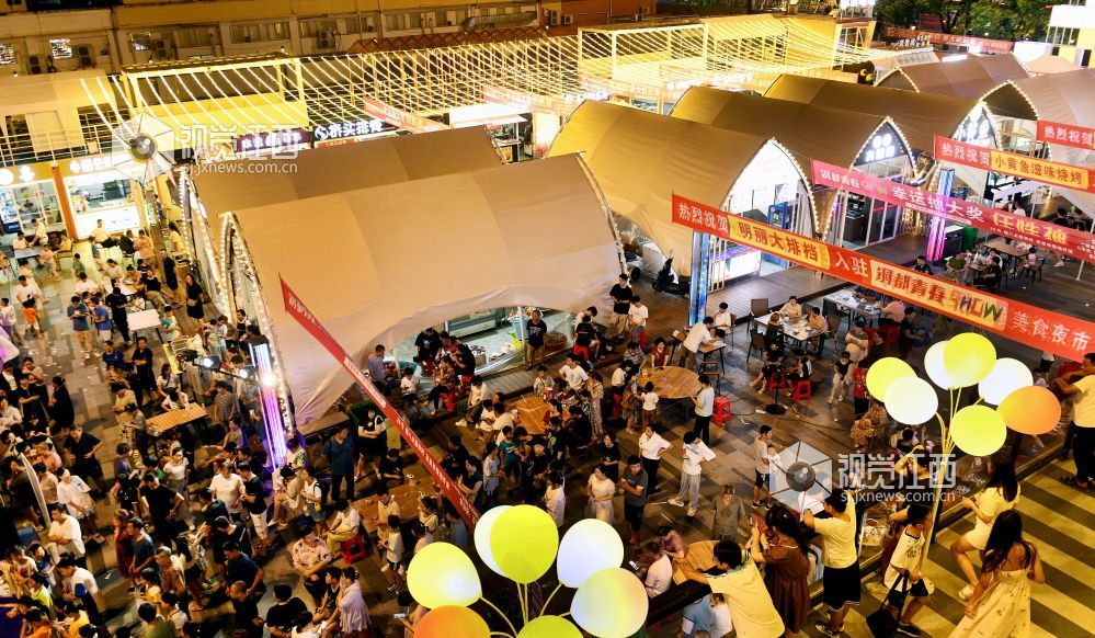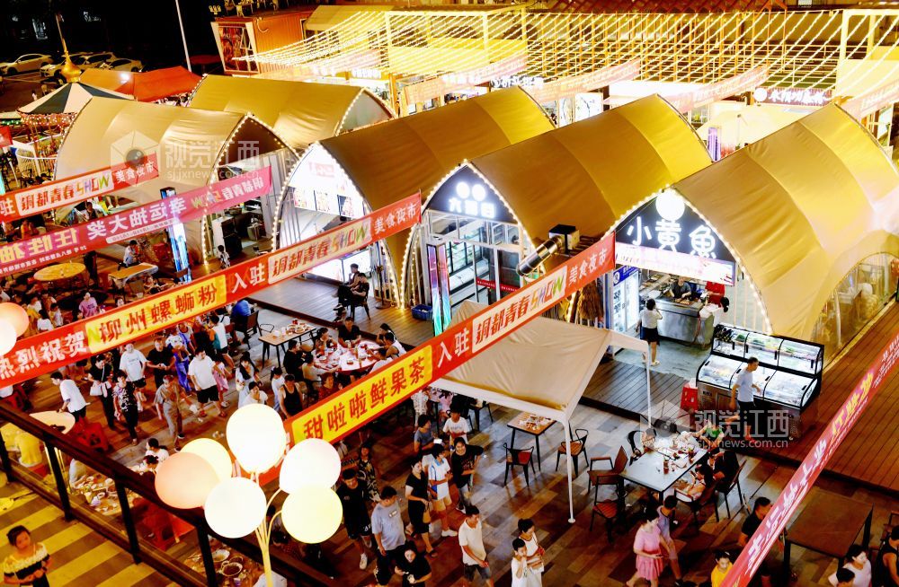 2023年7月20日,江西省德兴市都青春SHOW网红夜市灯火阑珊,前来消费的市民络绎不绝。