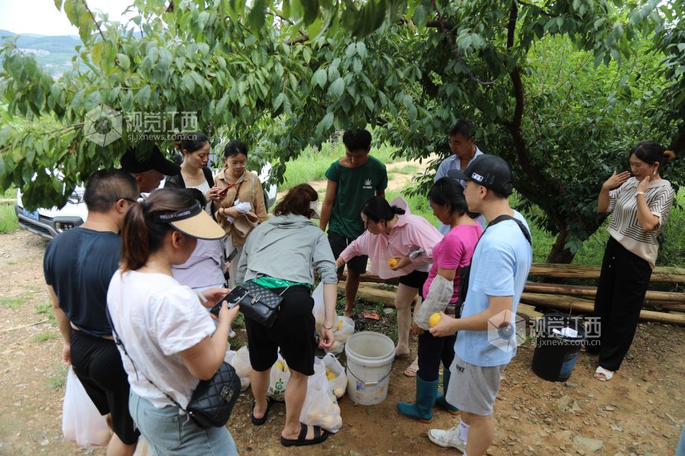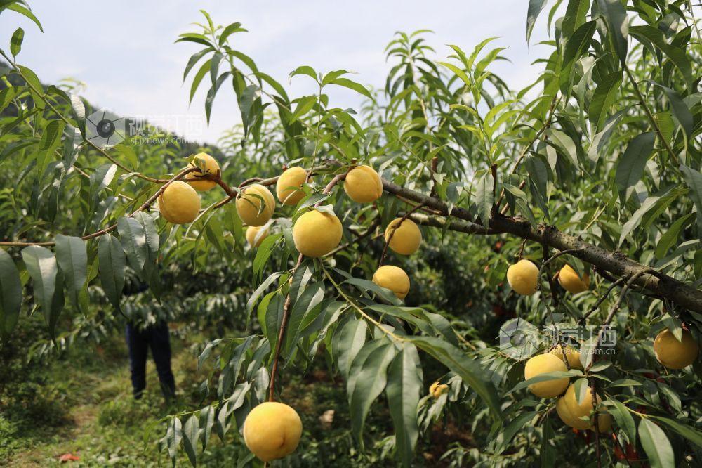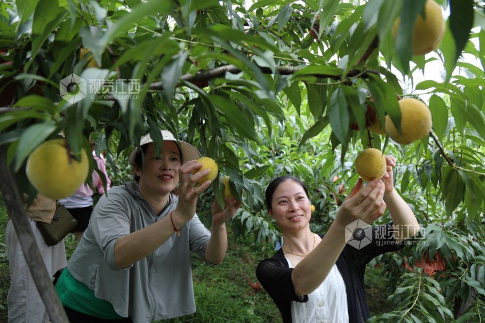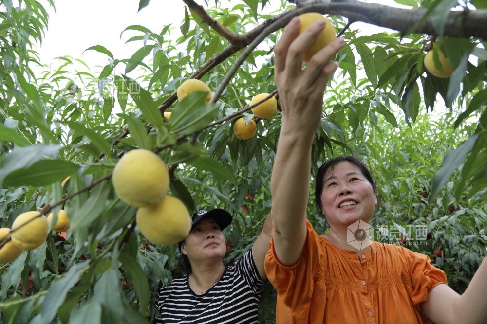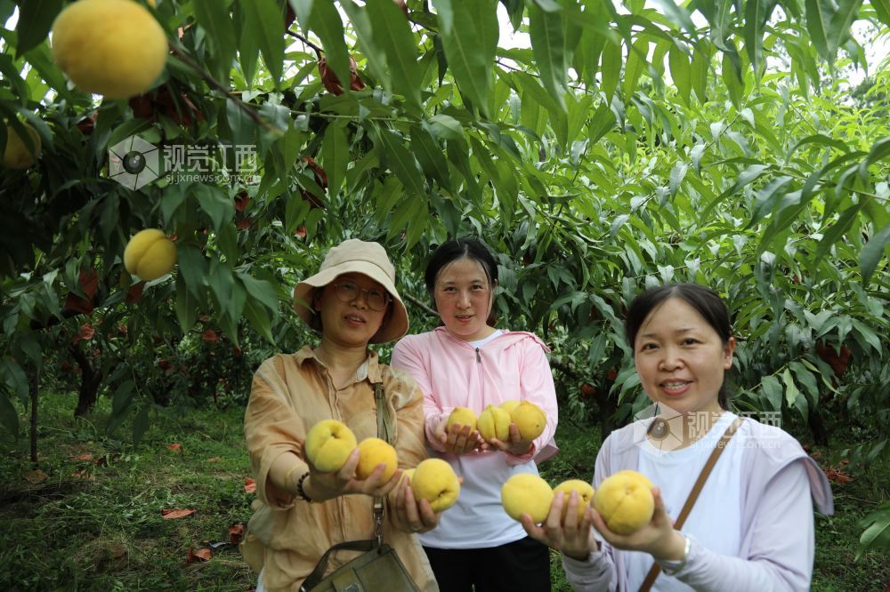7月25日,江西省莲花县坊楼镇东边村果业基地,金色的黄桃挂满枝头,游客穿梭其间,快乐采摘,开心游玩。