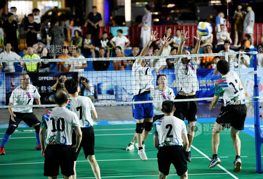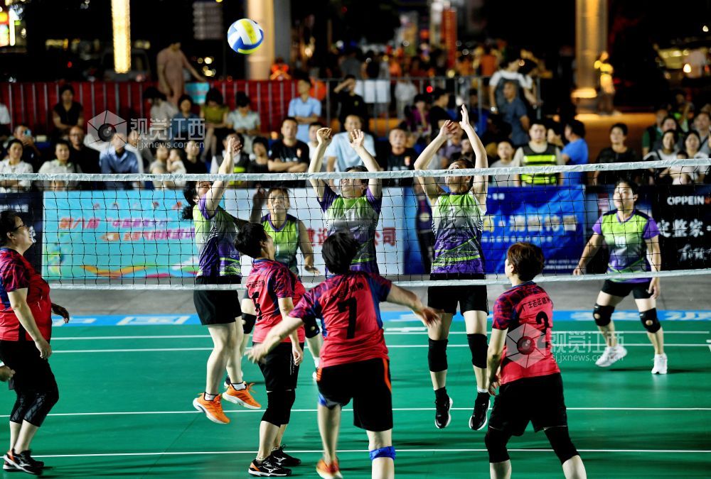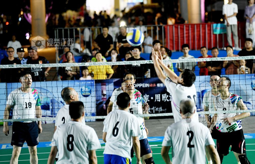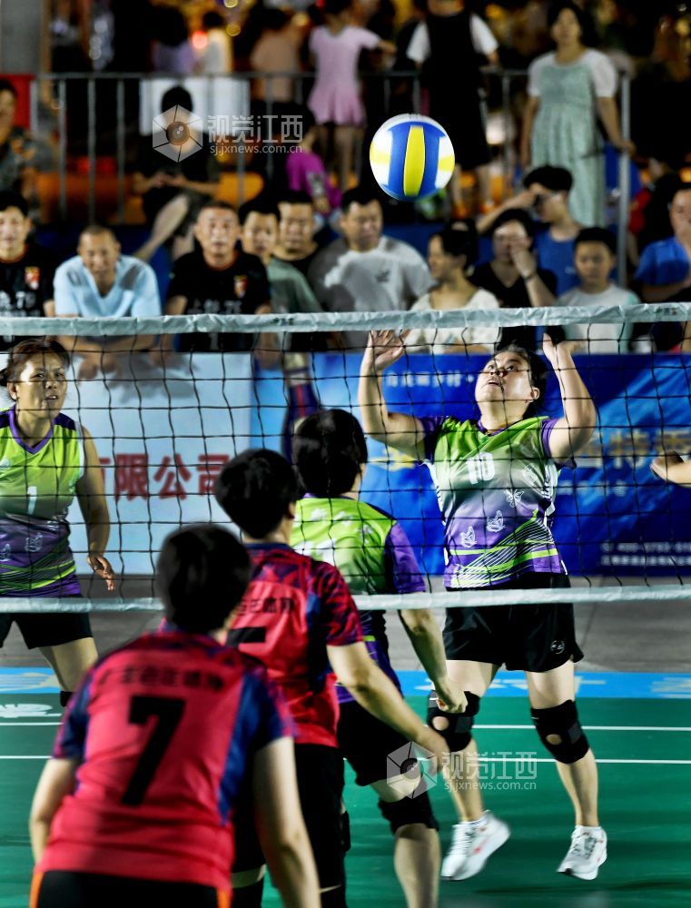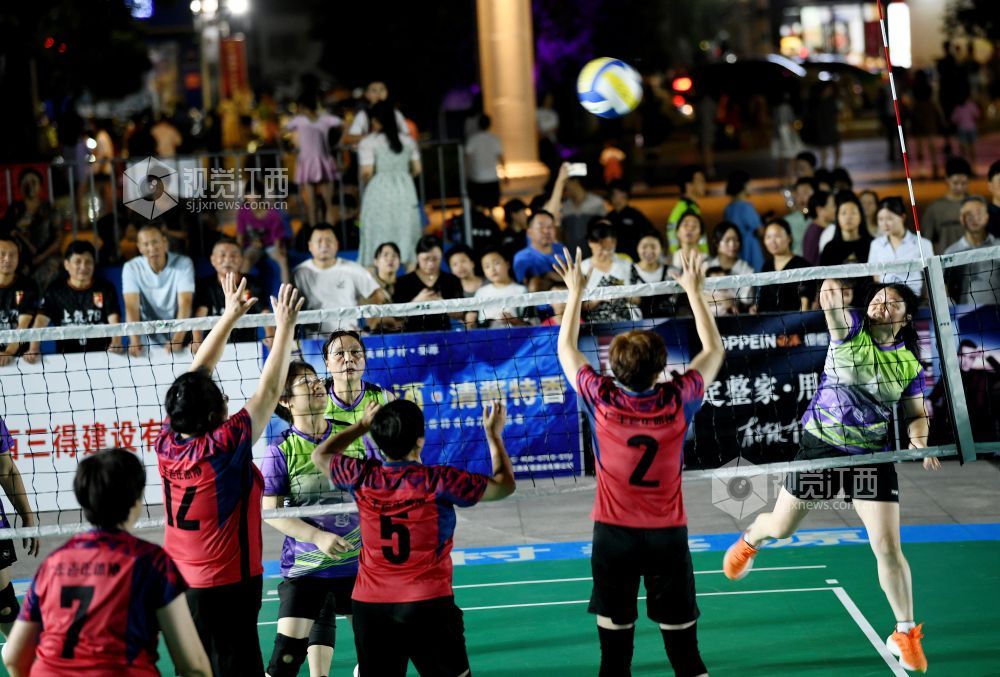 2023年7月25日,在江西省婺源县第八届“中国最美乡村”全国气排球邀请赛现场,来自江西上饶广丰区和广西桂林新阳光气排球协会的队员们正在同场竞技。