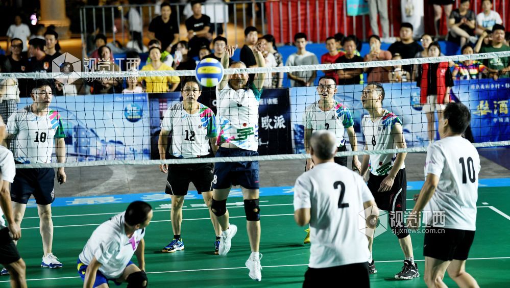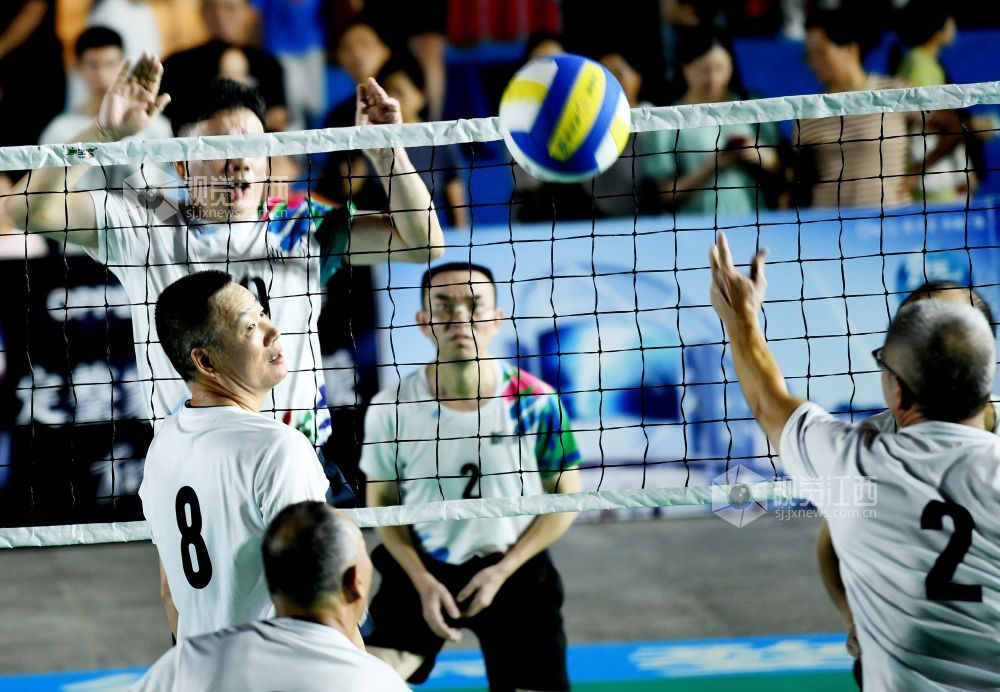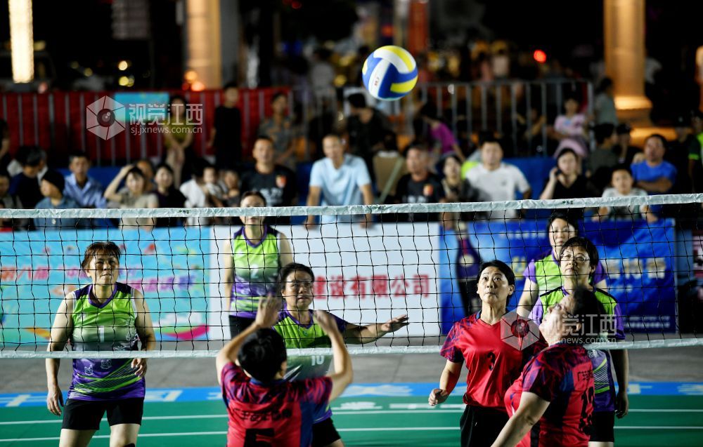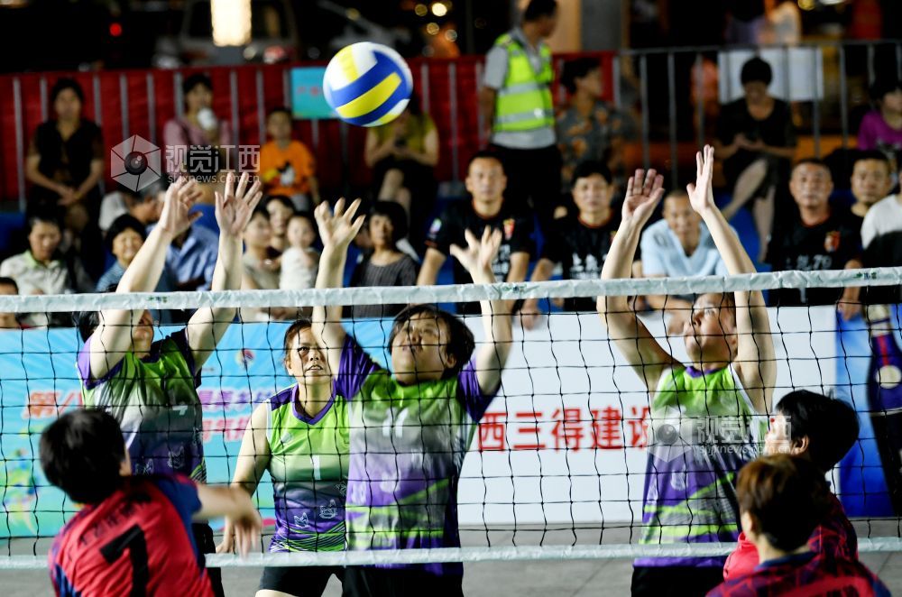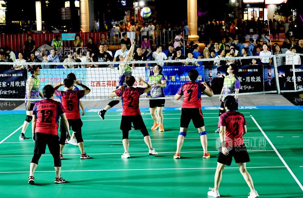 2023年7月25日,在江西省婺源县第八届“中国最美乡村”全国气排球邀请赛现场,来自江西上饶广丰区和广西桂林新阳光气排球协会的队员们正在同场竞技。