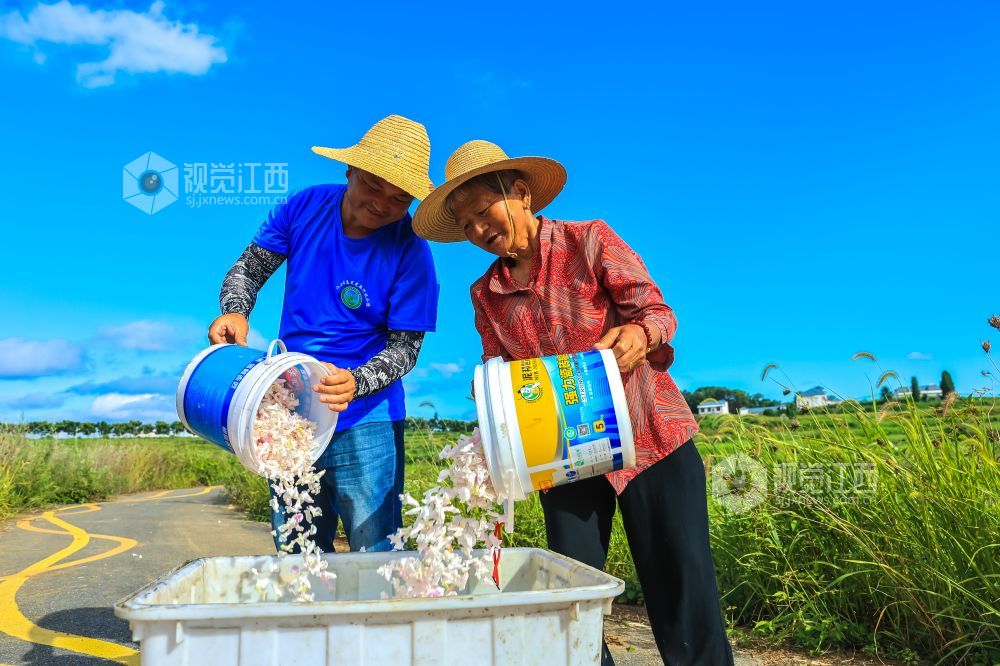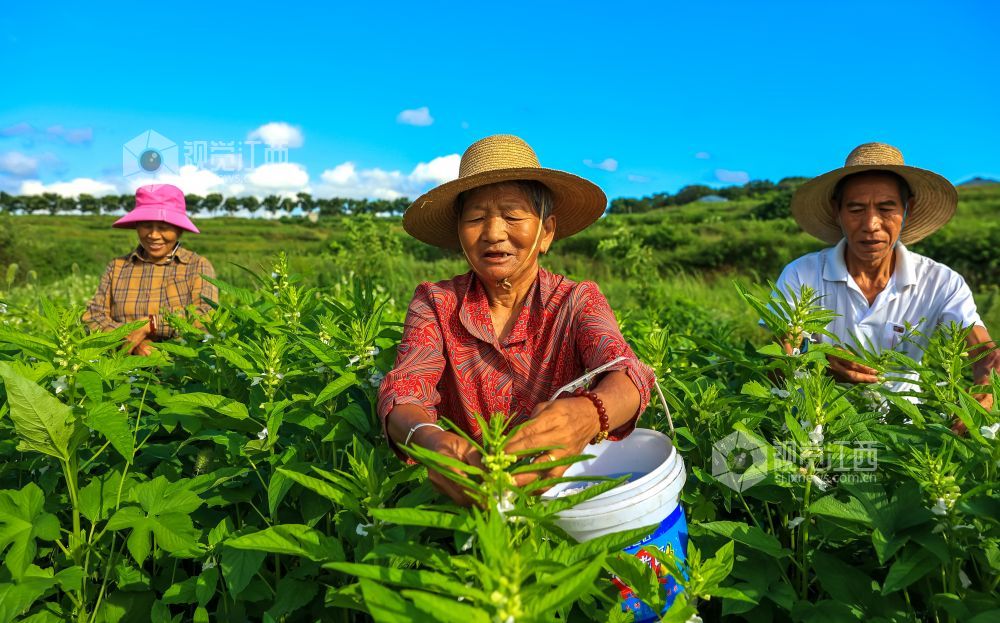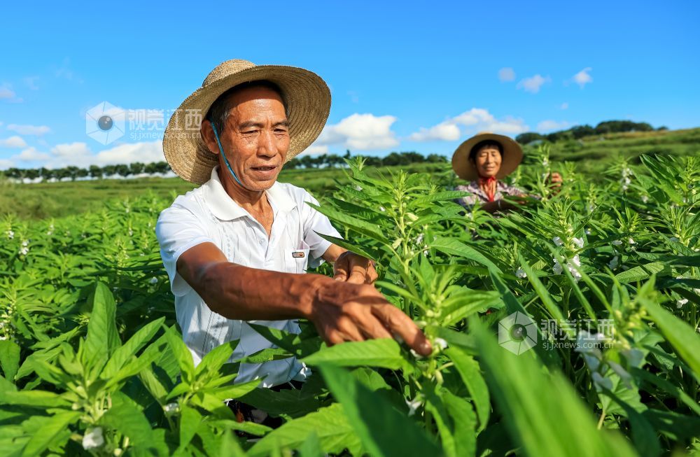 2023年7月28日,江西省瑞昌市武蛟乡现代农业产业园黑芝麻、油菜循环种植基地,村民在采摘芝麻花。