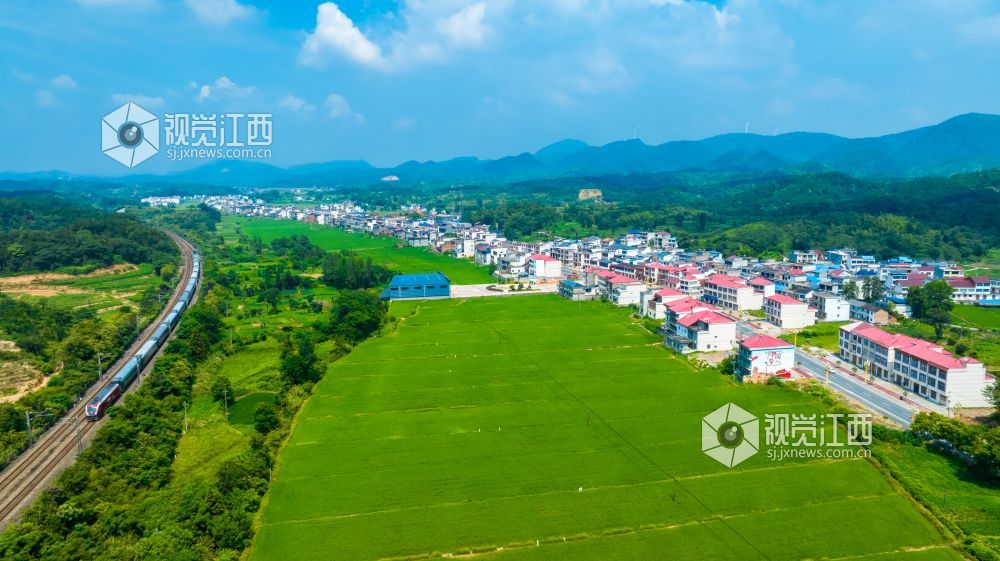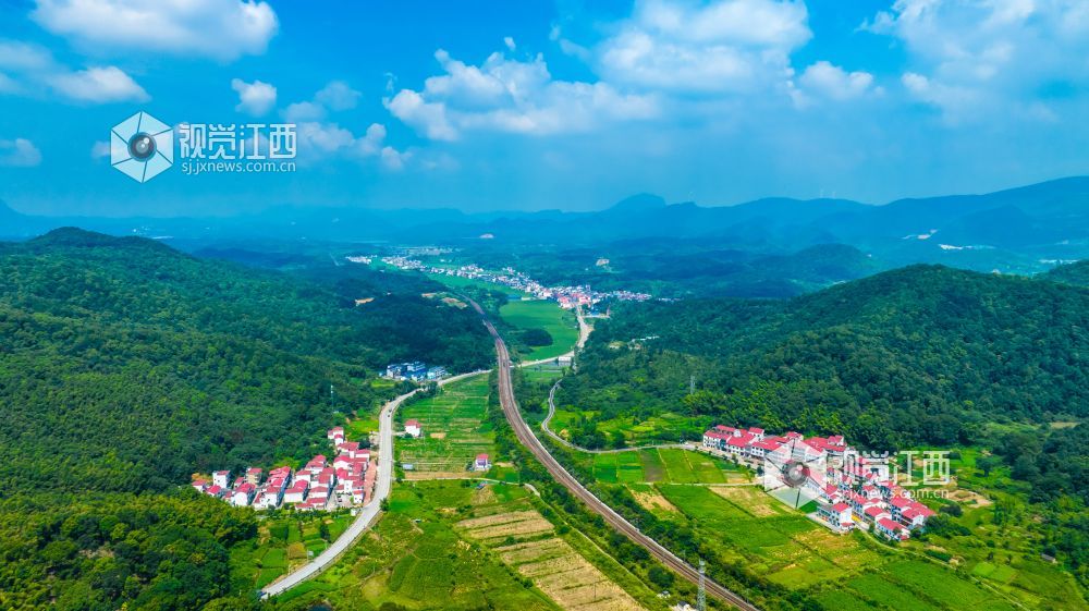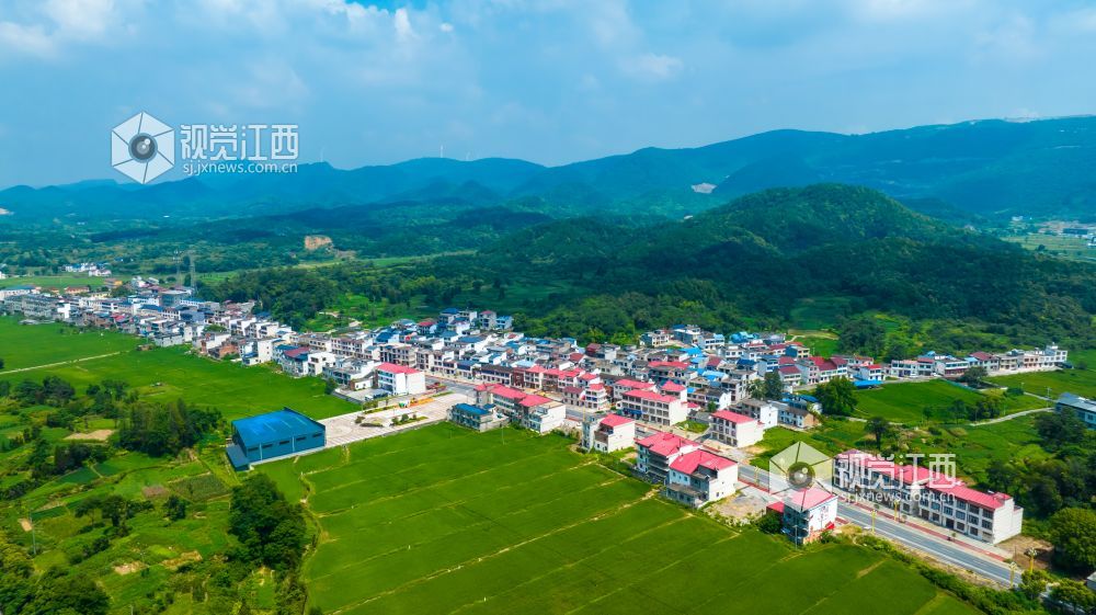 2023年8月3日,俯瞰蓝天白云下的江西省瑞昌市黄金乡,连绵的青山、多彩的民居和绿色的田园交相辉映,勾勒出一幅生机盎然的山乡生态画卷。