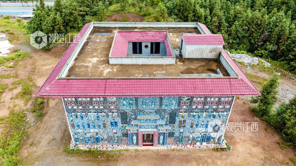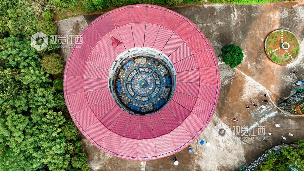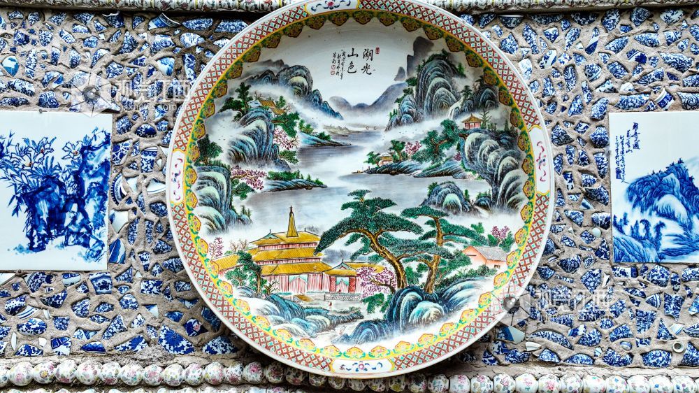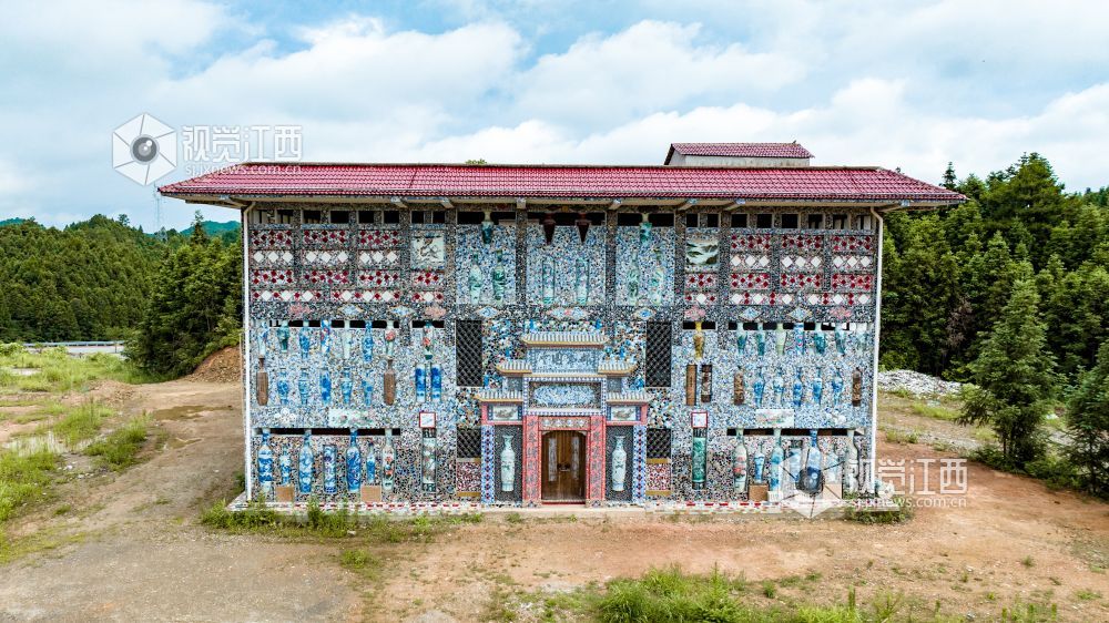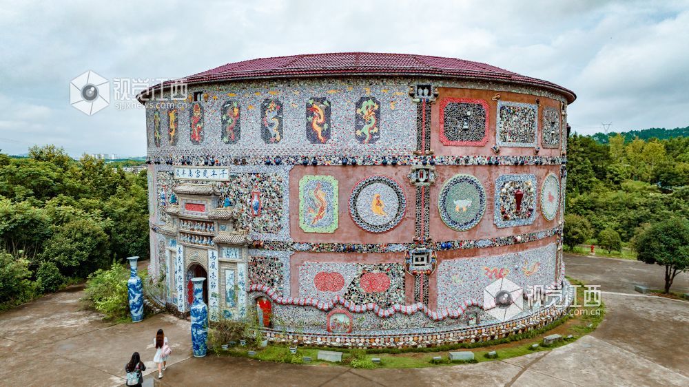 千年瓷宫位于江西省景德镇市浮梁县新平村的新平公路旁,其外形像一个色彩斑斓的巨大圆形“蛋糕”,建筑物内外墙面也像天津的“瓷房子”一样,贴满了瓷片和瓷器,据说整座建筑用了6万多件瓷器和80吨瓷片,来来往往的车辆经过这里,无一不停车驻足观看。