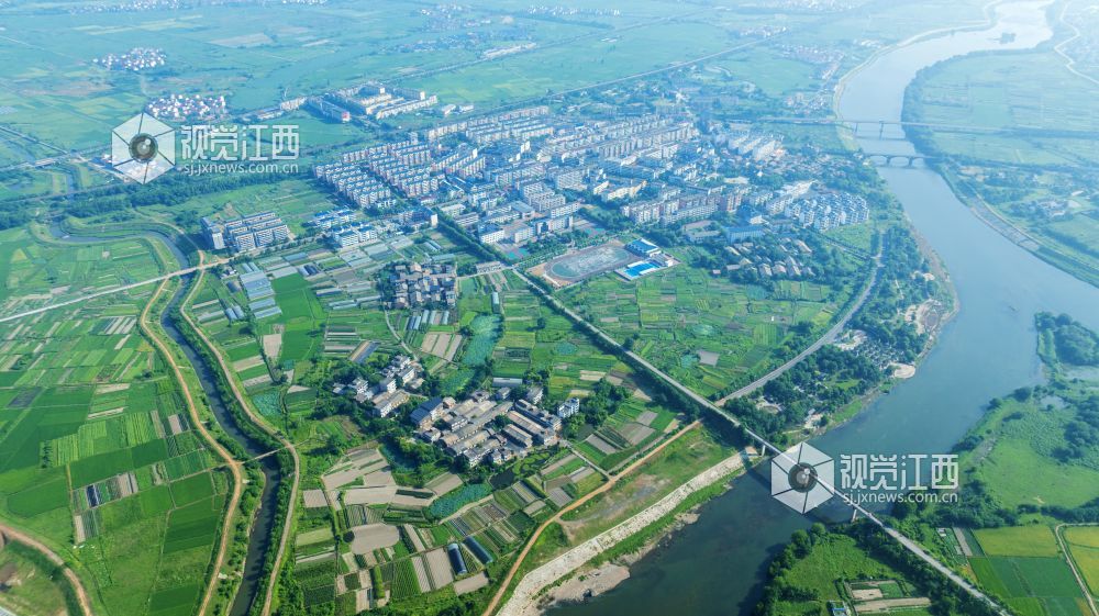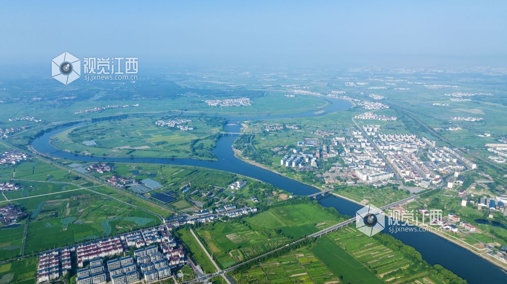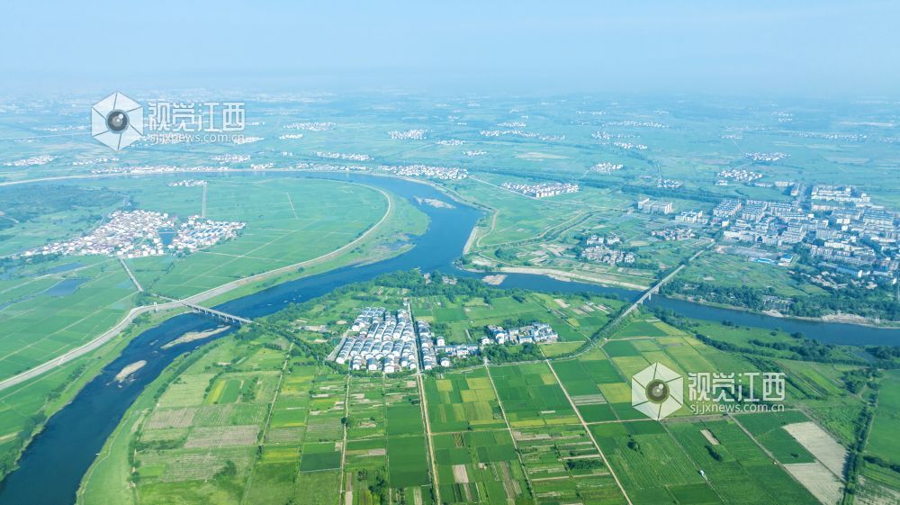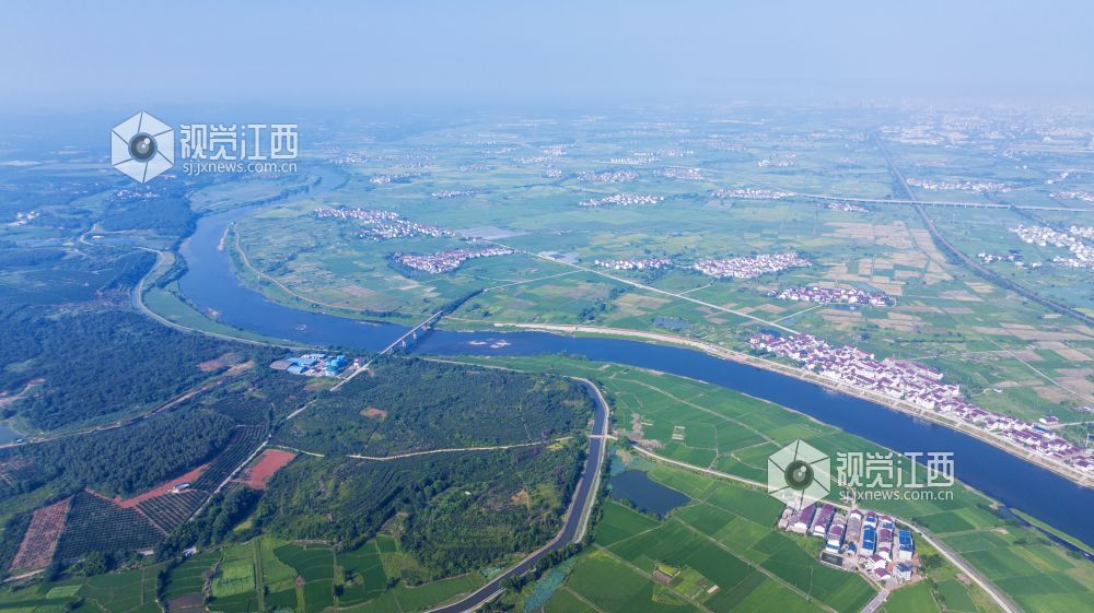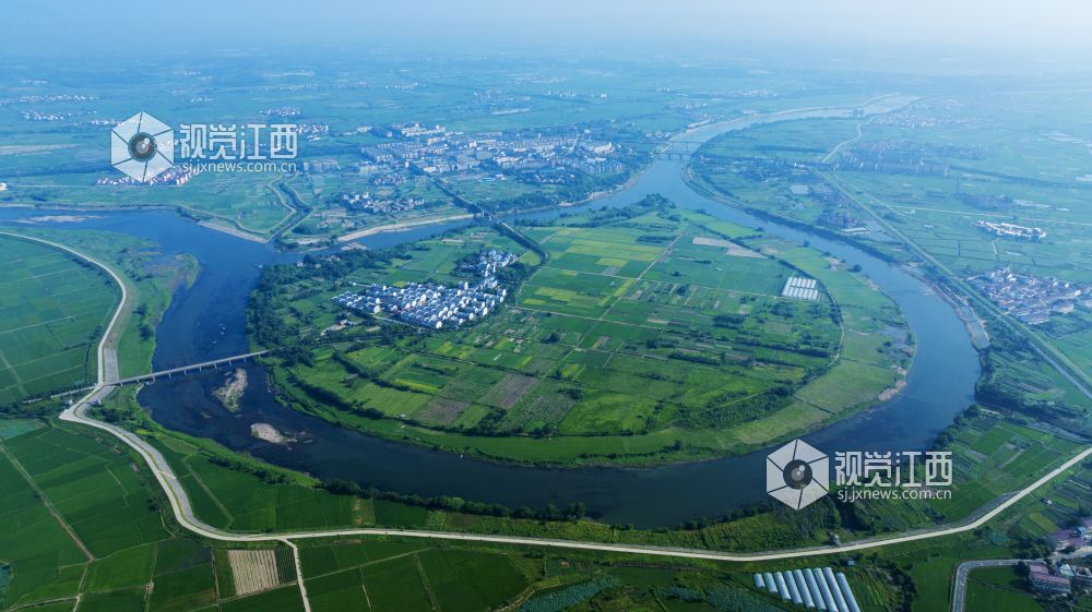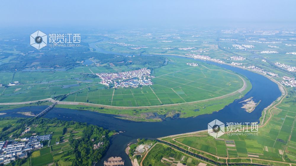 8月6日,鸟瞰国画大师傅抱石故里江西新余渝水区罗坊镇,田园、河流、村庄、道路、森林相映成趣,袁河河段水清、岸绿、河畅、景美,组成了一幅美丽的山水图画。