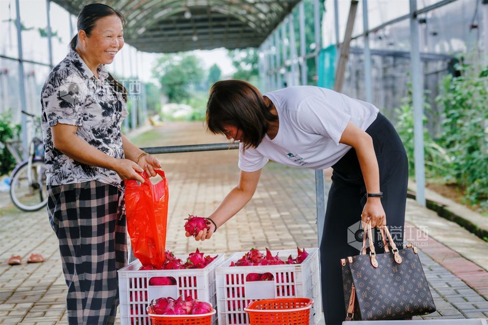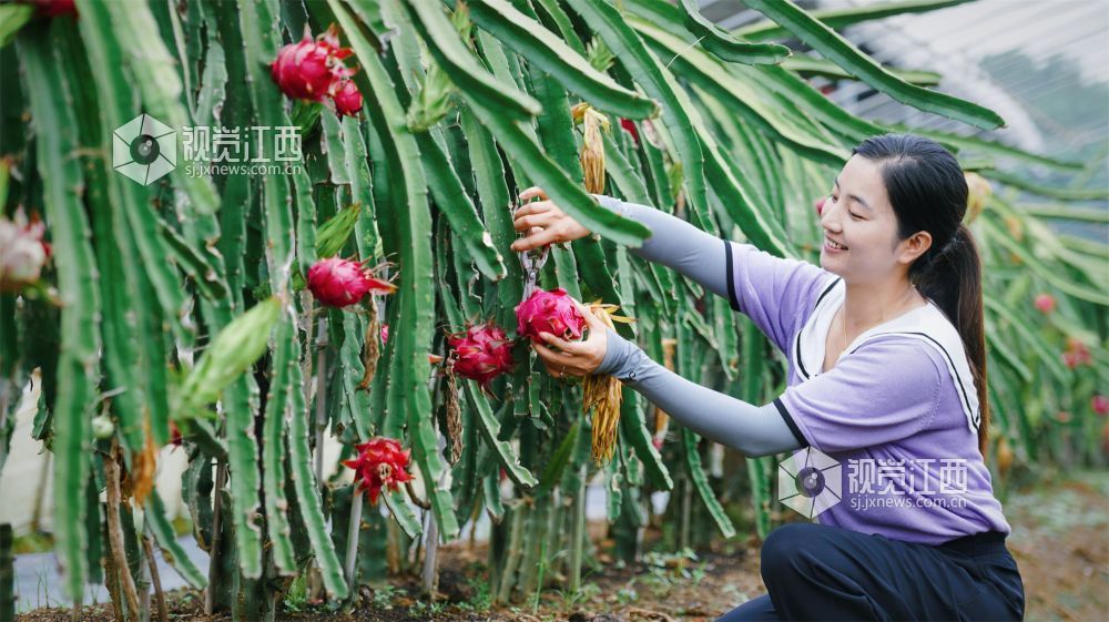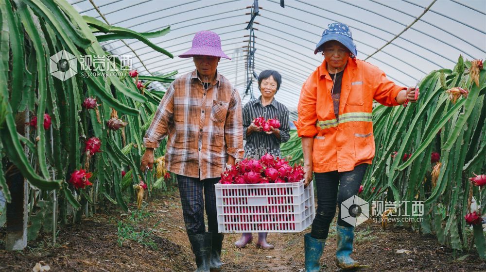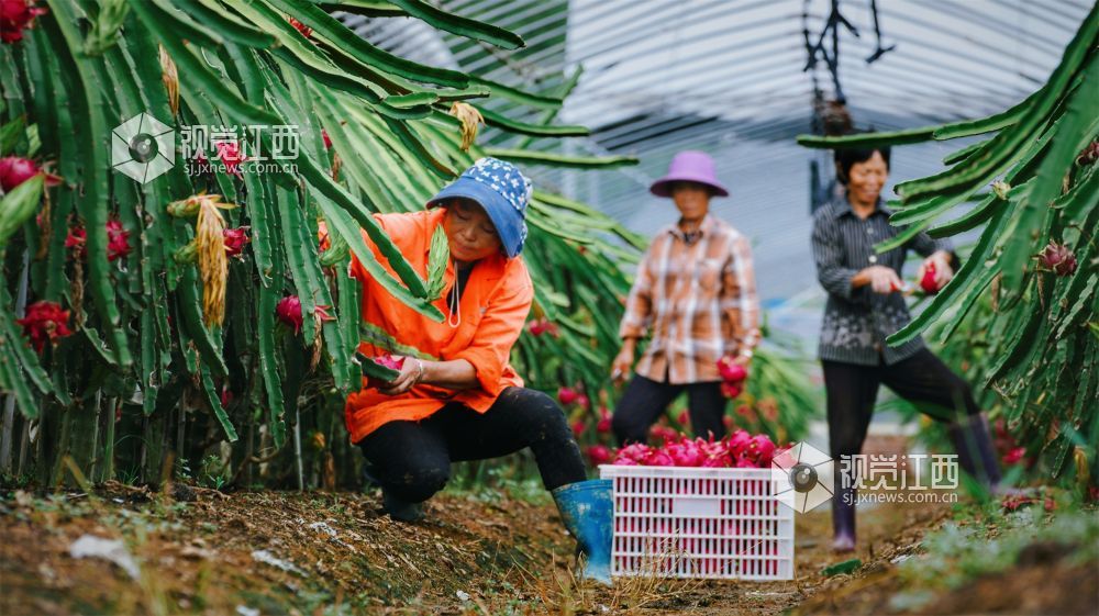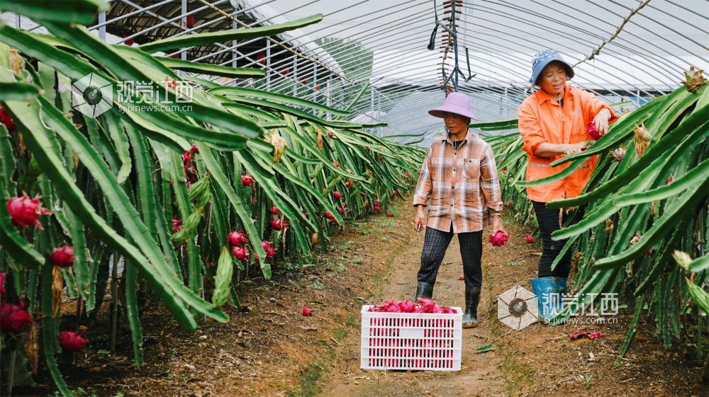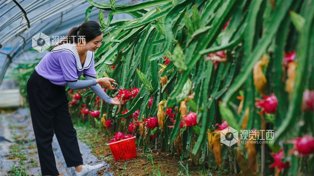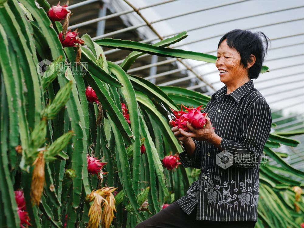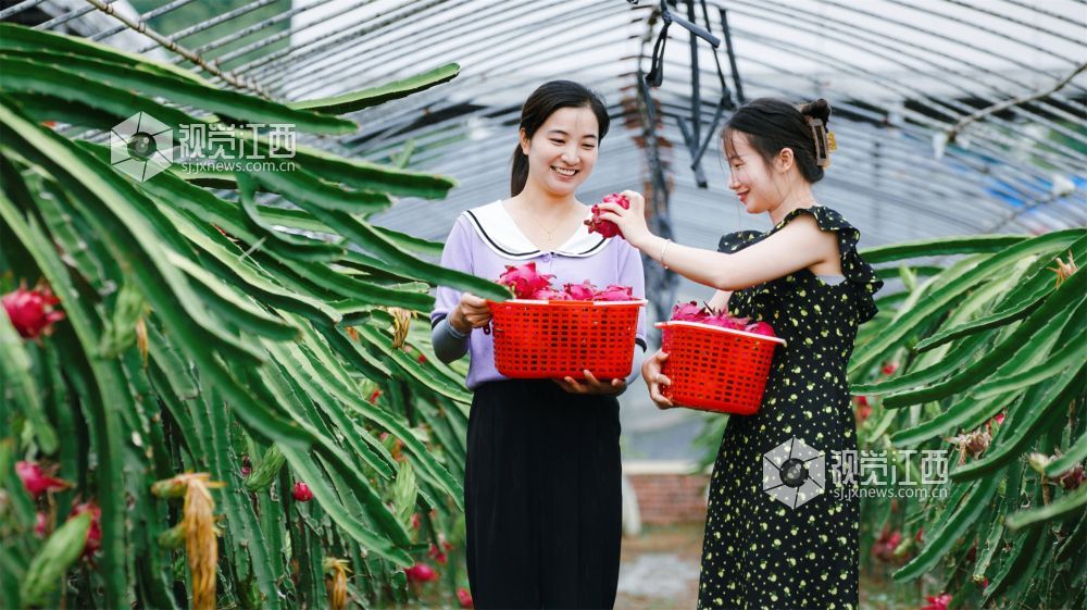 8月9日,江西省新余市高新区水西镇江边村委田南村欧斯卡生态养殖农民专业合作社60余亩的红心火龙果迎来了丰收期,绿茎红果相互映衬,果农们忙着采收,一派丰收的喜人景象。果形饱满的火龙果也吸引了不少游客慕名而来,体验采摘的乐趣。