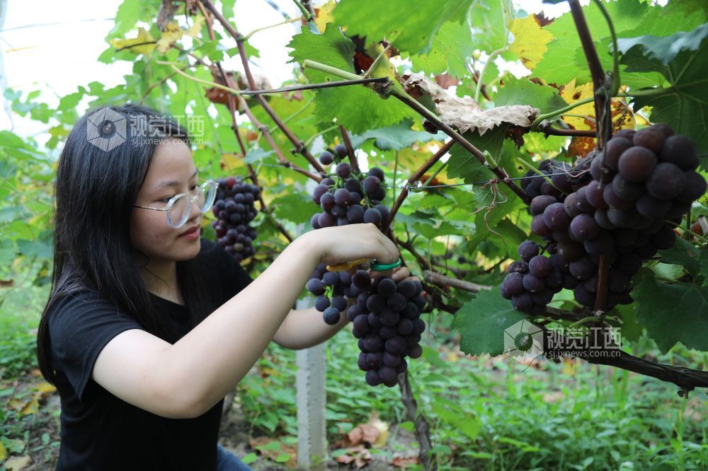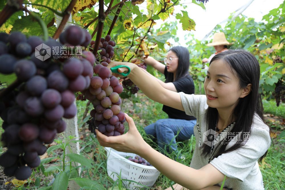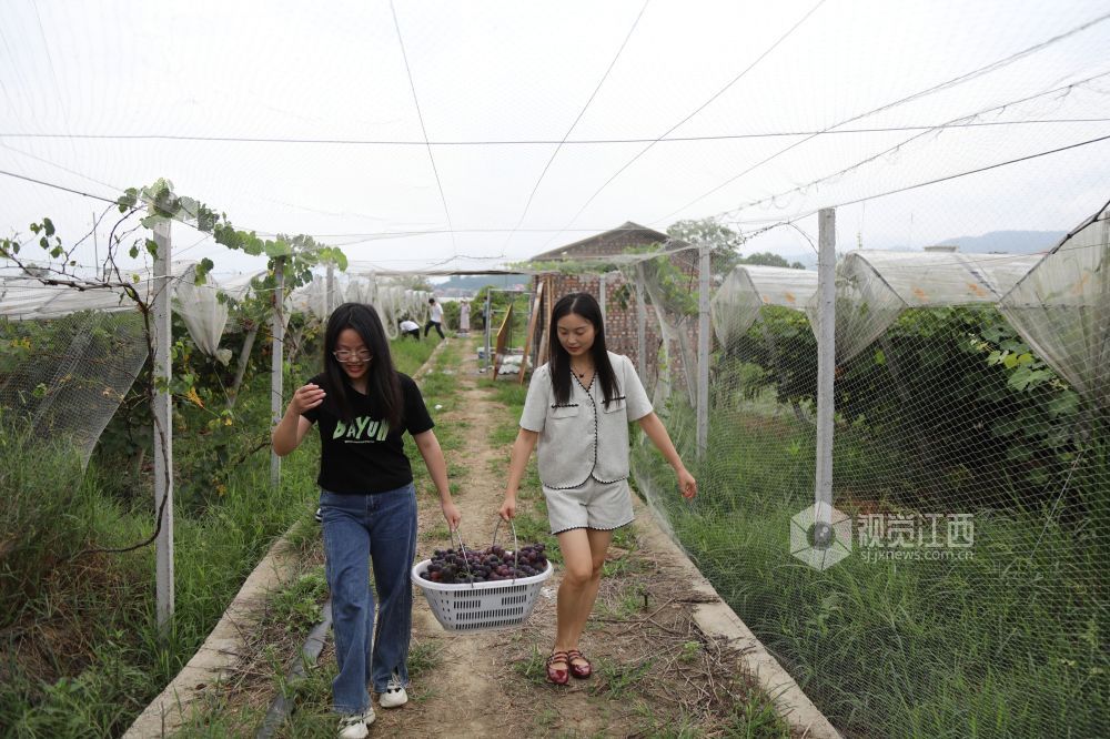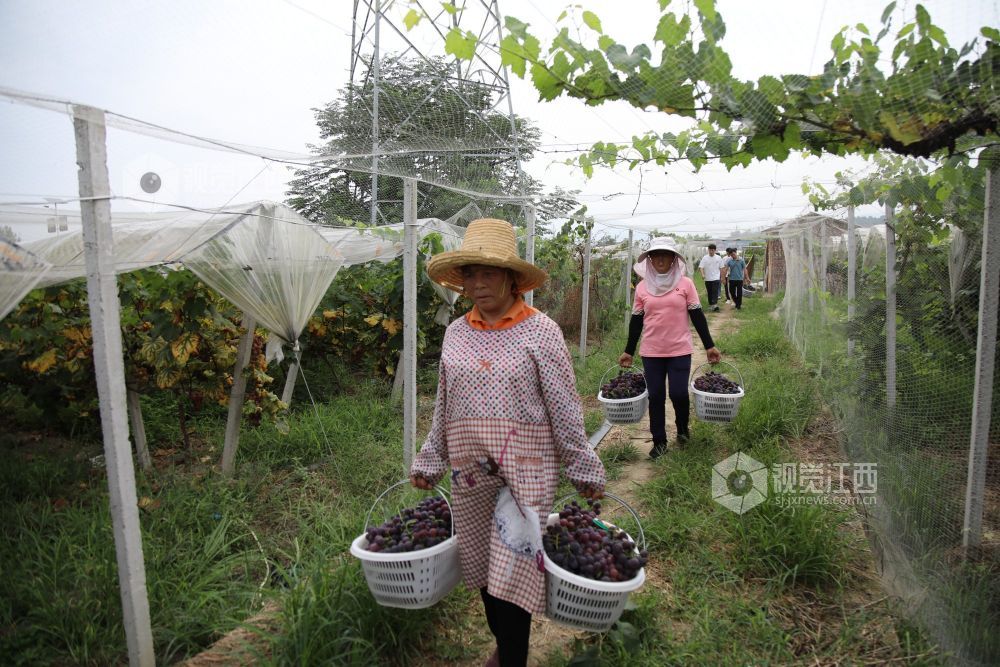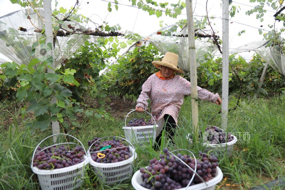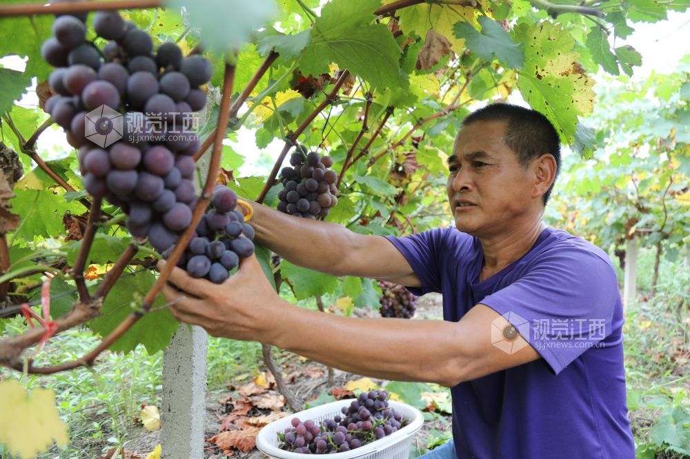 8月10日,走进江西省莲花县神泉乡五洲村葡萄种植基地,大棚内一串串紫红圆润的果实挂满藤架,粒粒葡萄透着诱人的光泽。采摘的村民穿梭葡萄架之间,忙着采摘;游客提着篮筐,寻找成熟的葡萄串,体验采摘的快乐。