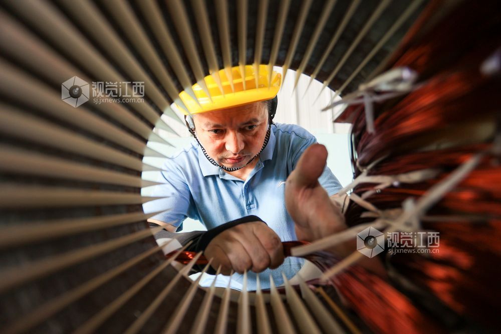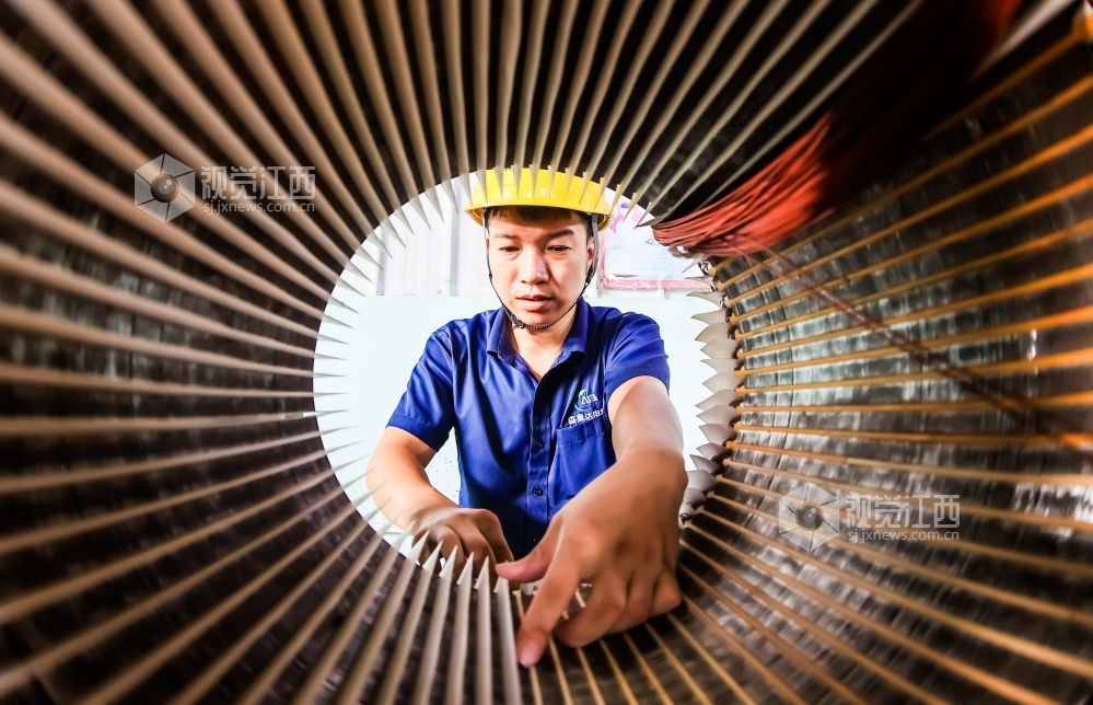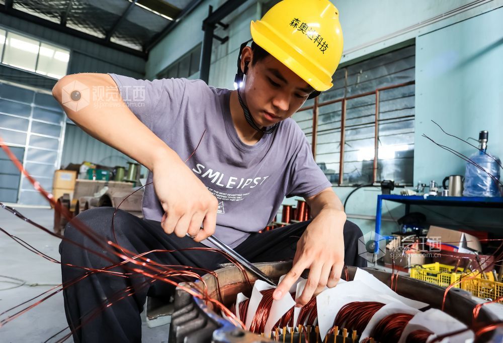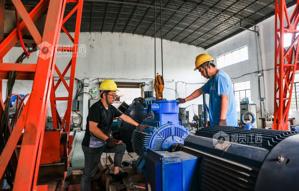 2023年8月10日,江西省瑞昌市森奥达科技有限公司车间内一派繁忙景象,工人们正在为华北油田进行旧电机改造。