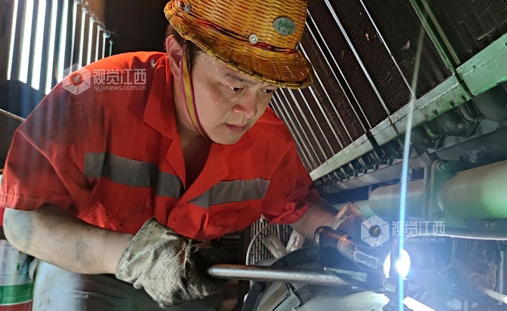 8月10日,在中国铁路南昌局集团公司向塘机务段整备车间内燃检修库内人头攒动,一辆内燃机车上,机械组党员副工长谢杰正在仔细地检查着机车各部件。