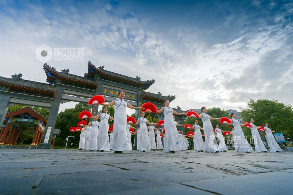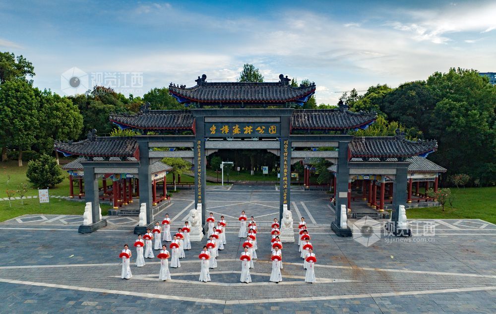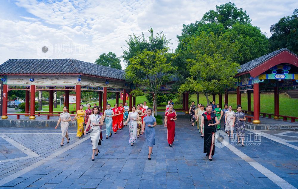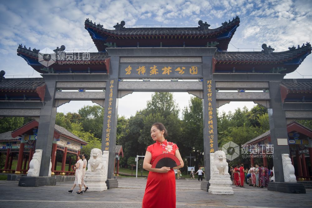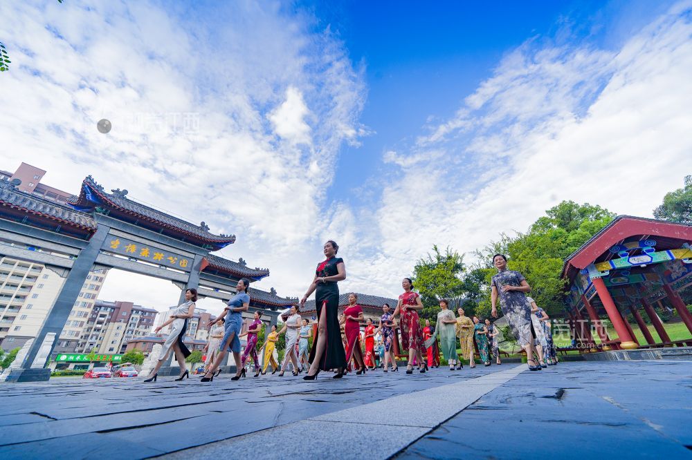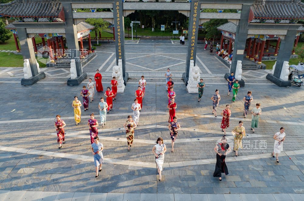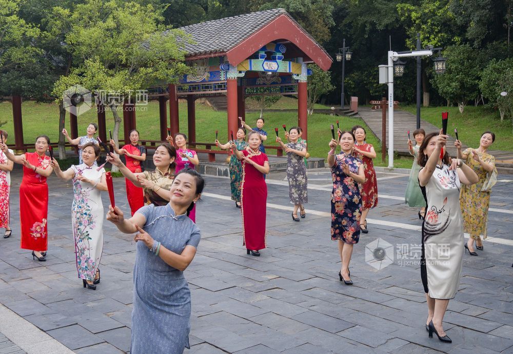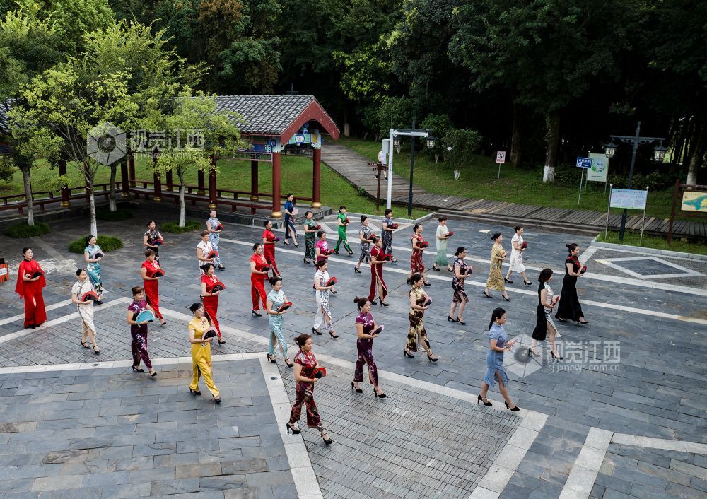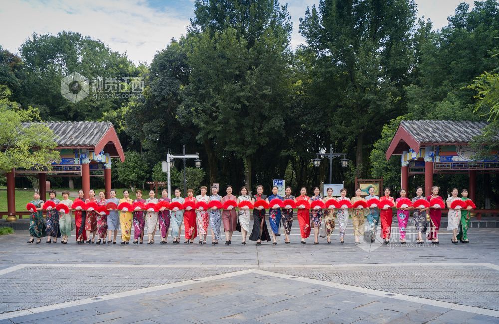 2023年8月12日早晨,江西省金溪县旗袍文化协会成员,在香樟森林公园开展常规走秀健身活动。