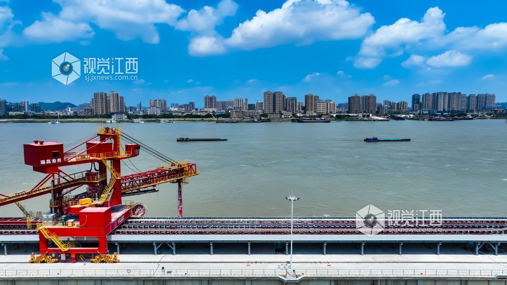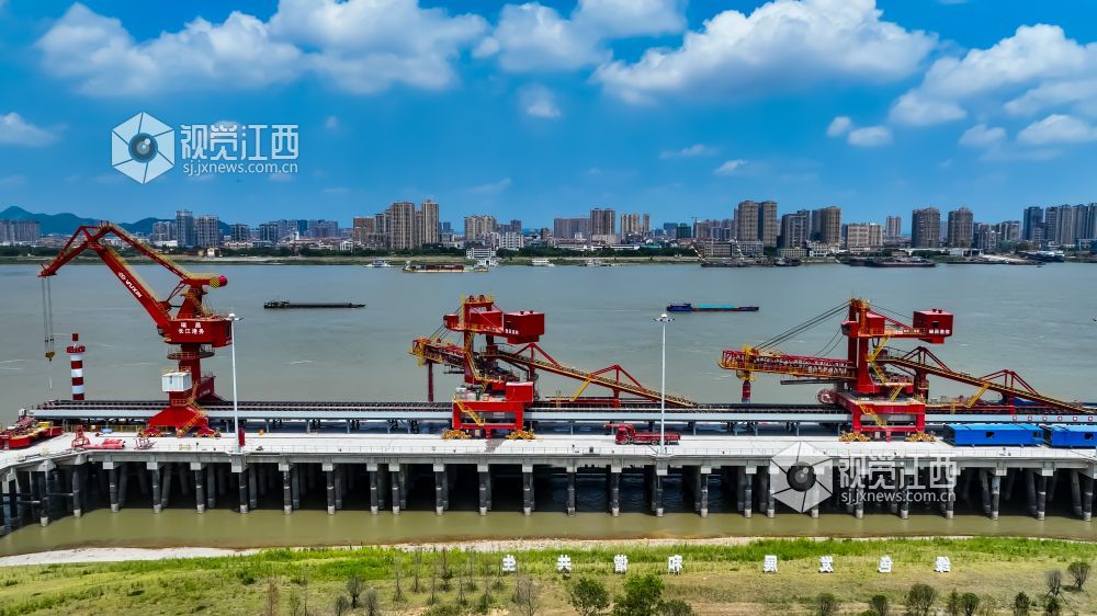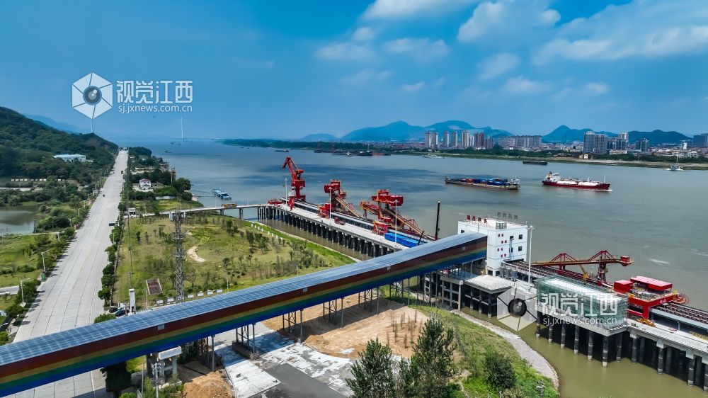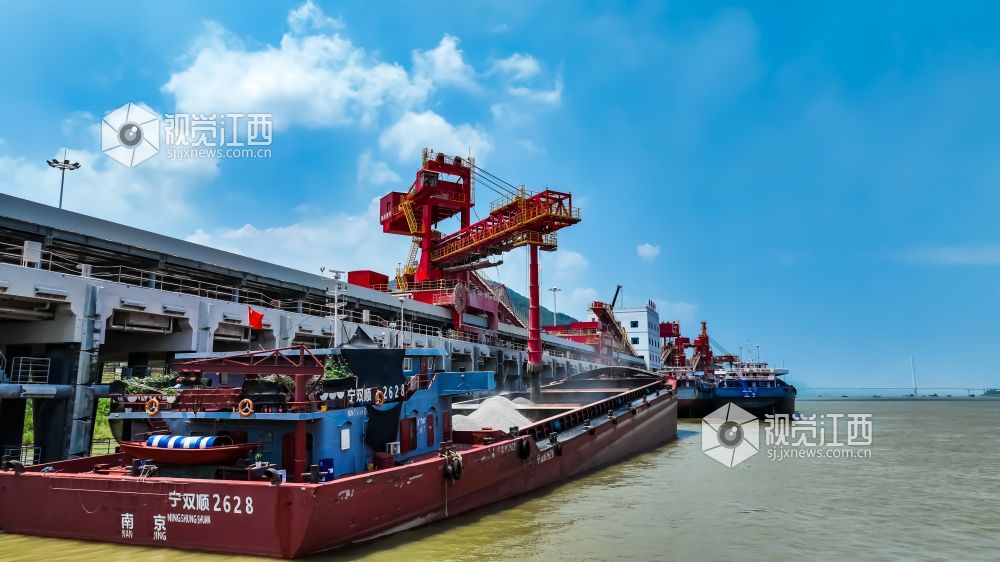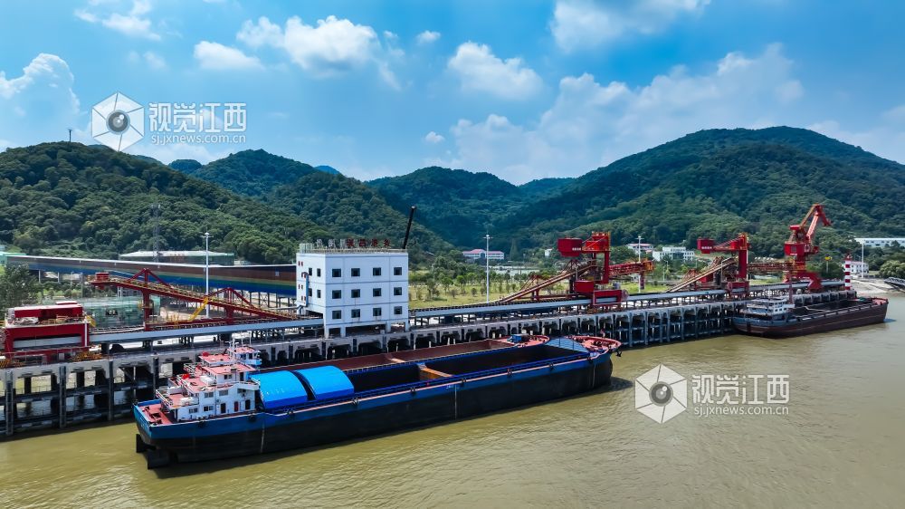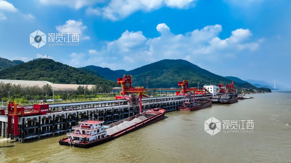 2023年8月20日,位于江西省瑞昌市码头镇的九江港瑞昌港区金丝港作业区码头,船舶在泊位上有序装卸货物,现场一派繁忙景象。