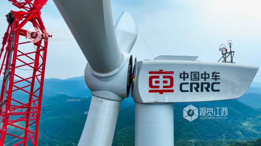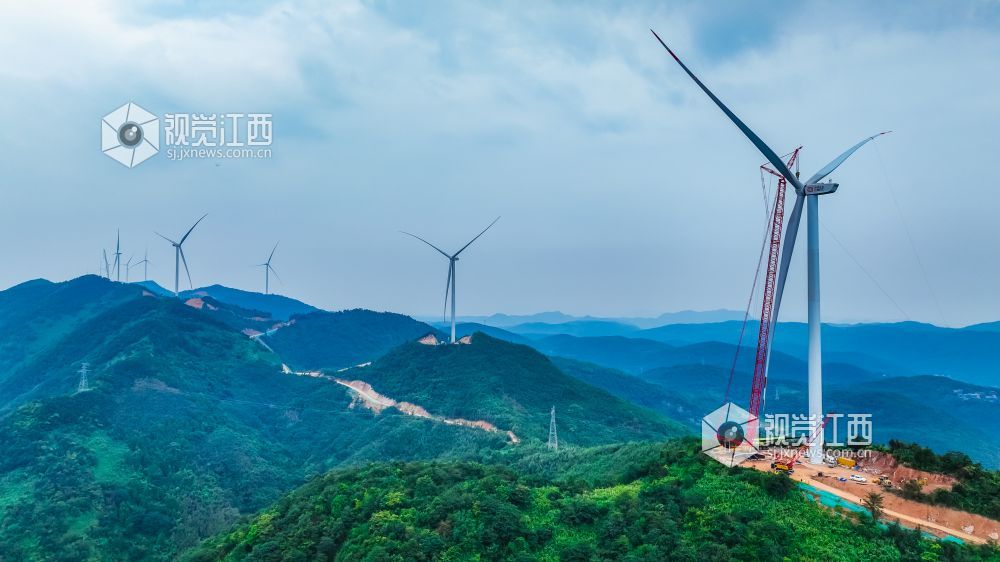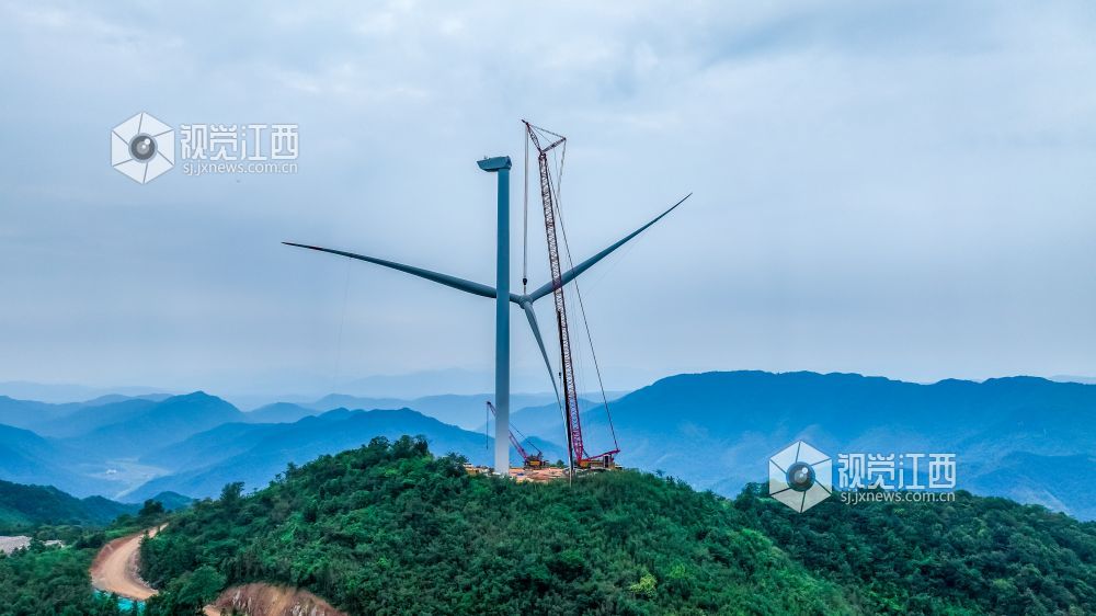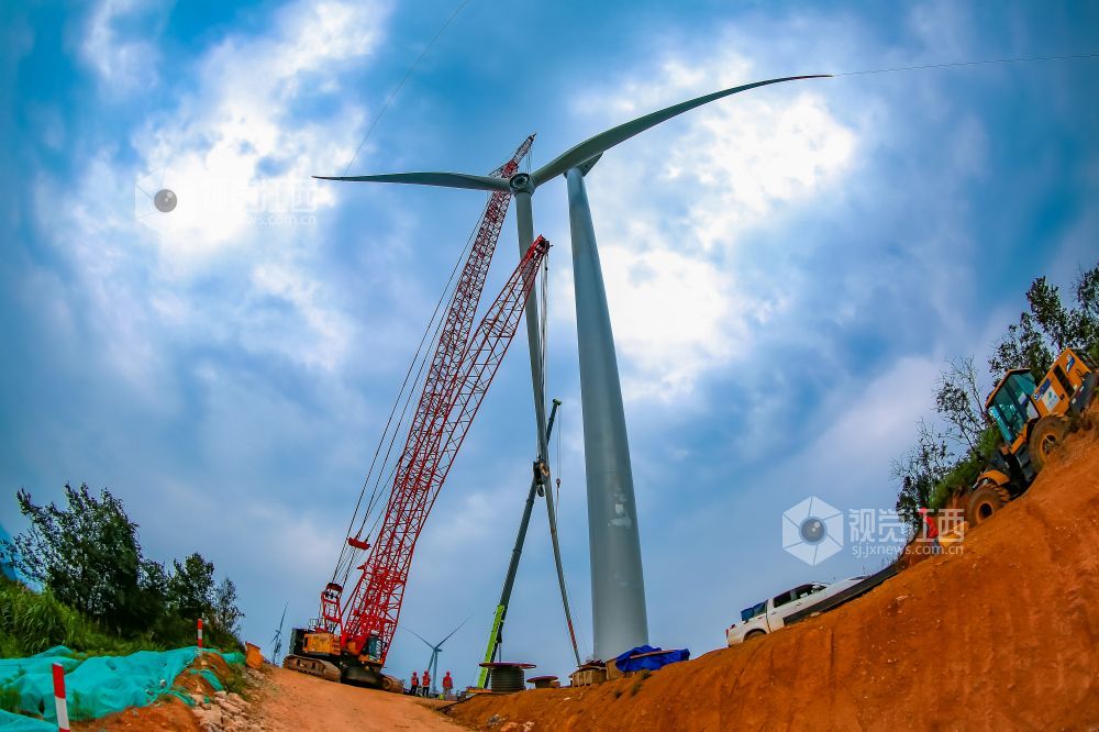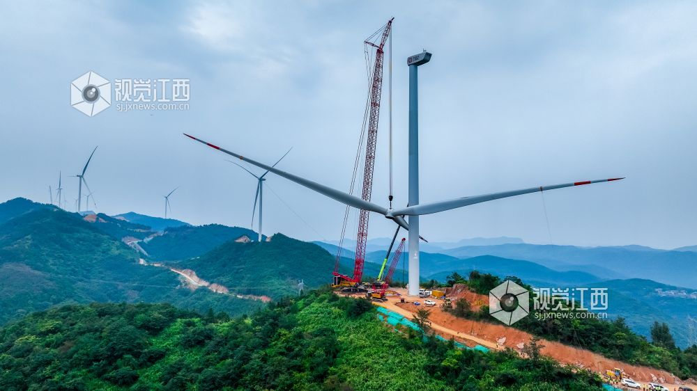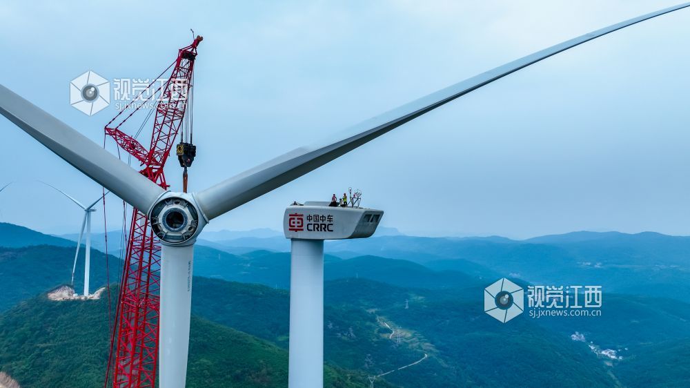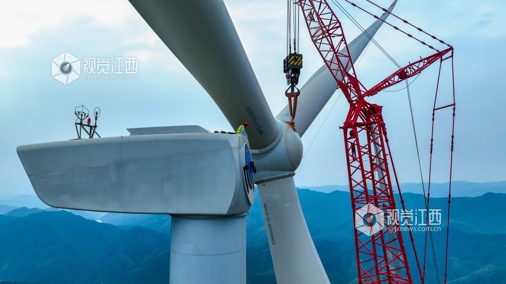 2023年8月21日,江西省瑞昌市横立山风电场项目施工现场,中国电建集团江西省水电工程局的工人们正在吊装风电叶片。