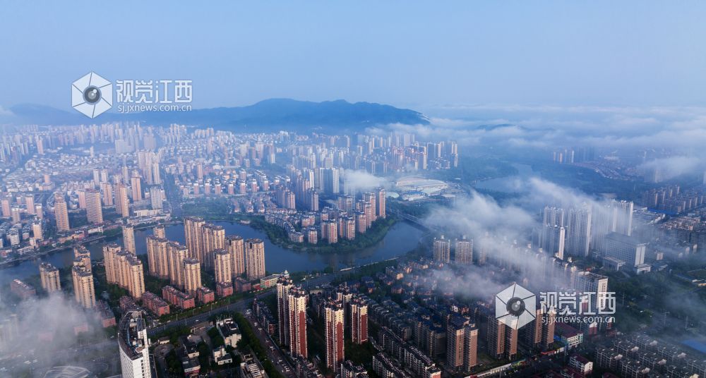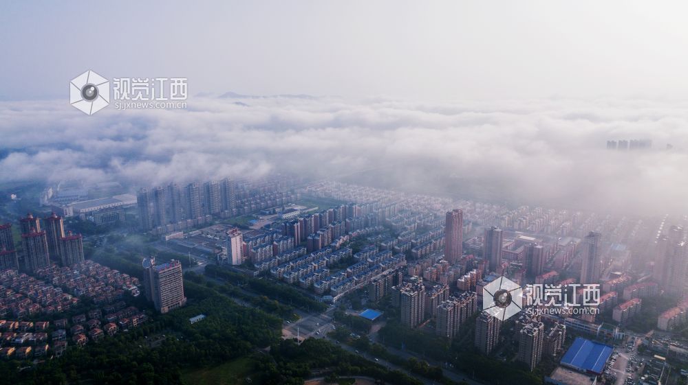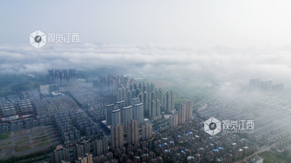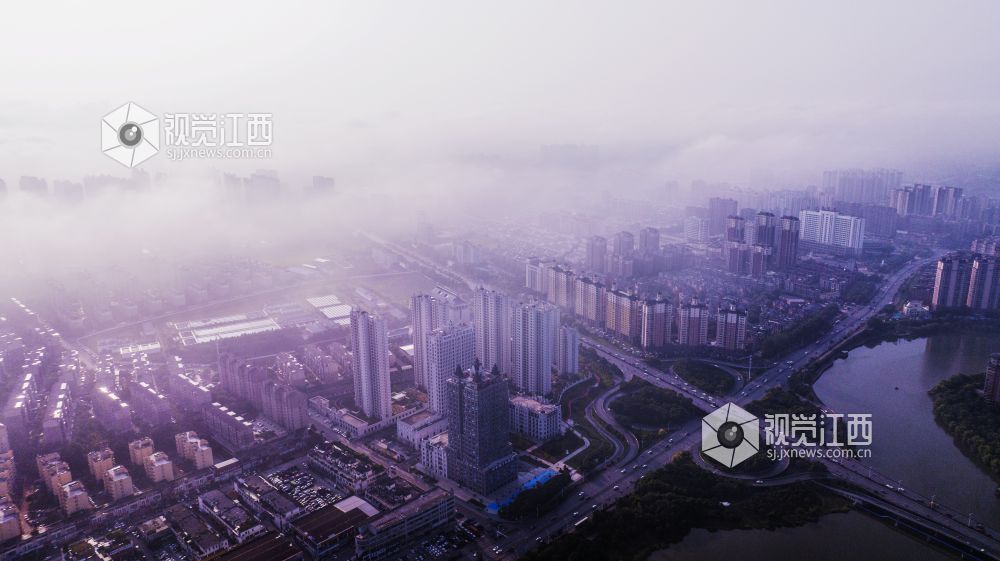 8月23日清晨, 江西新余城区上空云雾缭绕,公园、道路、河流、桥梁、房屋在云雾中忽隐忽现,如诗如画。