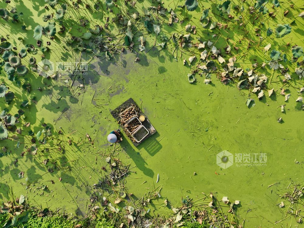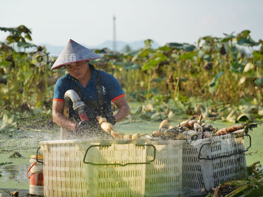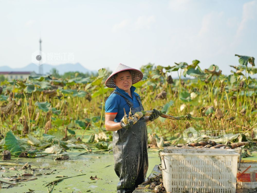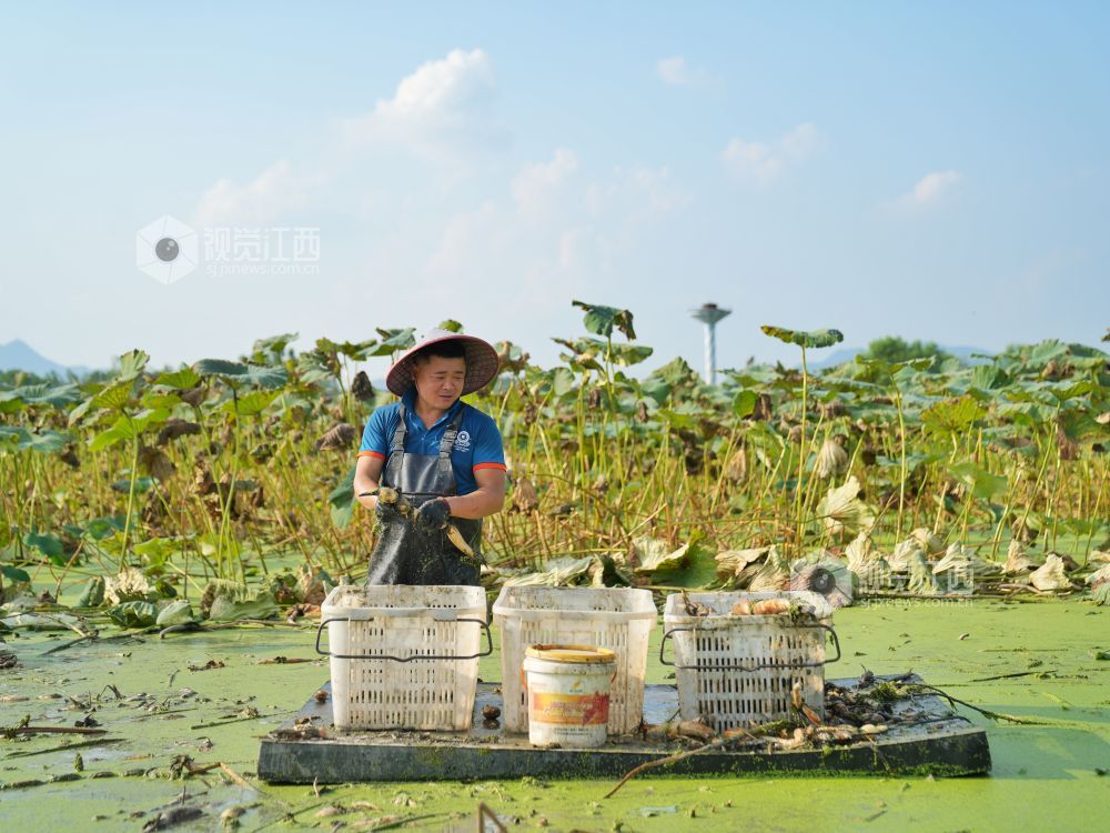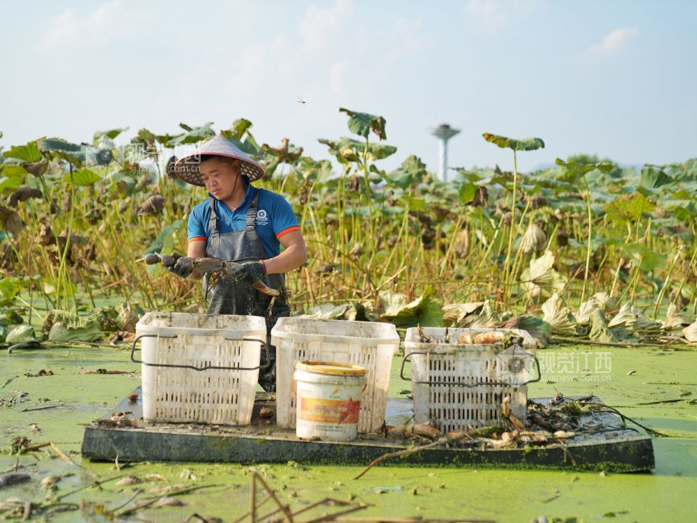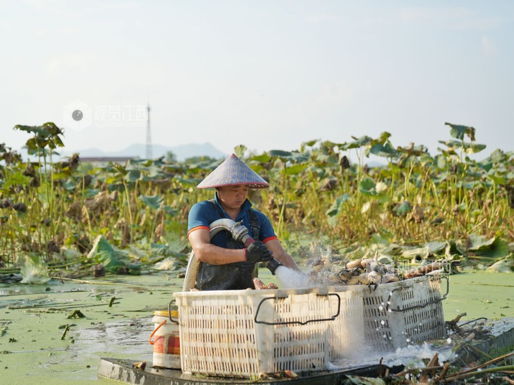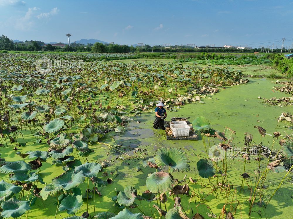 2023年8月23日,在江西省萍乡市芦溪县芦溪镇年丰村莲藕种植基地,种植户忙着采收莲藕。