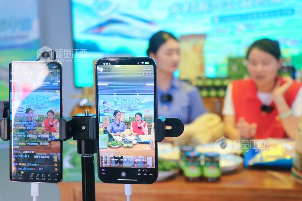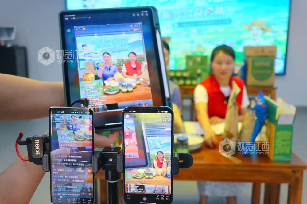 8月25日,江西省余干县鹭鸶港乡沿河村,中国铁路南昌局集团有限公司驻村工作队工作人员通过网络直播推介销售当地农特产品。