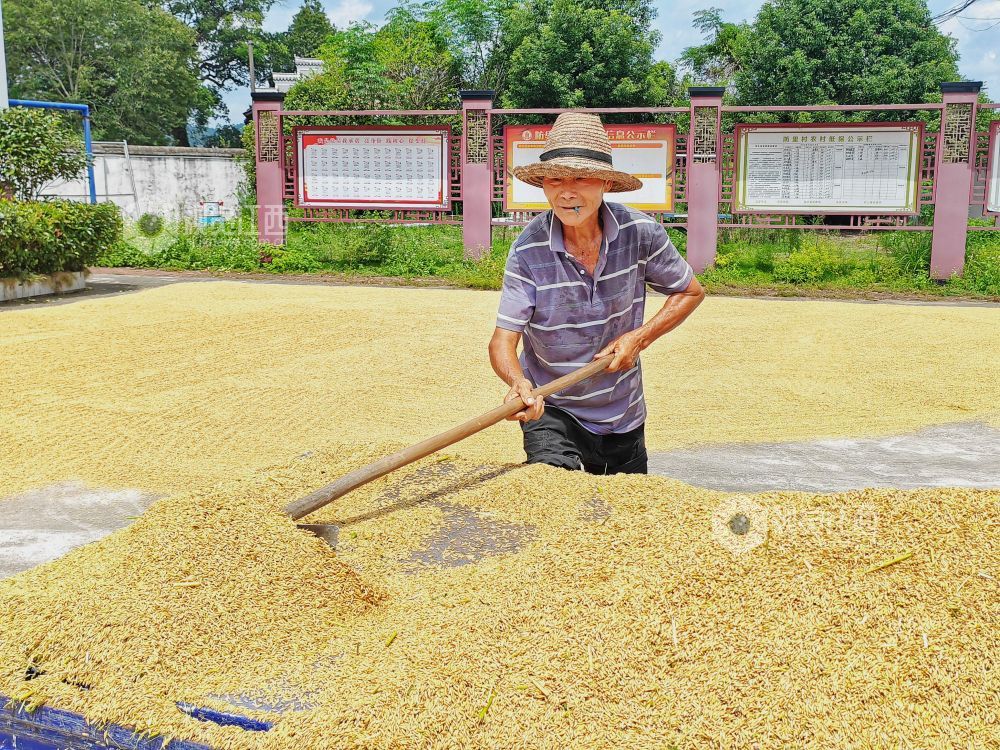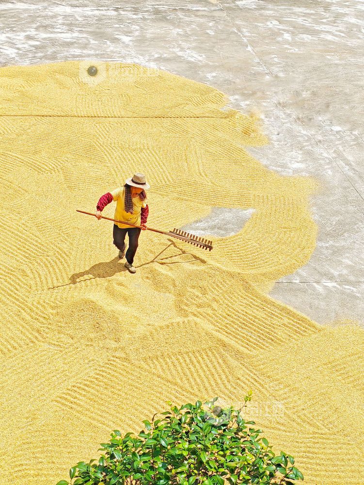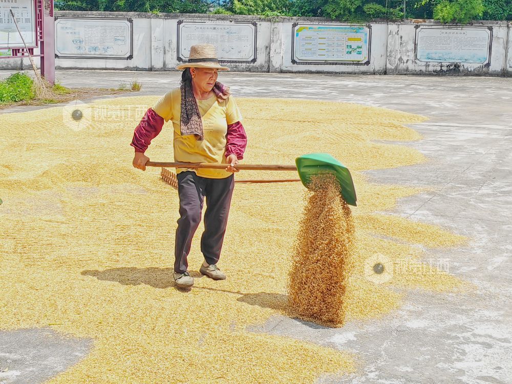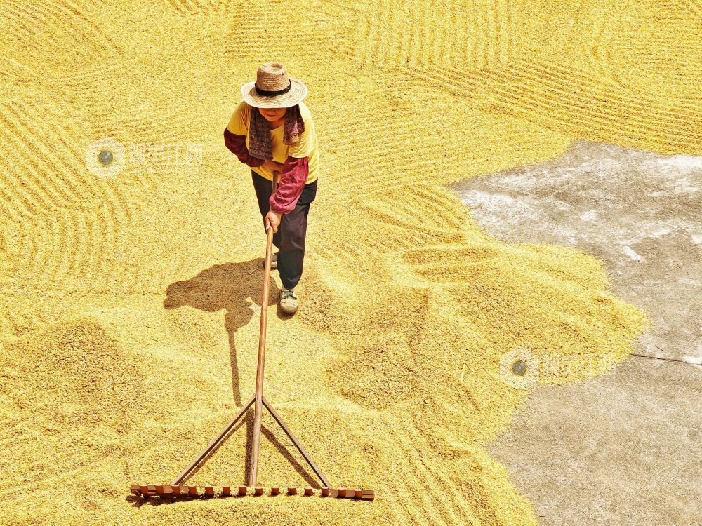 2023年8月26日,农户正在江西省分宜县钤山镇防里村空阔地晾晒稻谷。眼下,分宜县各地正值稻谷成熟收获季节,农户们纷纷抓住晴好天气,把秋收下的稻谷铺在晾晒场上晾晒,形成一幅美丽的金秋晒谷图。