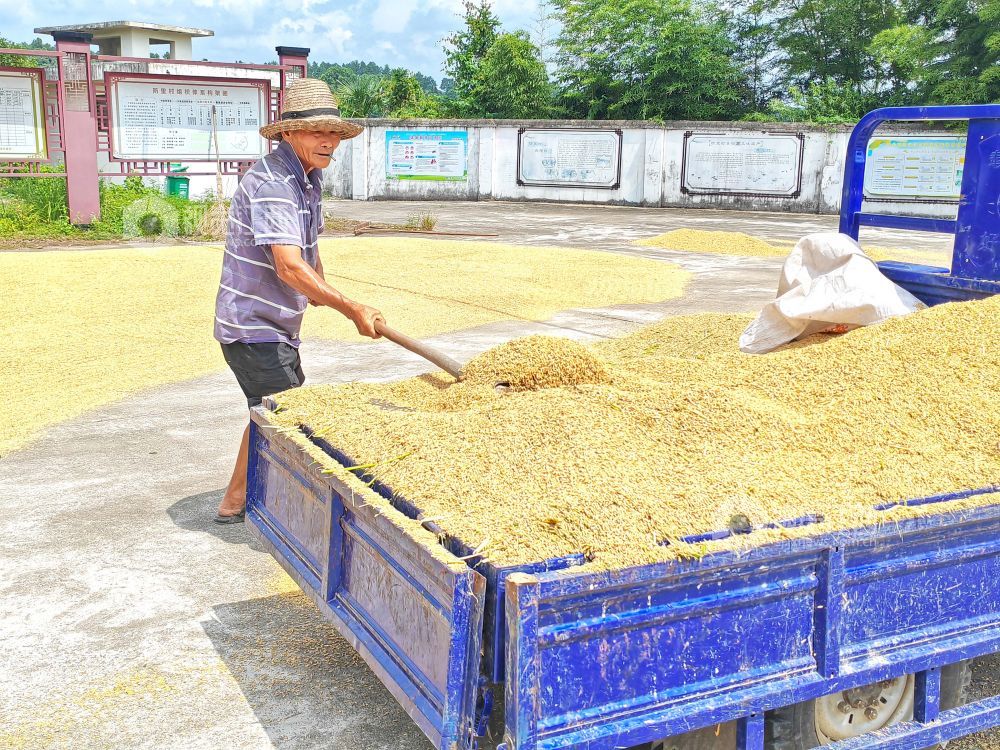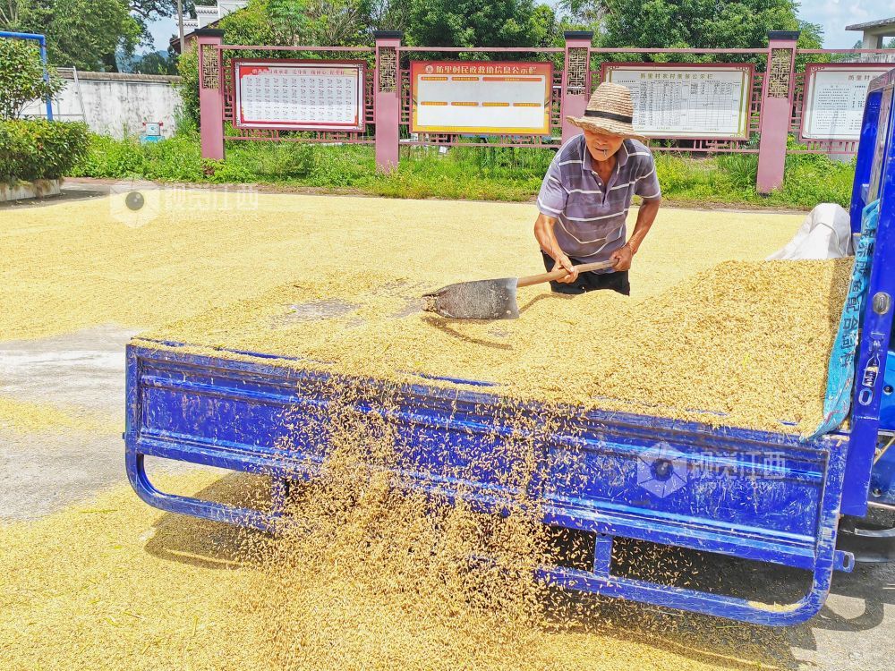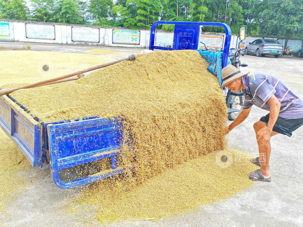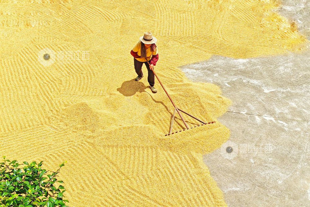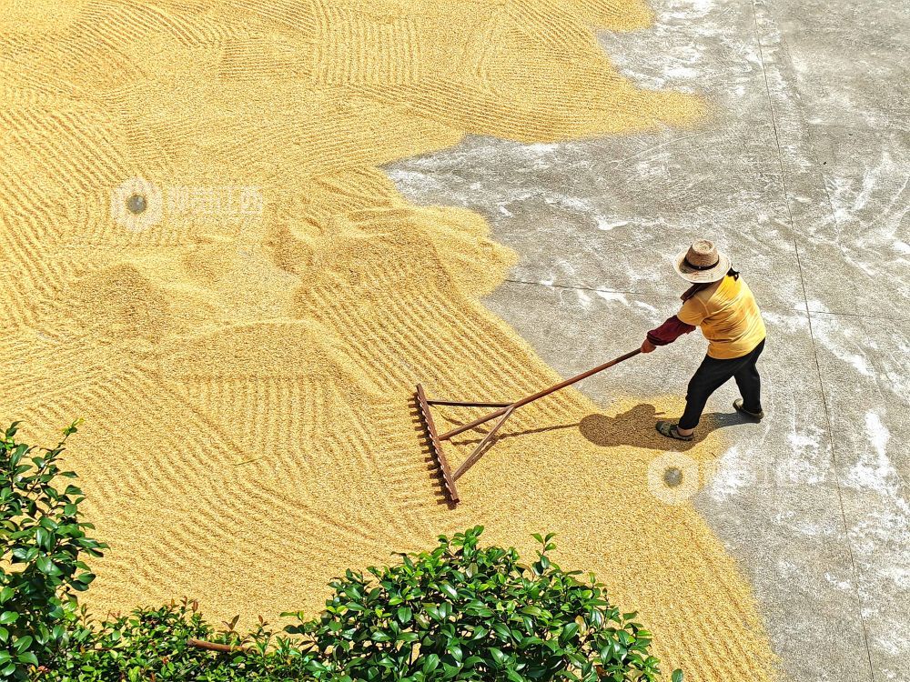 2023年8月26日,农户正在江西省分宜县钤山镇防里村空阔地晾晒稻谷。眼下,分宜县各地正值稻谷成熟收获季节,农户们纷纷抓住晴好天气,把秋收下的稻谷铺在晾晒场上晾晒,形成一幅美丽的金秋晒谷图。