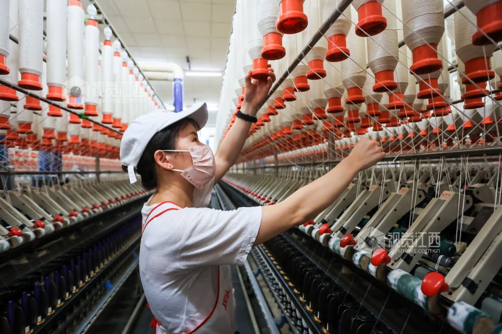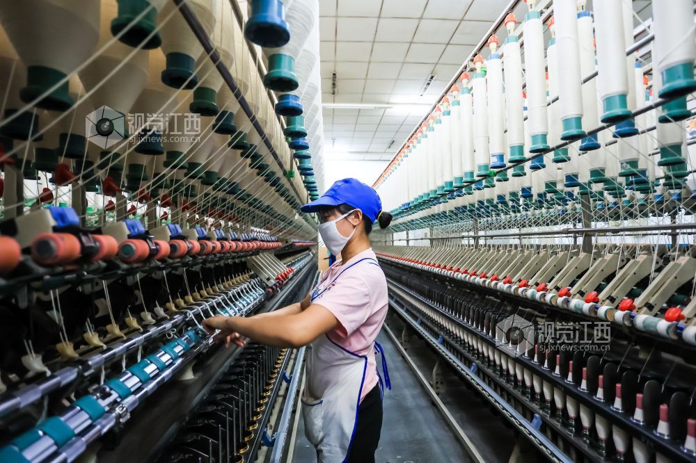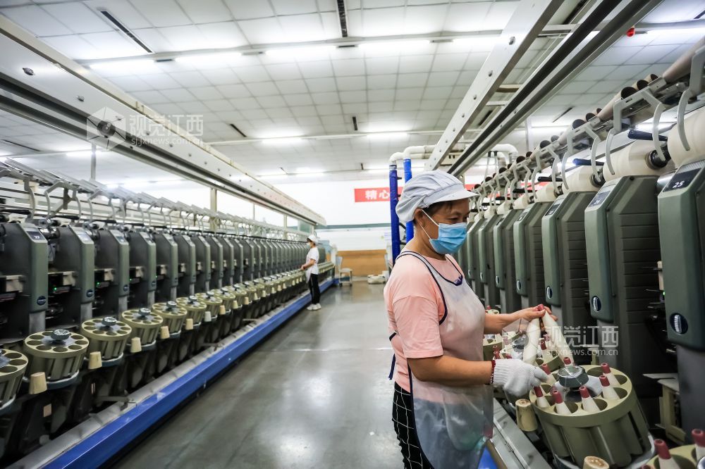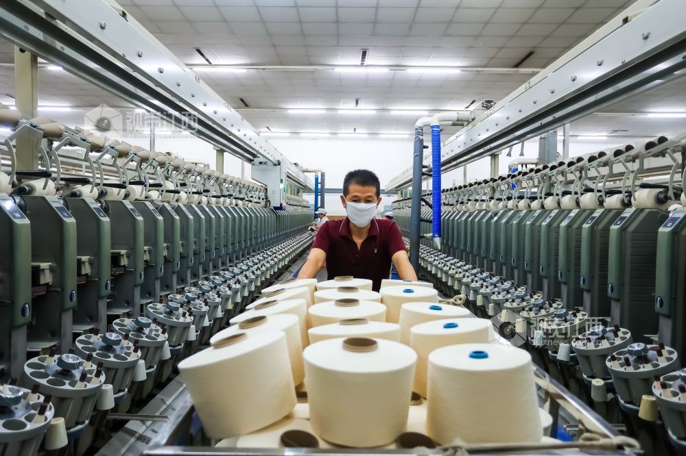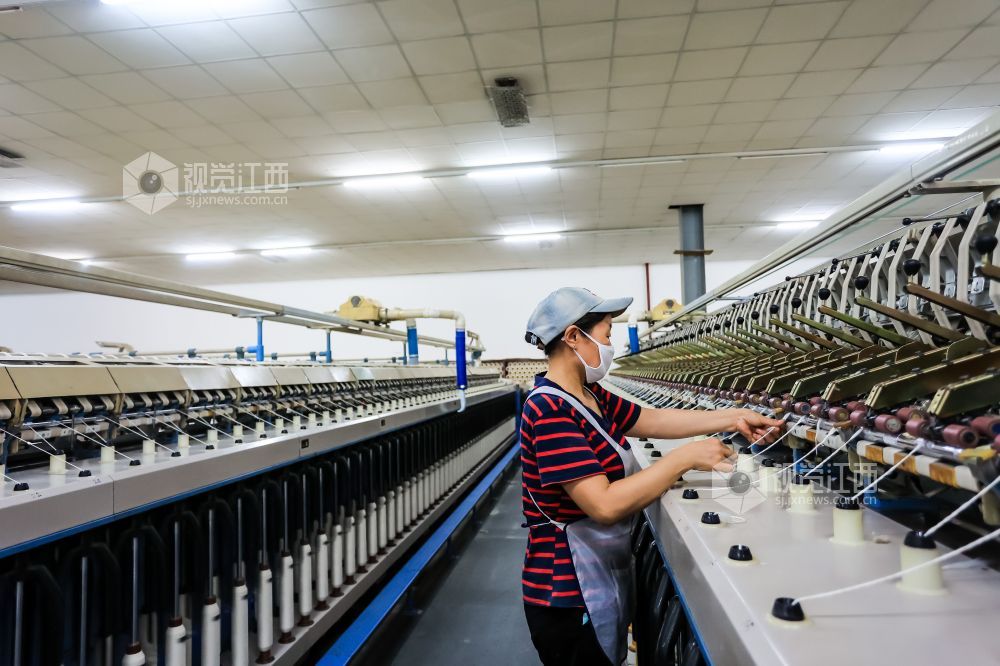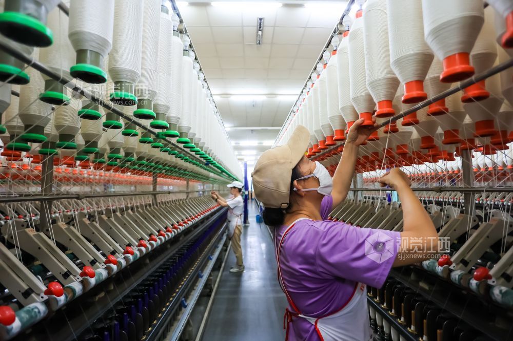 2023年8月30日,江西省瑞昌市经开区江西凤竹棉纺有限公司车间内,纺织工人在生产线上赶制订单。