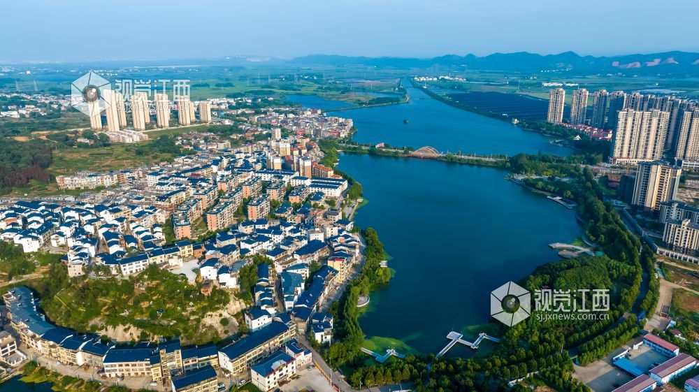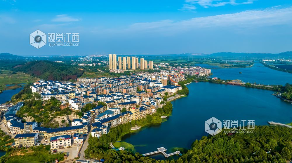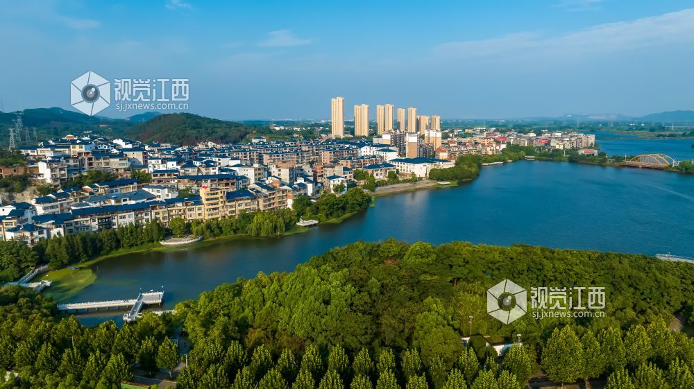 2023年8月30日,江西省瑞昌市安定湖省级湿地公园蓝天碧水、绿树成荫,与多彩的建筑群构成一幅和谐美丽的生态画卷。