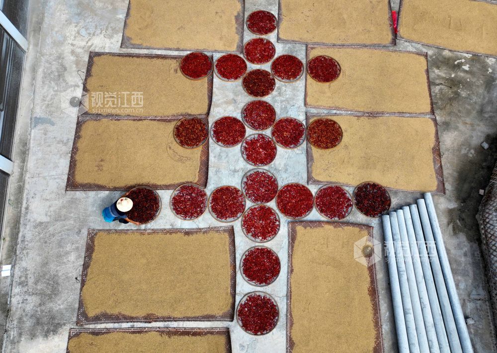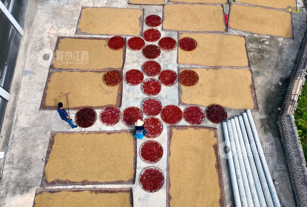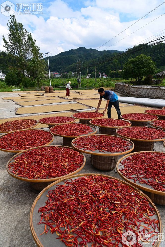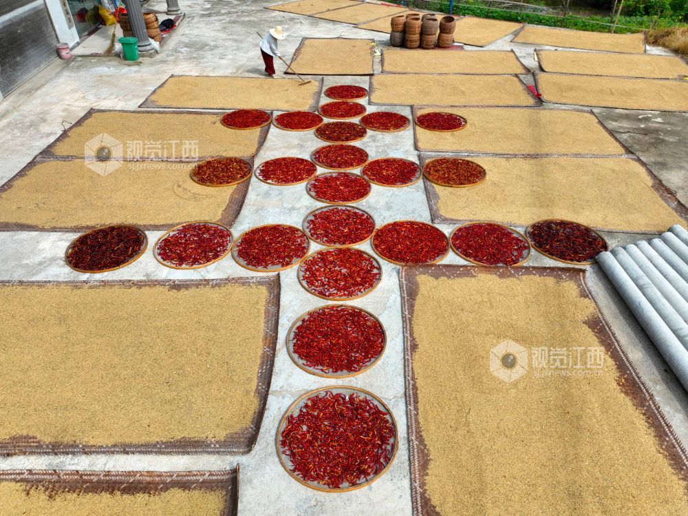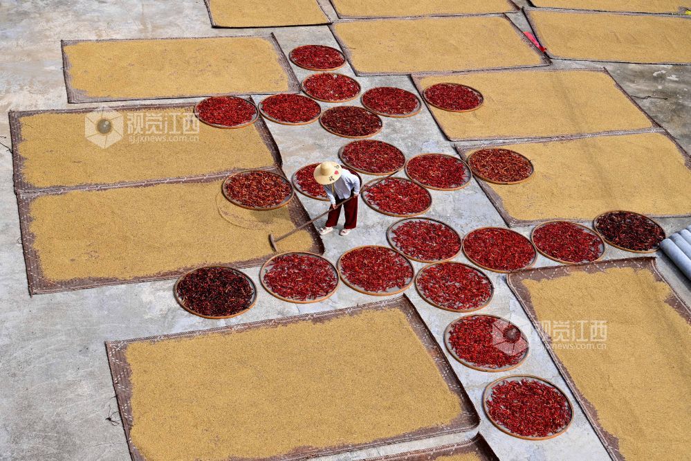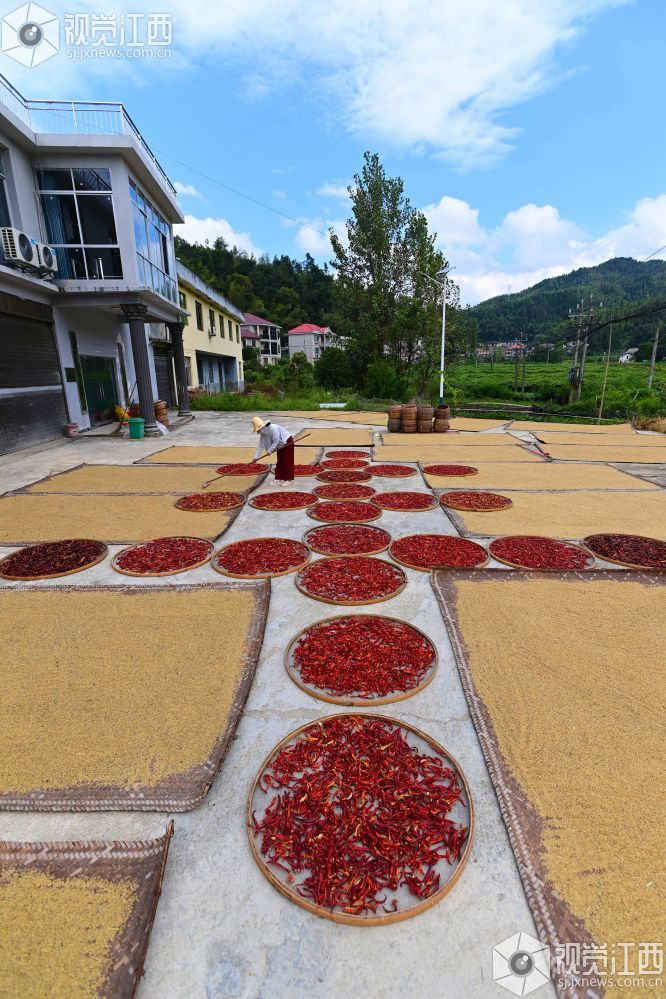 金秋时节,在江西省宜春市万载县茭湖乡谢溪村,农民抢抓晴好天气,加紧晾晒红辣椒、稻谷等秋收作物,到处呈现出喜气洋洋的丰收景象。