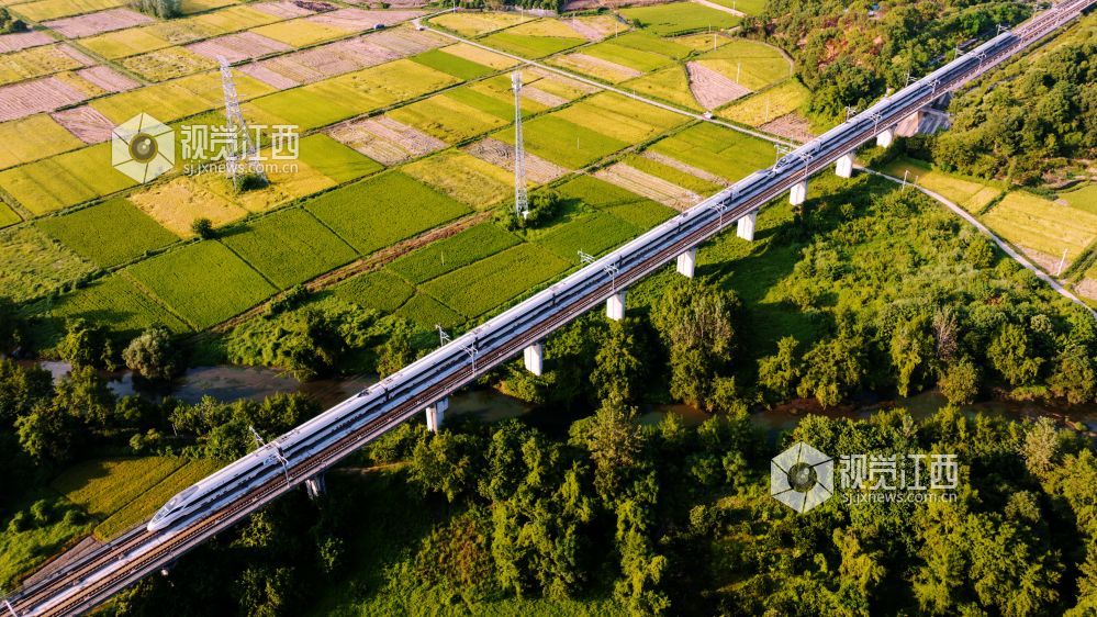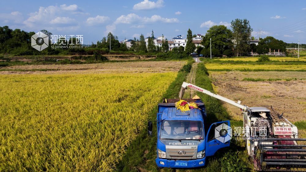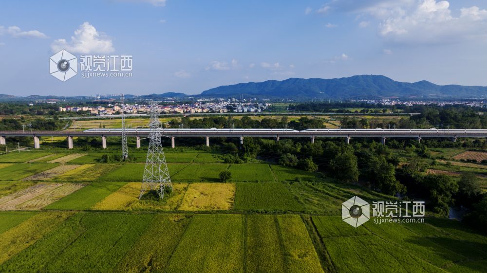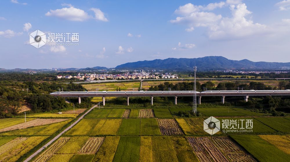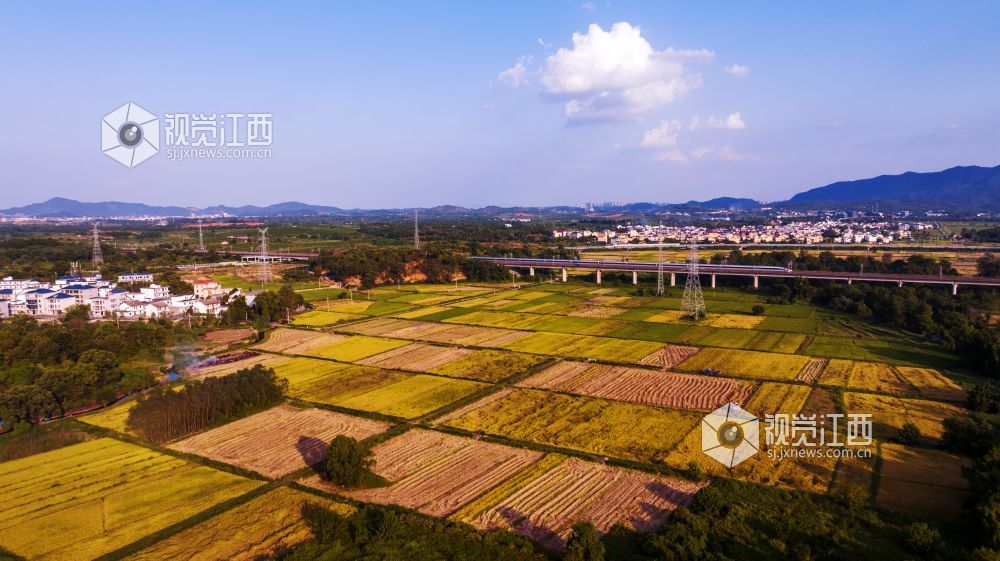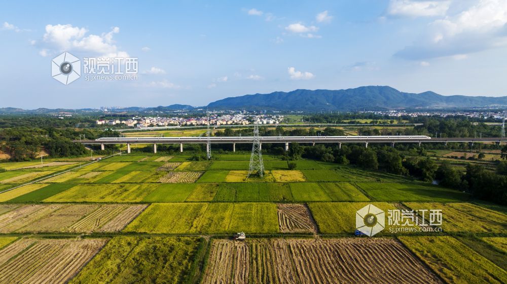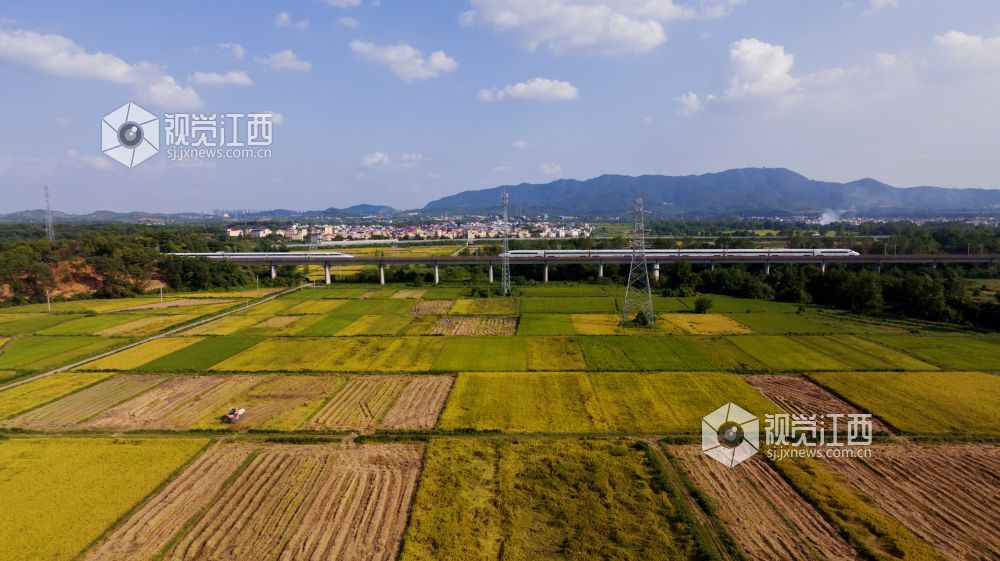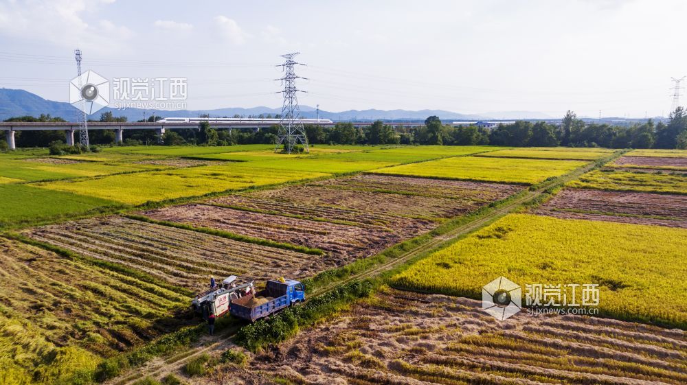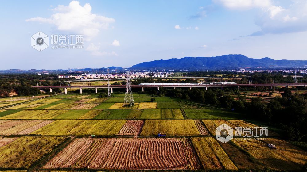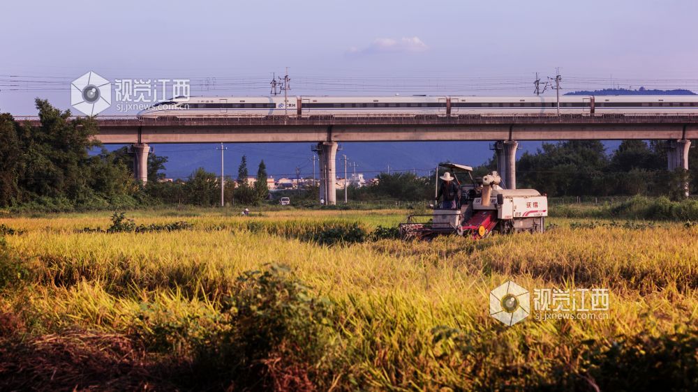9月9日,在江西省新余市仙女湖区观巢镇沪昆高速铁路两旁,田野一片金黄,稻浪十里飘香,收割机在田野里来回穿梭,机声隆隆,此起彼伏,村民们正抢抓晴好天气收割水稻,一辆辆高速列车在金色稻田上往来穿梭,组成了一幅新时代、新农村的美丽丰收画卷。