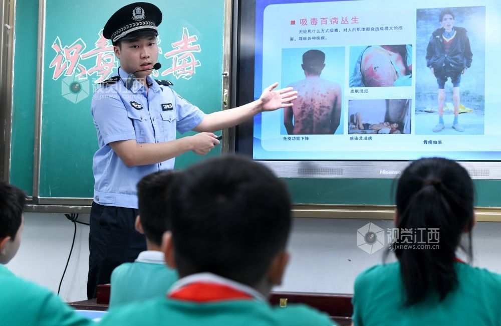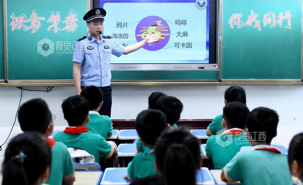据了解,这是江西省德兴市公安局泗洲派出所为抓好少年儿童毒品预防教育,营造健康良好的禁毒环境,特邀市公安局禁毒大队民警来到该市泗洲镇潭埠中心小学开展“识毒禁毒 你我同行”知识宣讲活动。