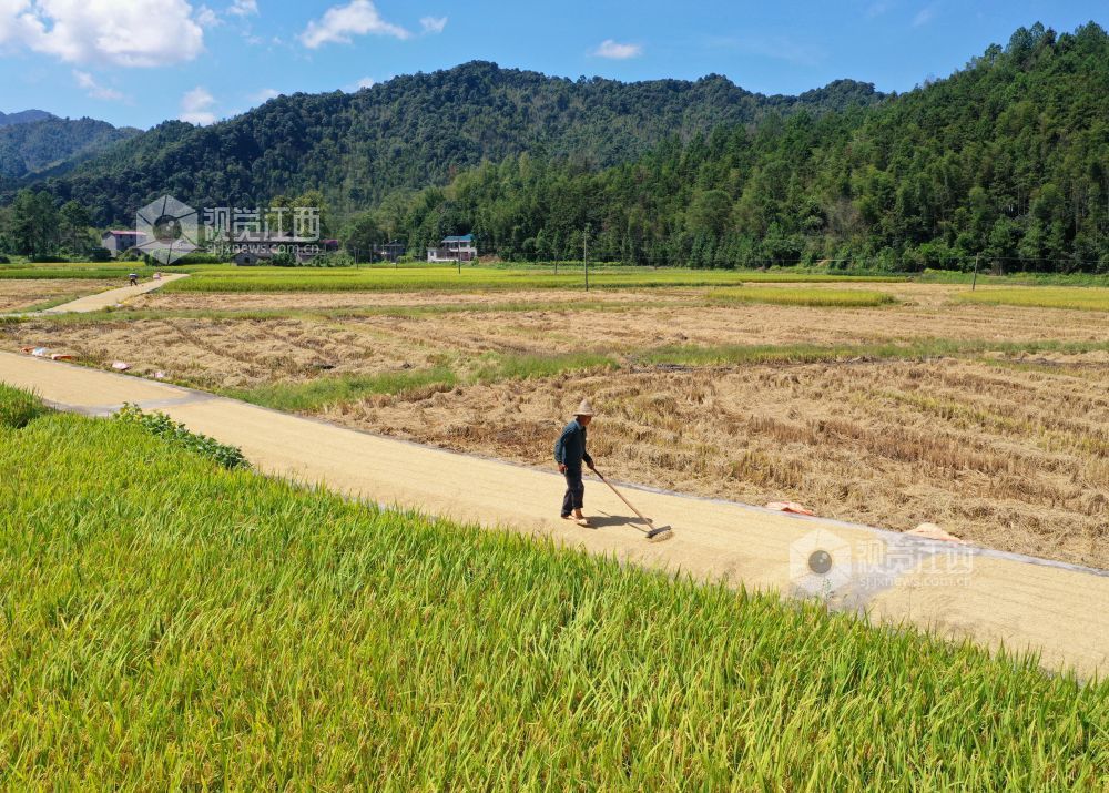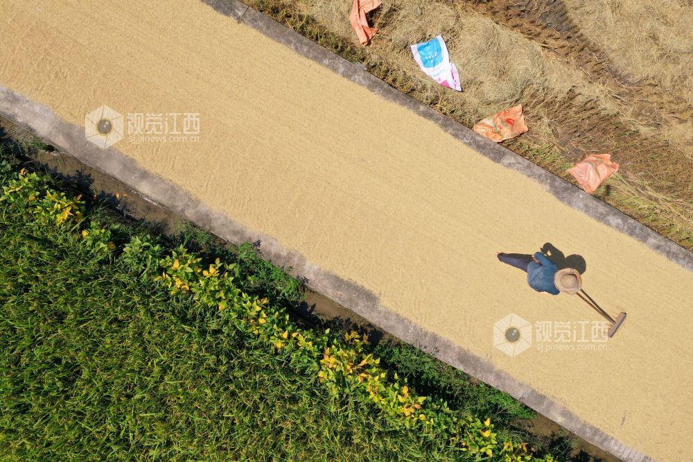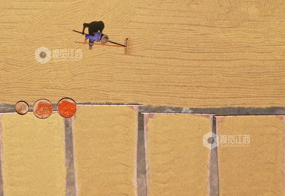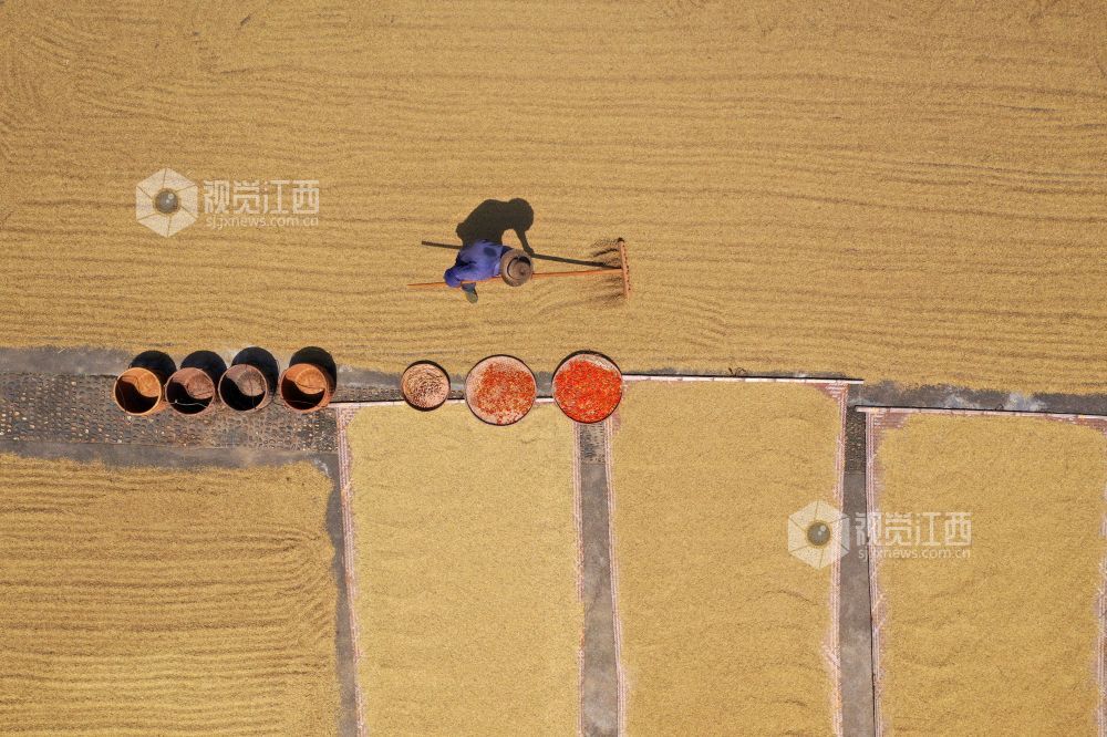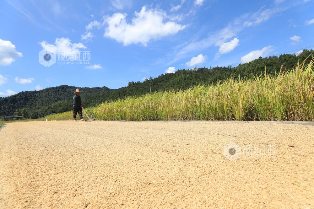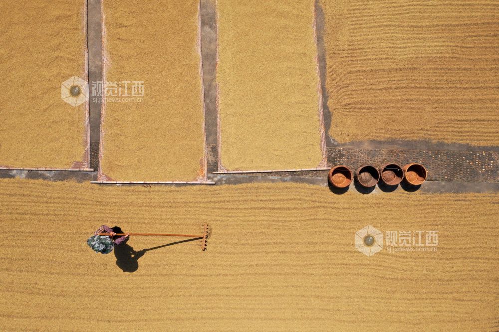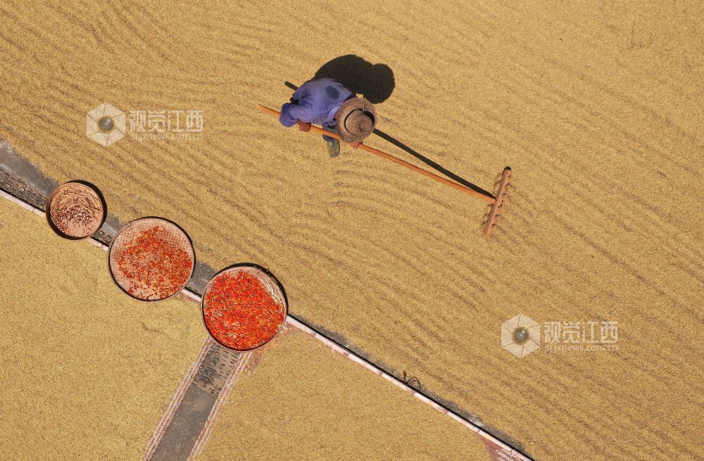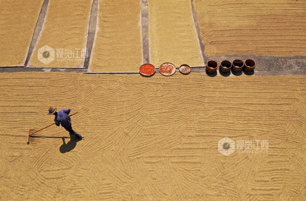 9月18日,江西省吉安市泰和县桥头镇,农民正在晾晒稻谷。秋收时节,泰和县中稻喜获丰收,农民抢抓农时收割,及时晾晒,确保颗粒归仓。