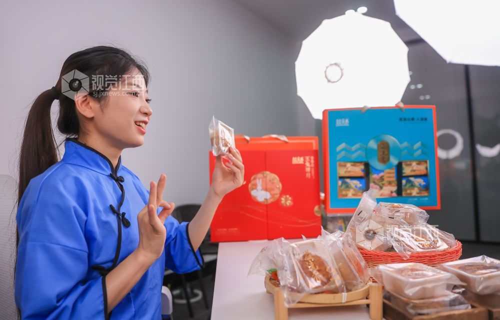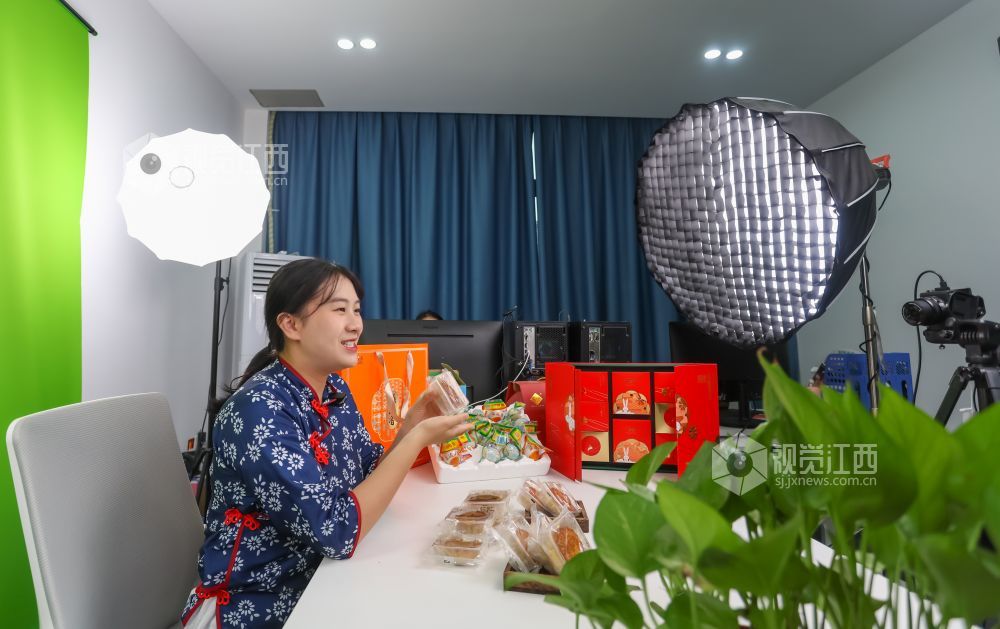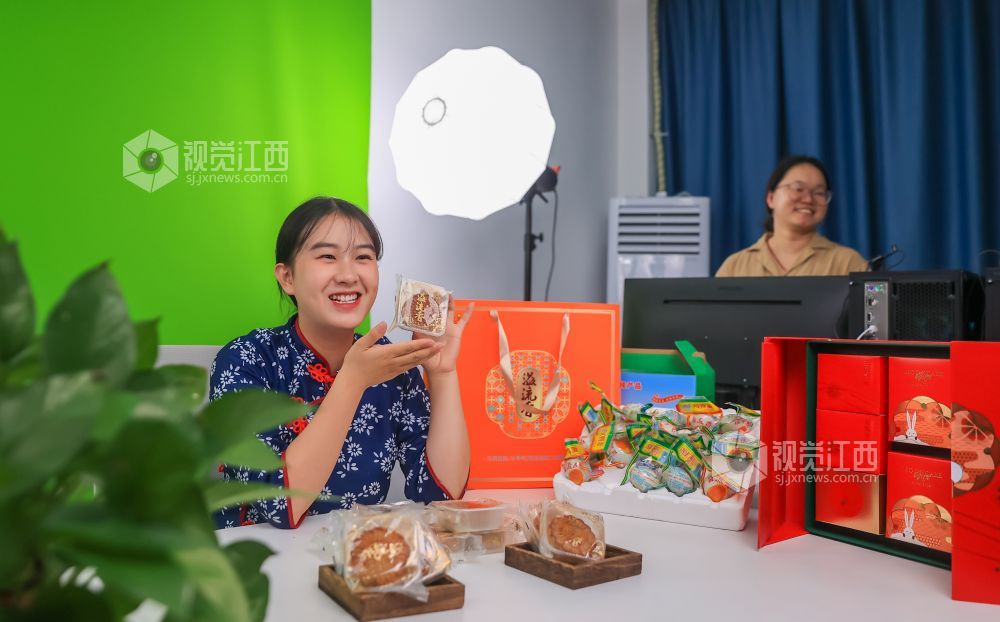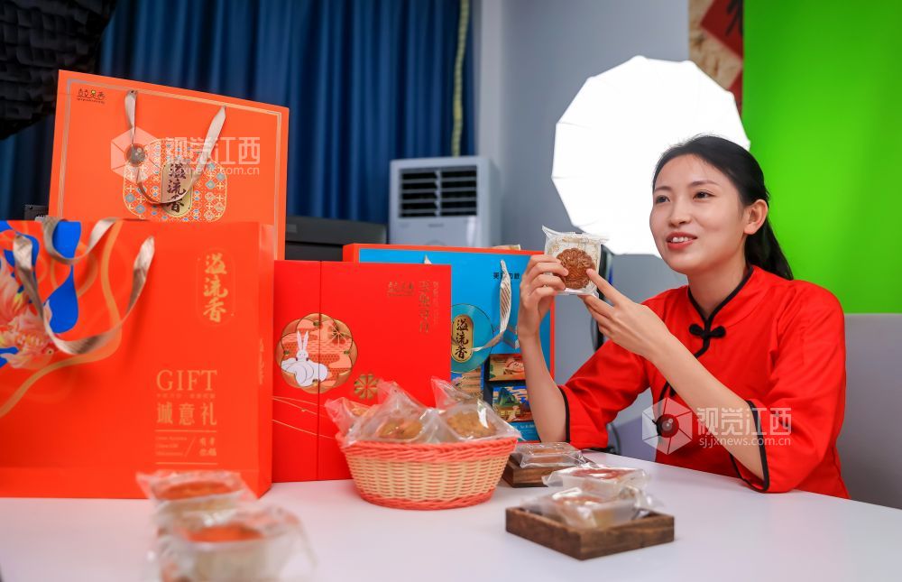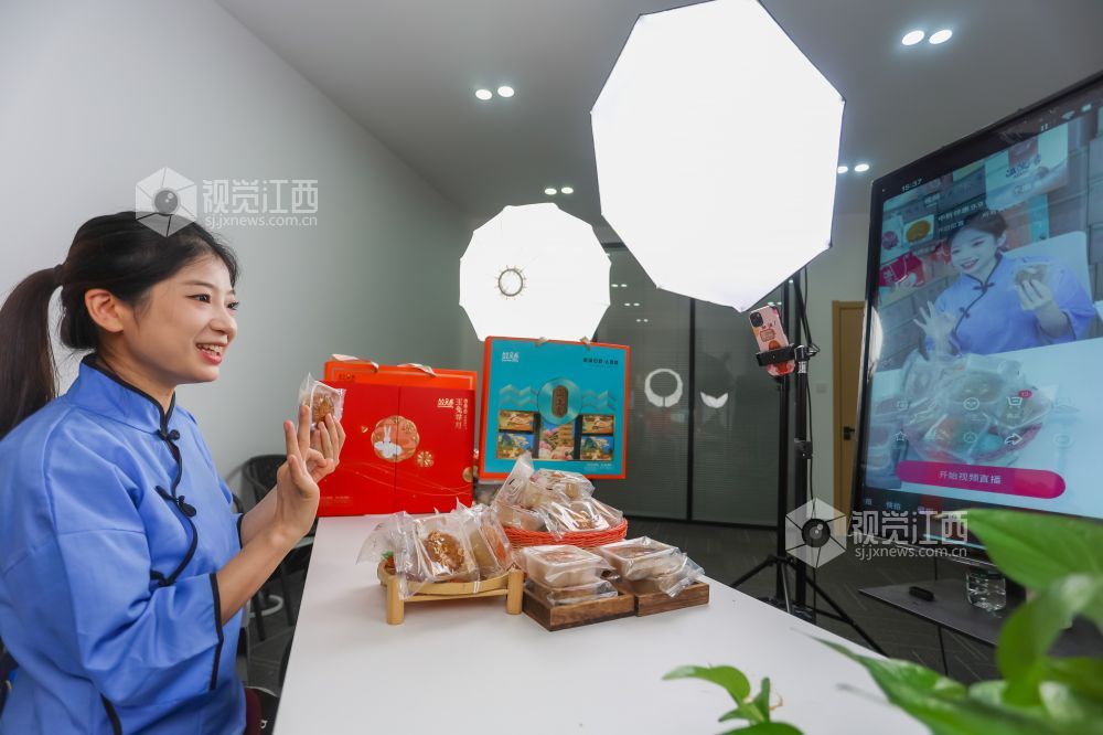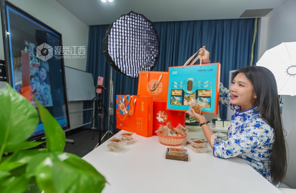 2023年9月20日,江西省瑞昌市乡村振兴电商中心直播间内,主播正在向客户推介月饼。