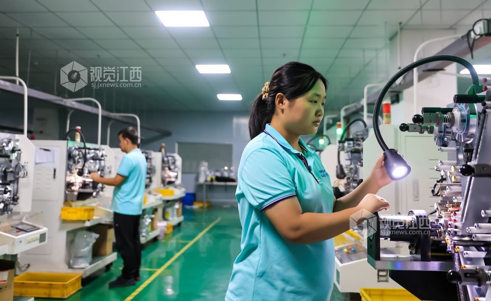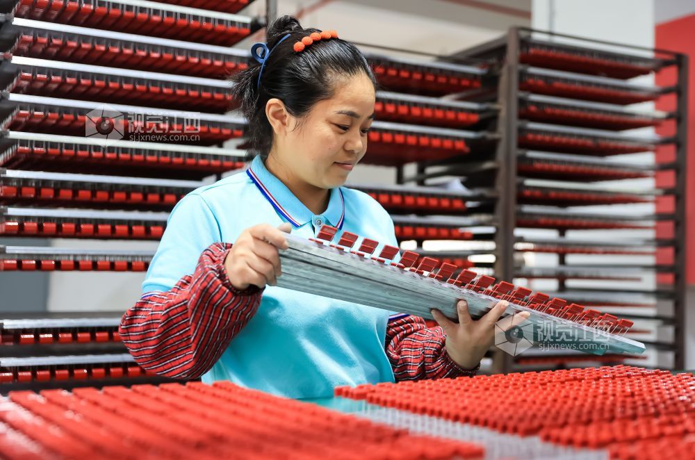 2023年9月21日,江西省瑞昌经开区智造小镇江西泰容电子科技有限公司车间内,工人在生产线上赶制订单。