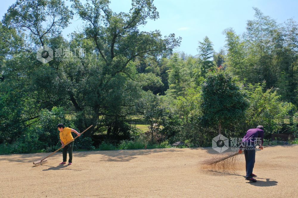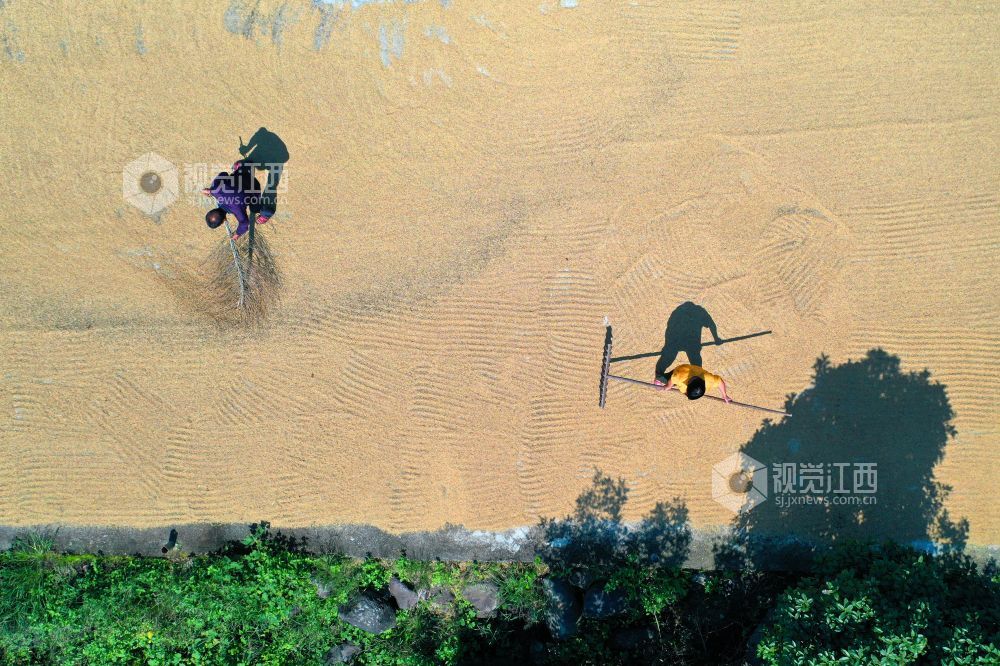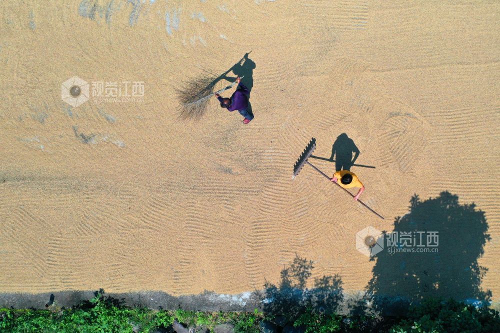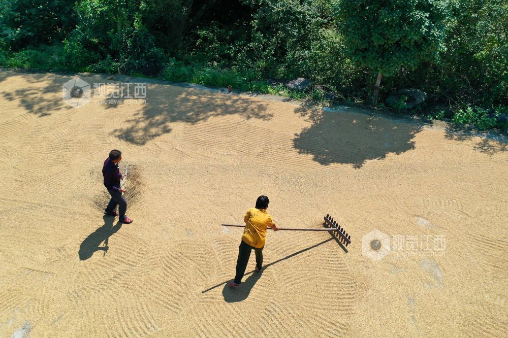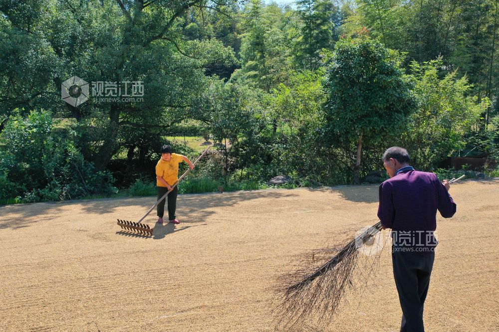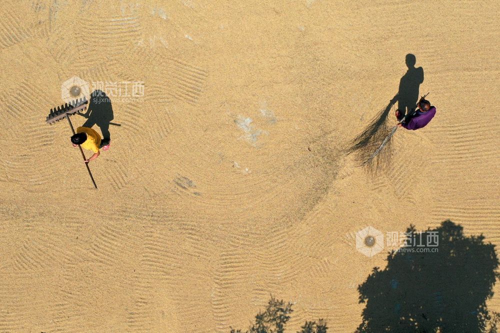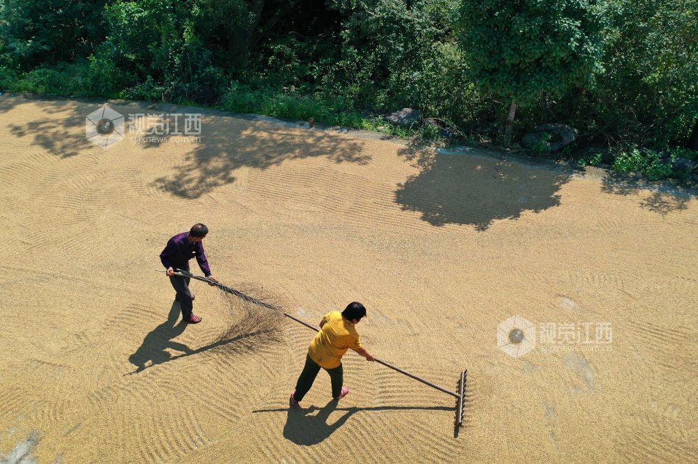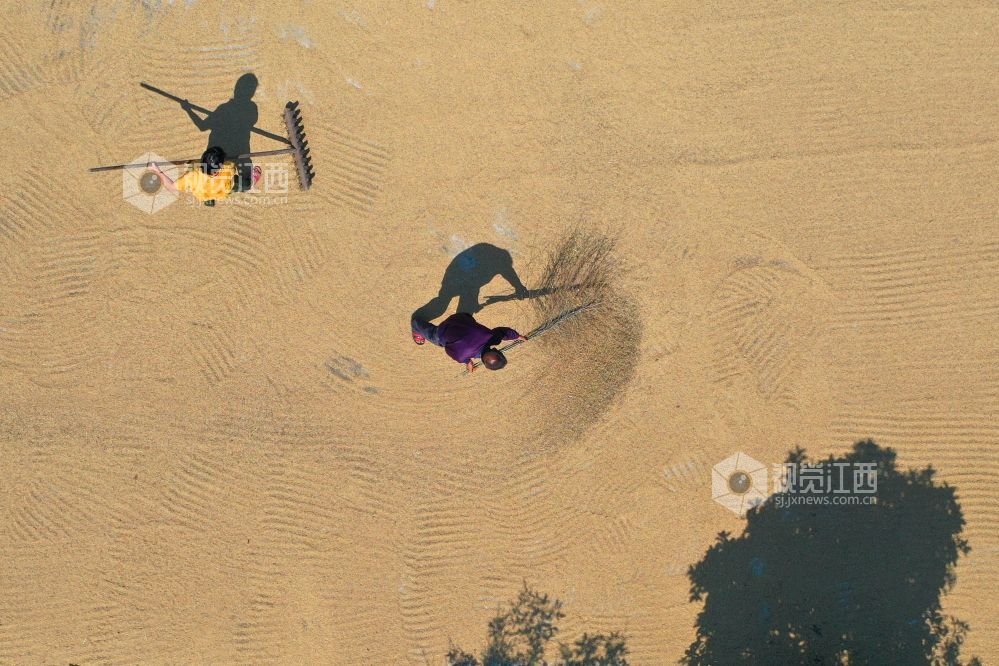 2023年10月5日,江西省宜春市上高县锦江镇钟家渡村村民正在晾晒稻谷。
