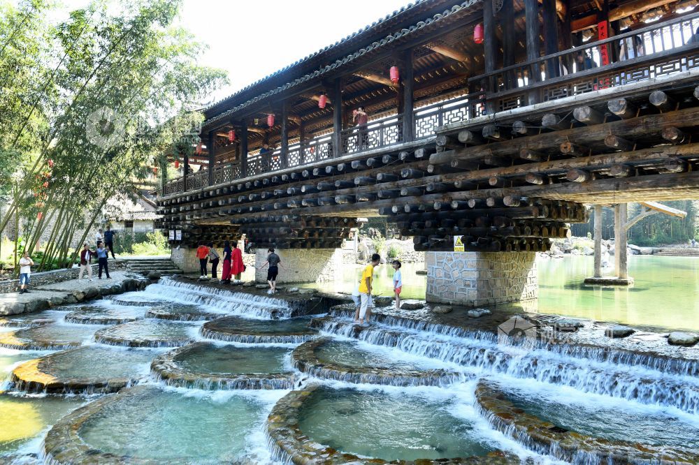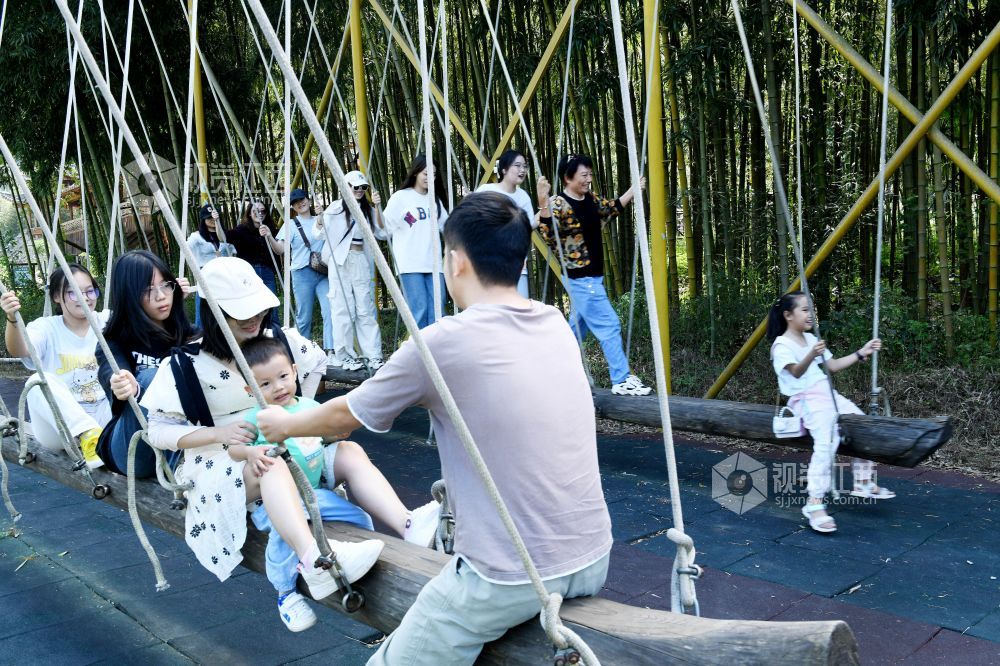 2023年10月5日,游客在江西省德兴市龙头山隐居“石头部落”景区开心游玩。