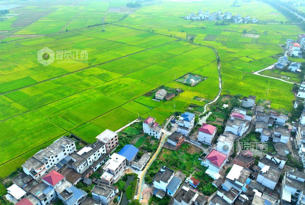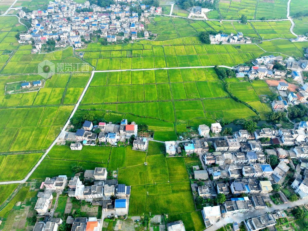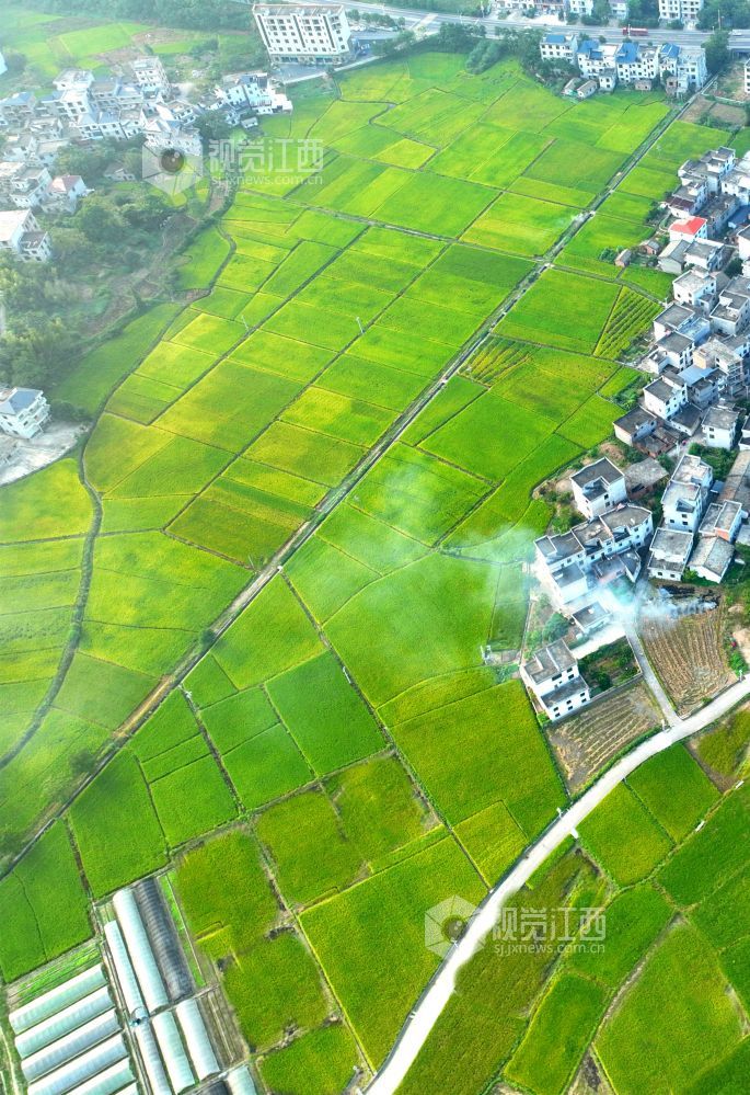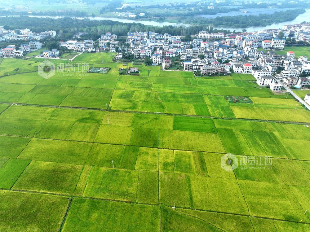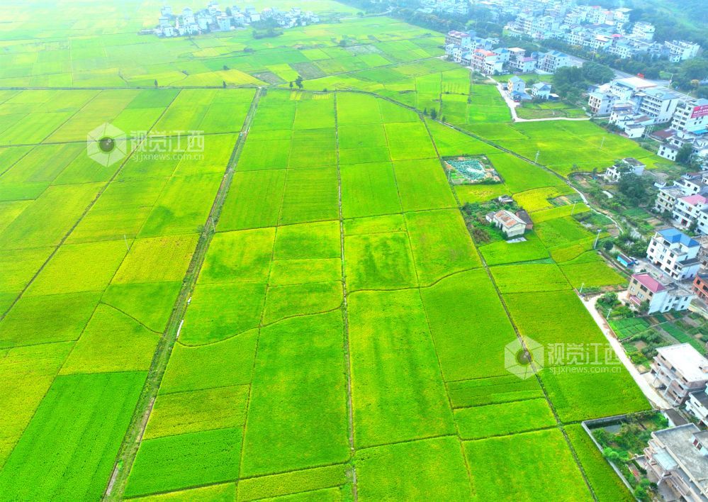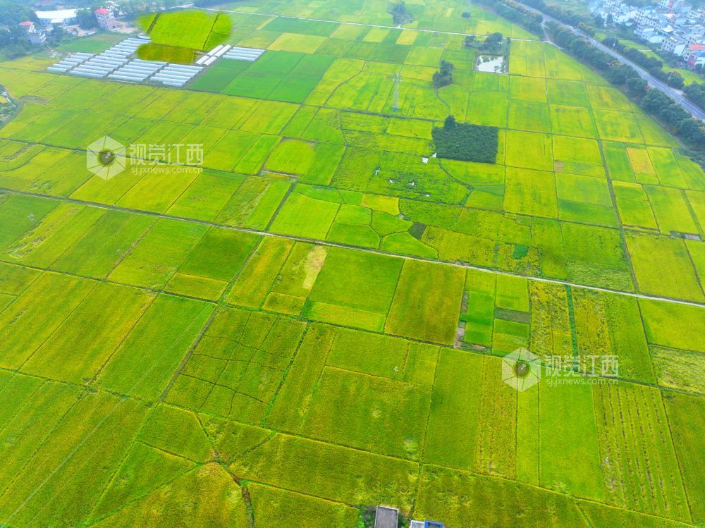 2023年10月7日,在江西省遂川县枚江镇从空中俯瞰,阡陌纵横,田畴似锦,黄绿相间的田野与村庄交相辉映,构成一幅醉人的乡村田园画卷,谱写着秋天的绚丽色彩。