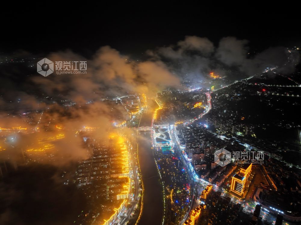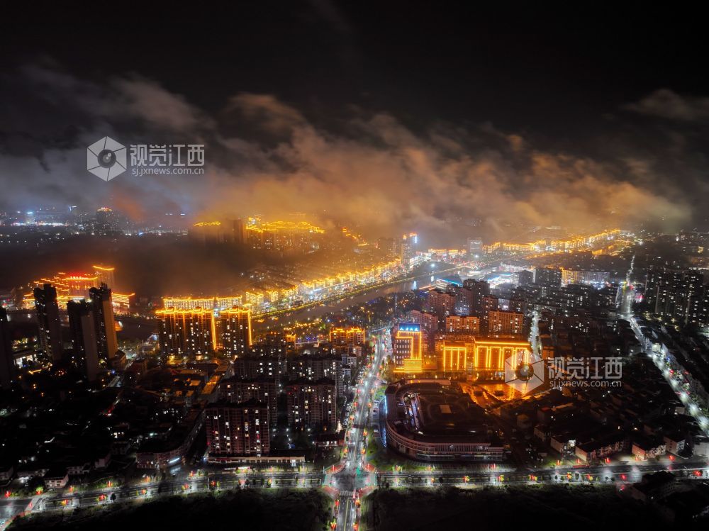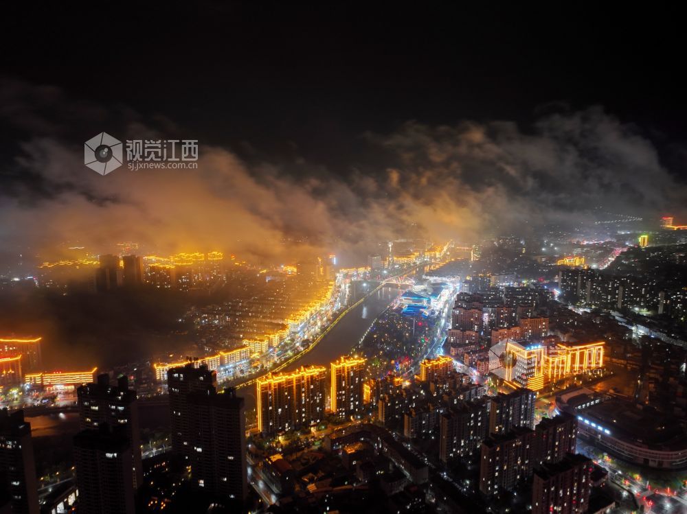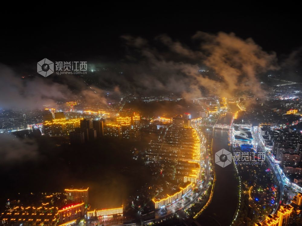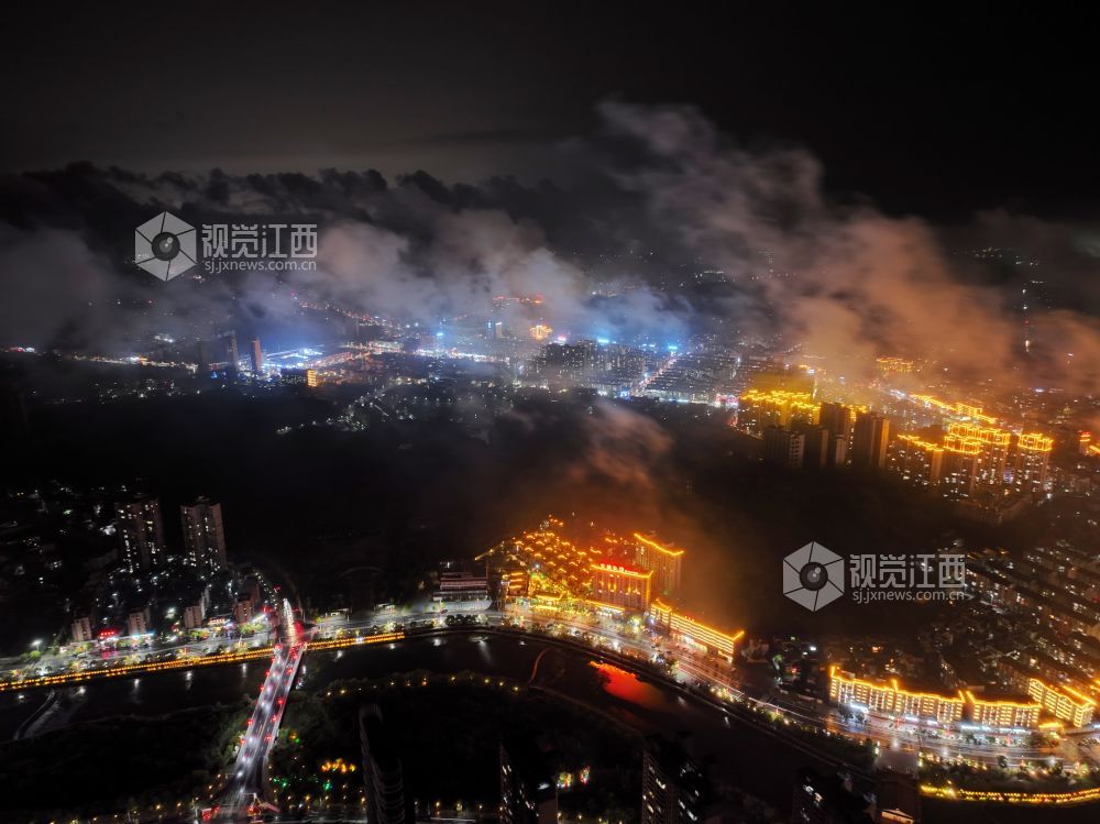 2023年10月9日晚,江西省萍乡市芦溪县县城云雾缭绕,灯光璀璨,如梦如幻。