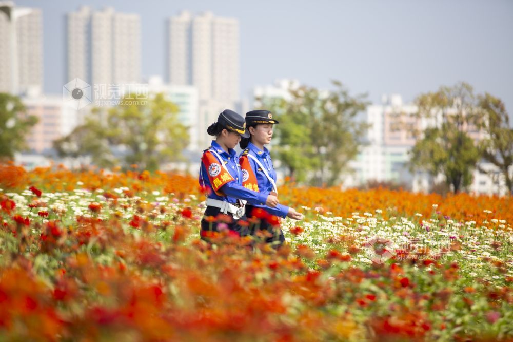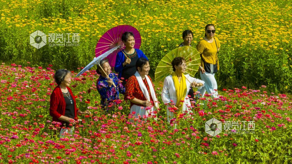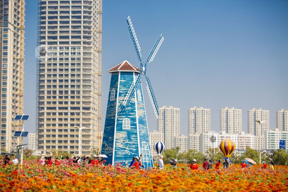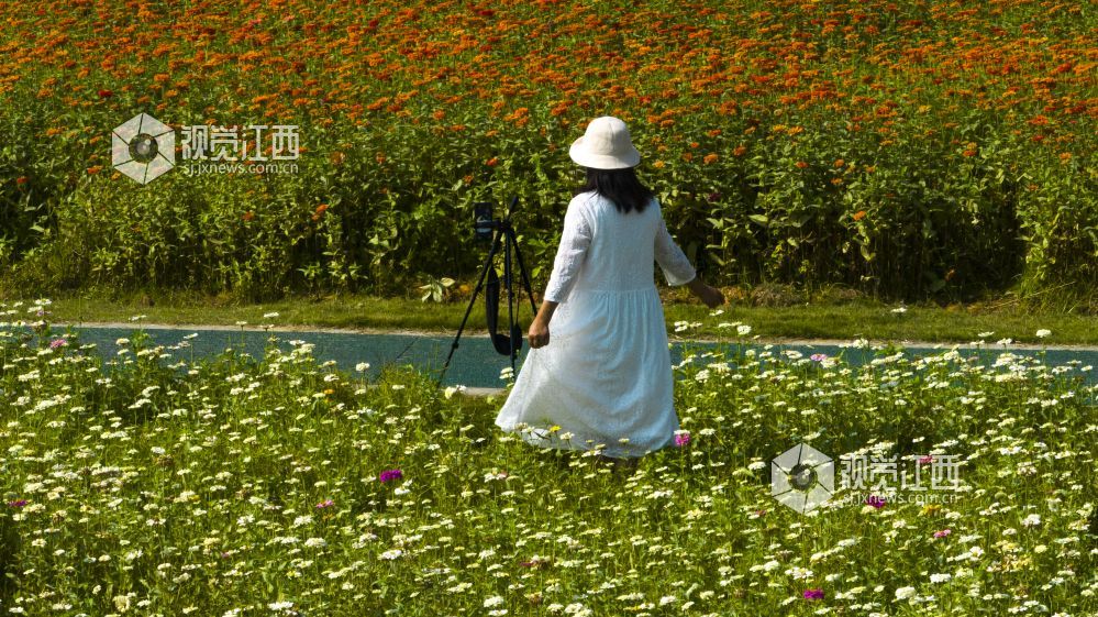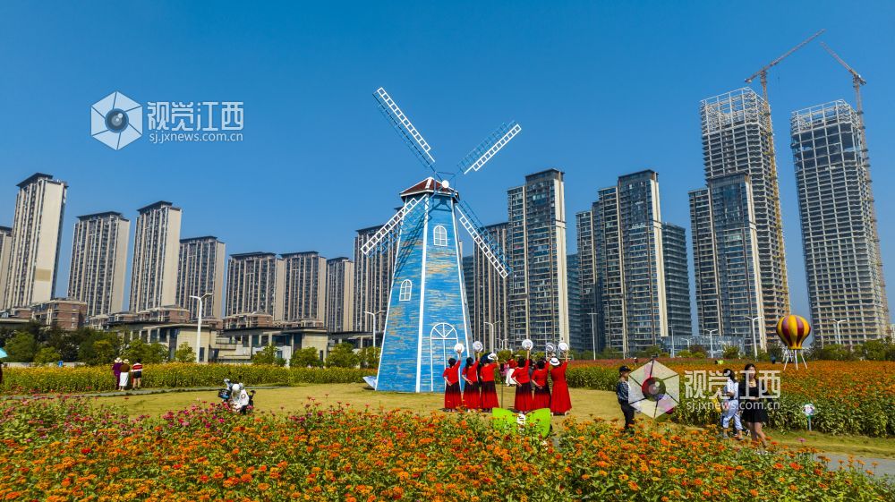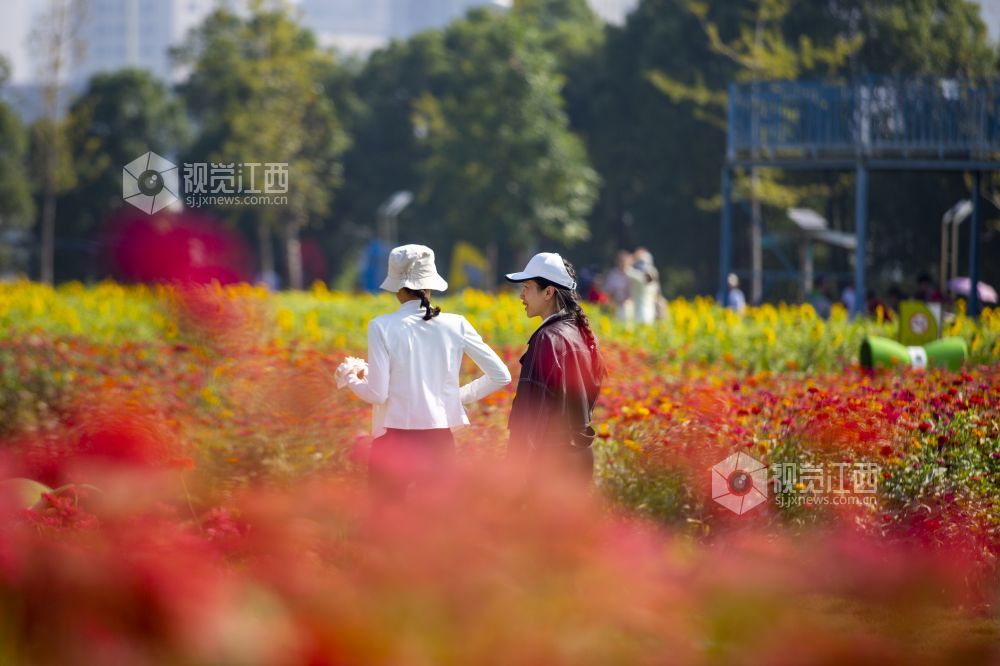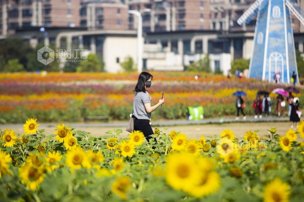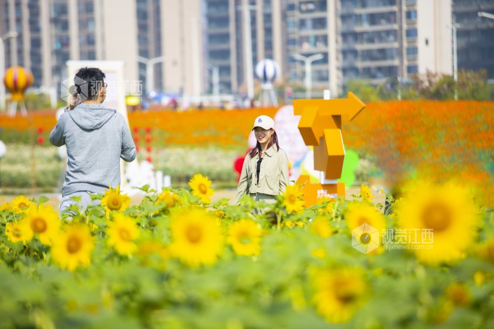 2023年10月16日,江西省南昌市新建区马兰花海公园,成片的小菊花、玛格丽特、向日葵等花卉都开了,鲜花色彩缤纷,争奇斗艳。美丽的花海与周围的城市建筑共同构成了一幅秋日城市生态画卷,不少市民来此休闲游玩,享受欢乐时光。