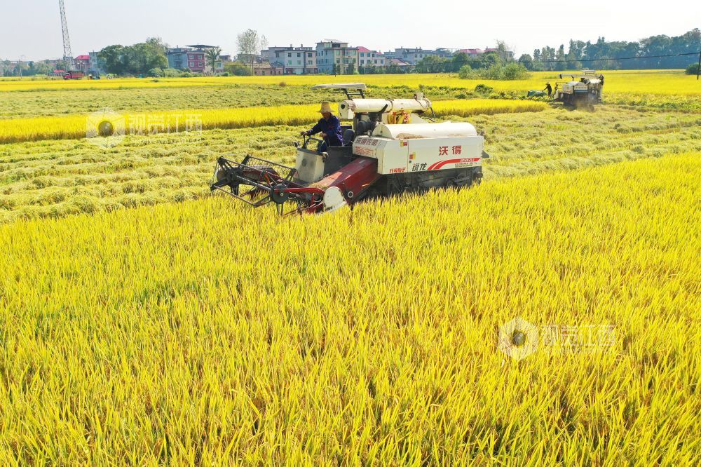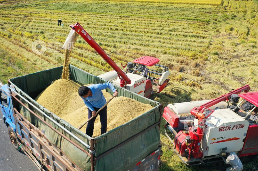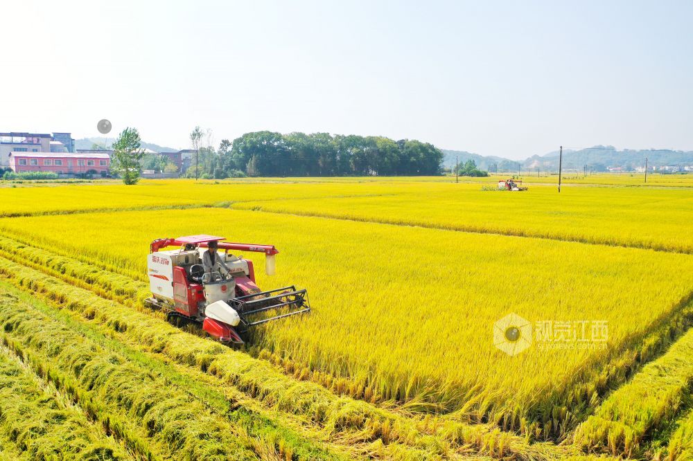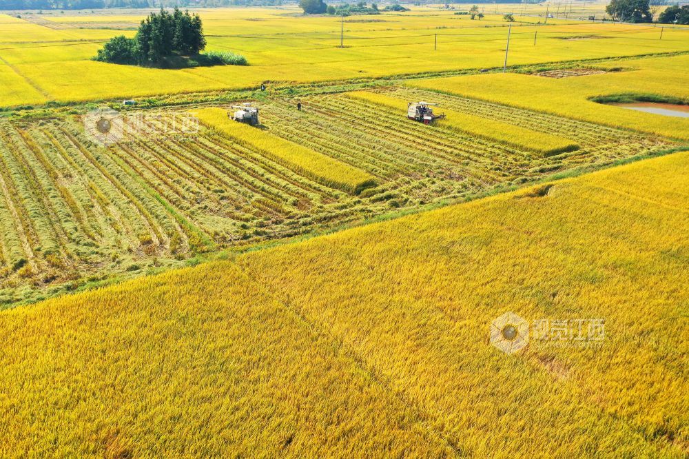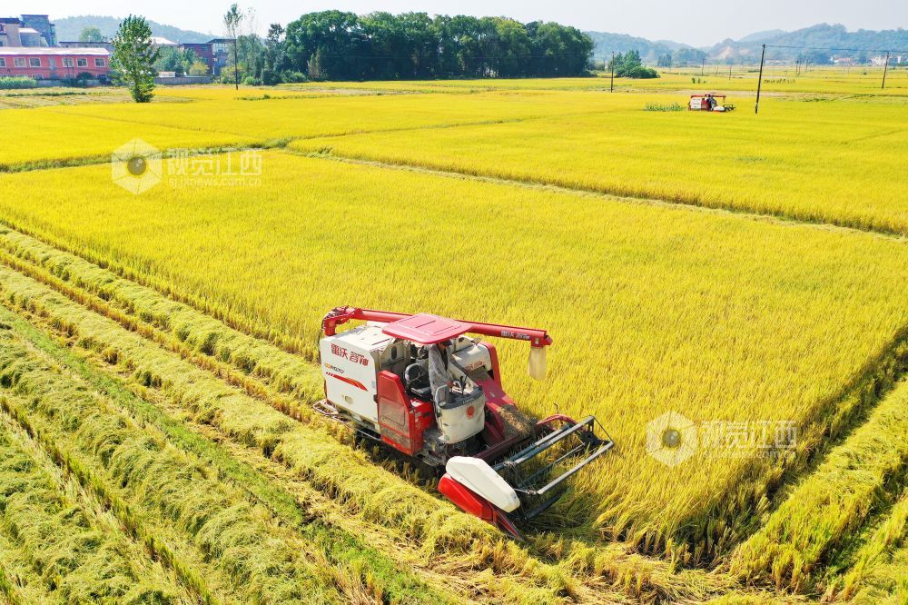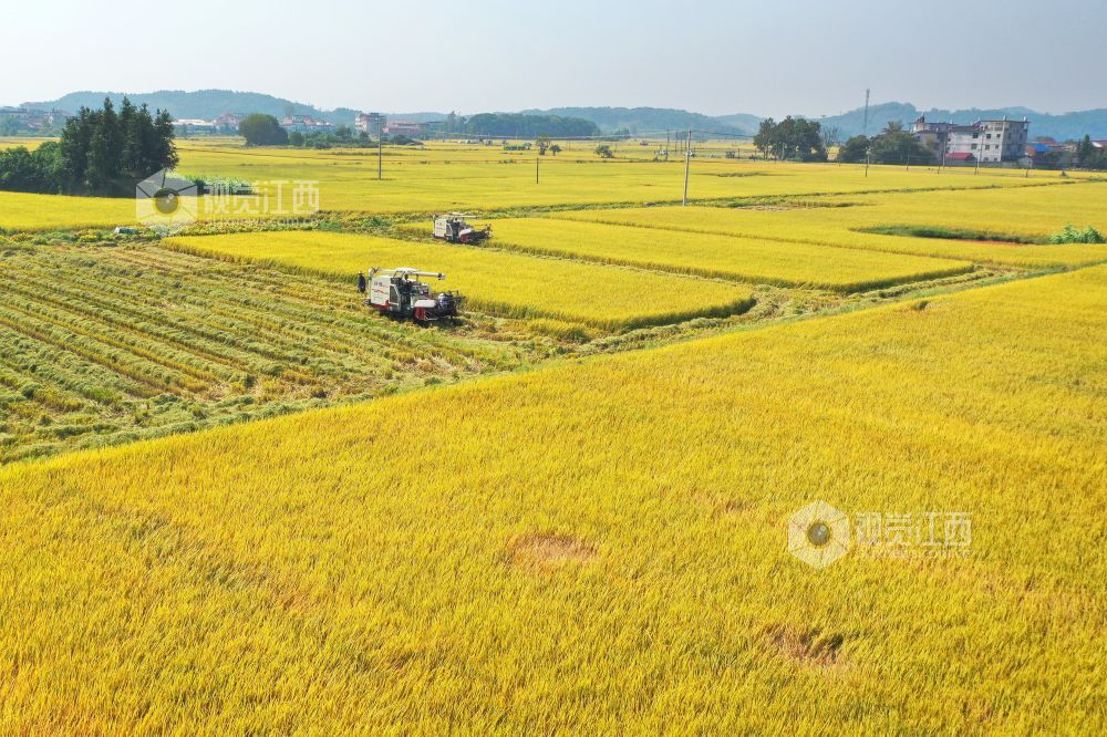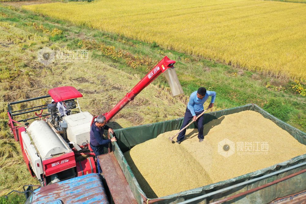 金秋时节,江西省上高县晚稻陆续进入收割期,金黄的农田里稻浪滚滚、机声隆隆,当地农民抢抓有利天气进行晚稻收割、搬运、晾晒、贮藏,确保秋粮颗粒归仓。