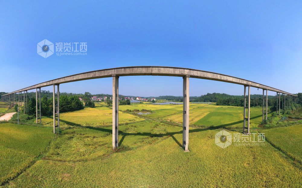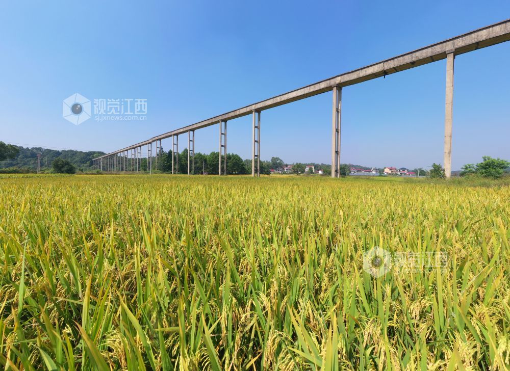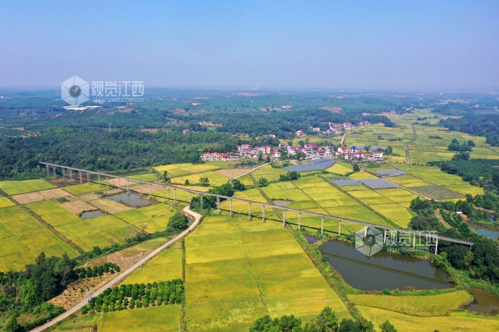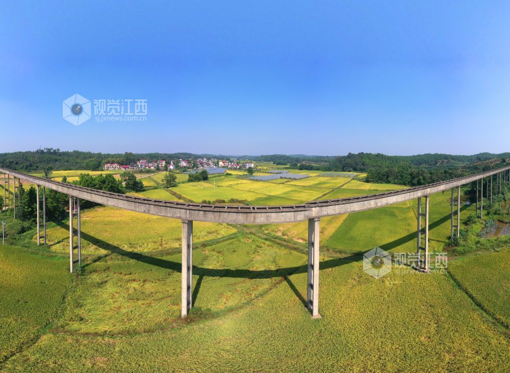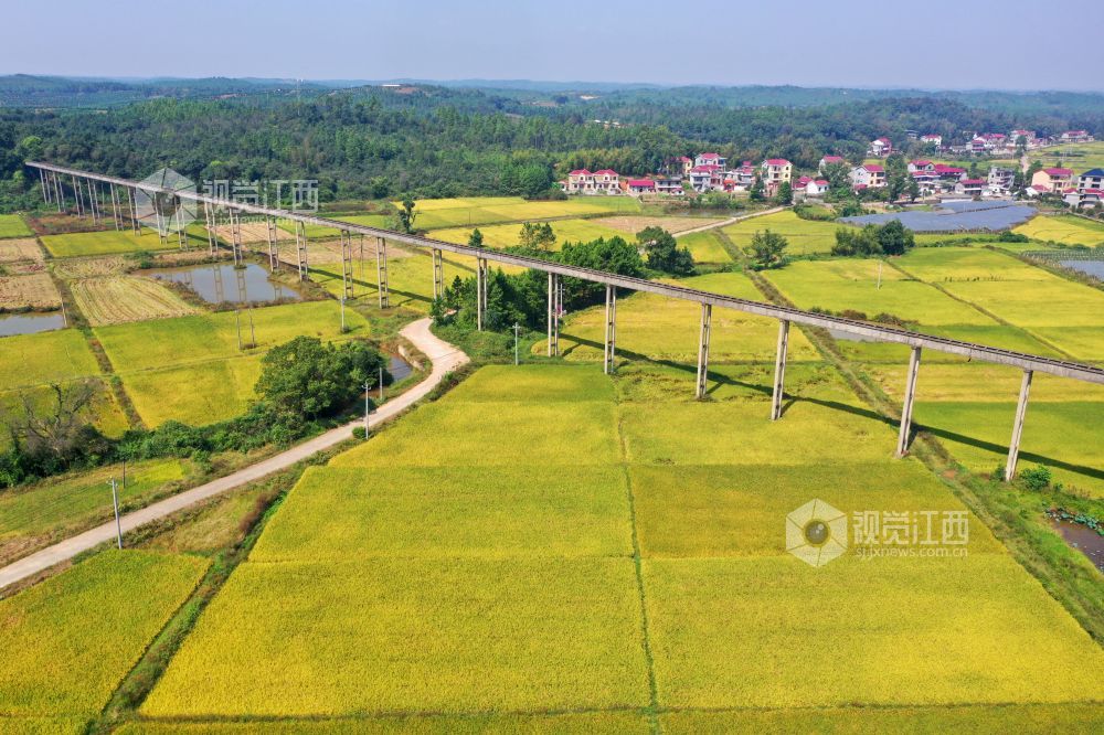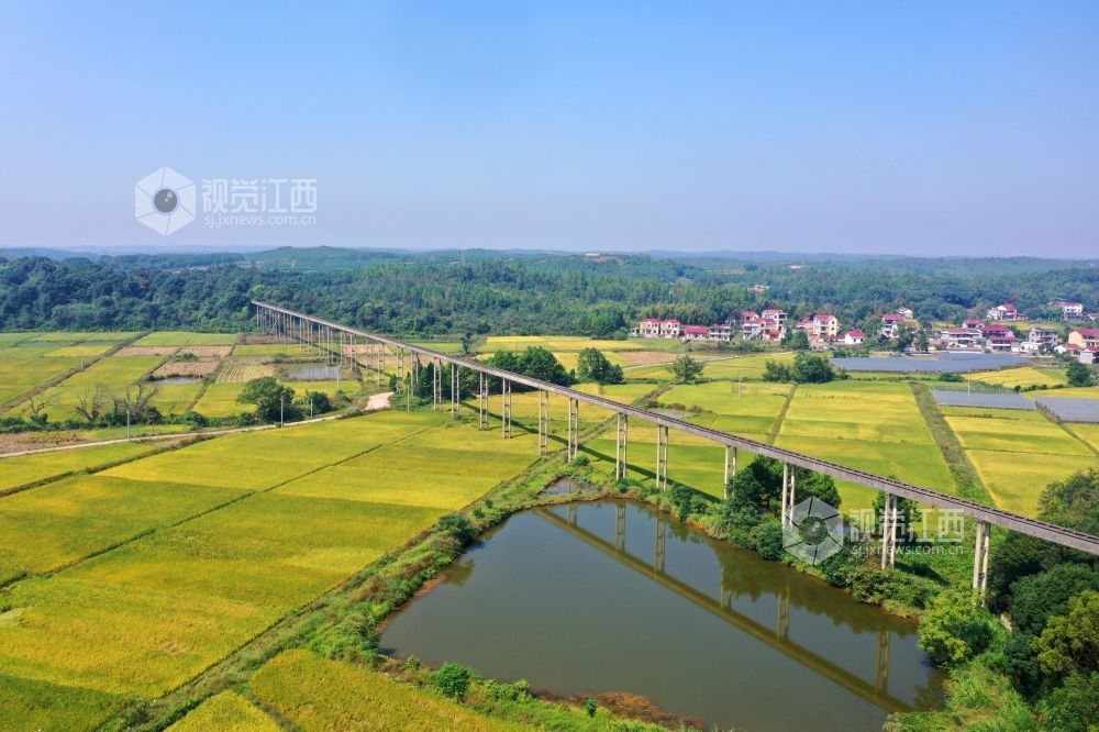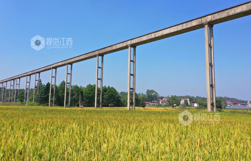 10月16日,江西省吉安市泰和县上模乡油洲村,高架引水渠跨越金色田园,为水稻灌溉提供水源,助力粮食丰产丰收。