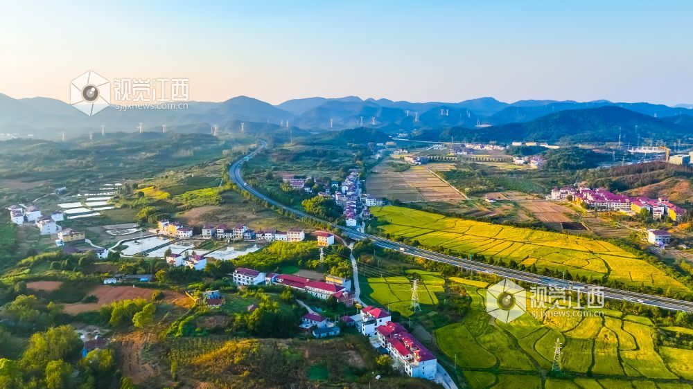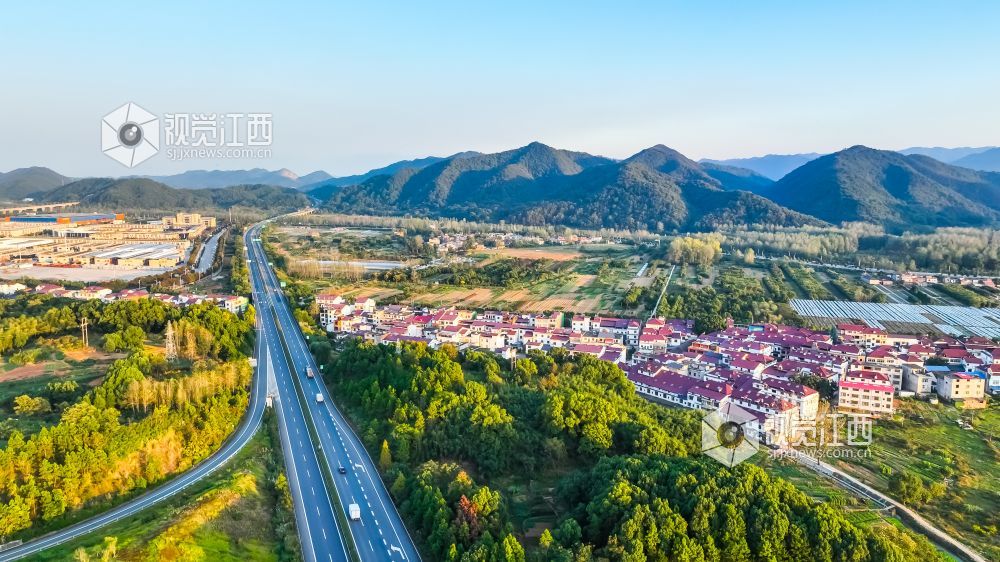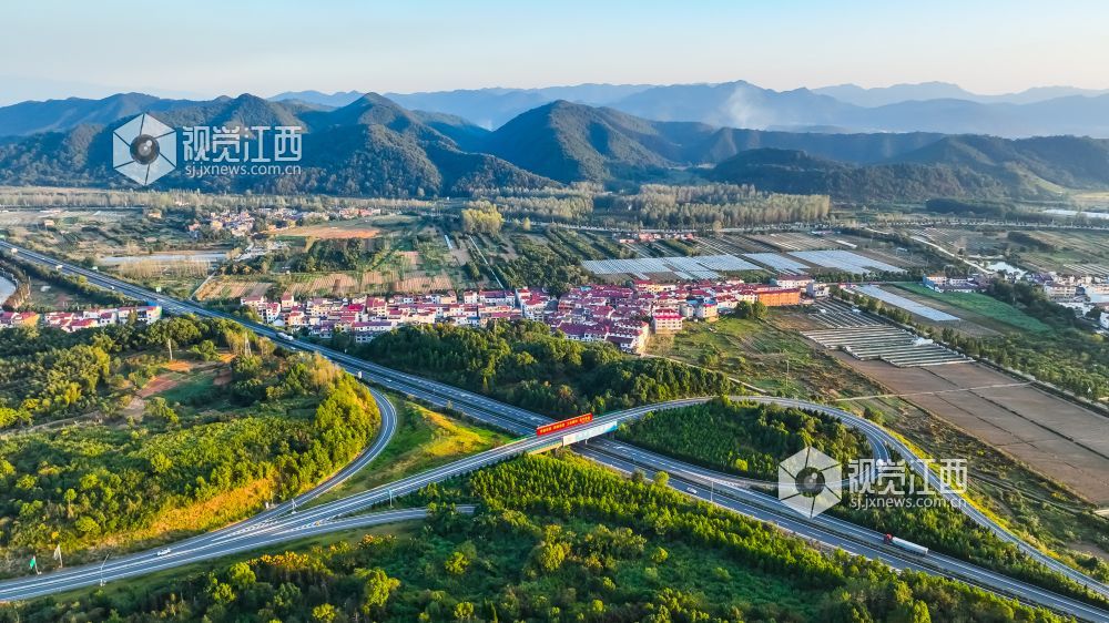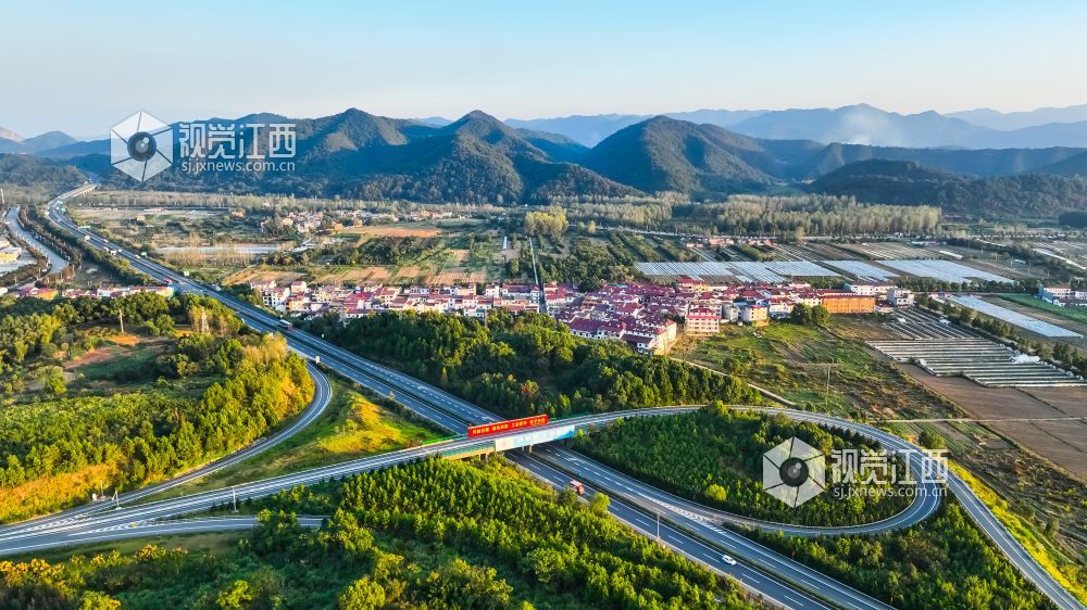 2023年10月17日,江西省瑞昌市桂林街道,穿境而过的杭瑞高速公路与青山、田园、村落等构成一幅秀美的乡村生态画卷。