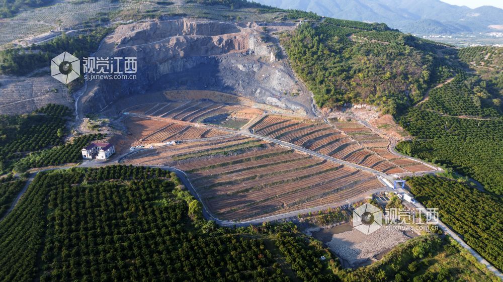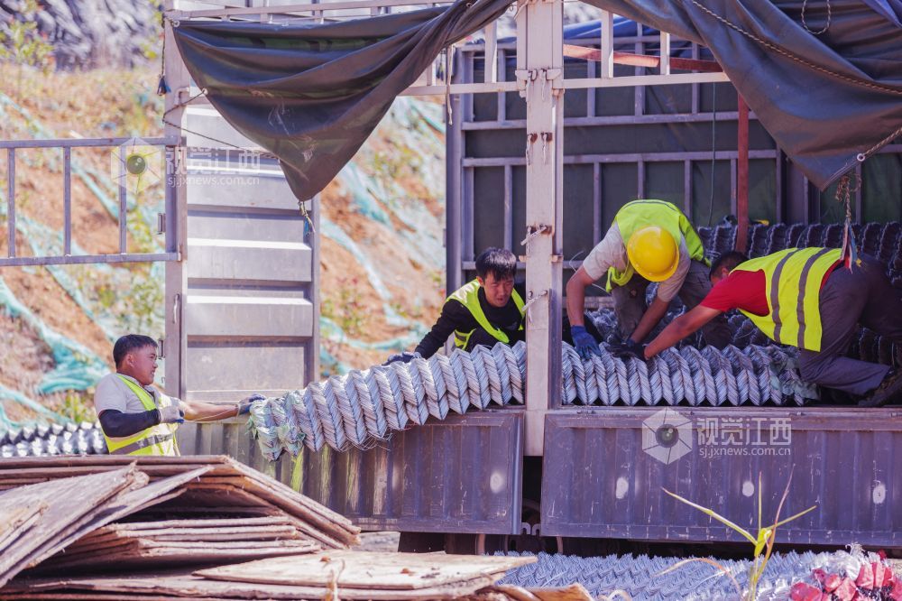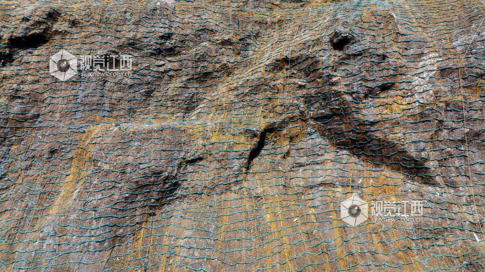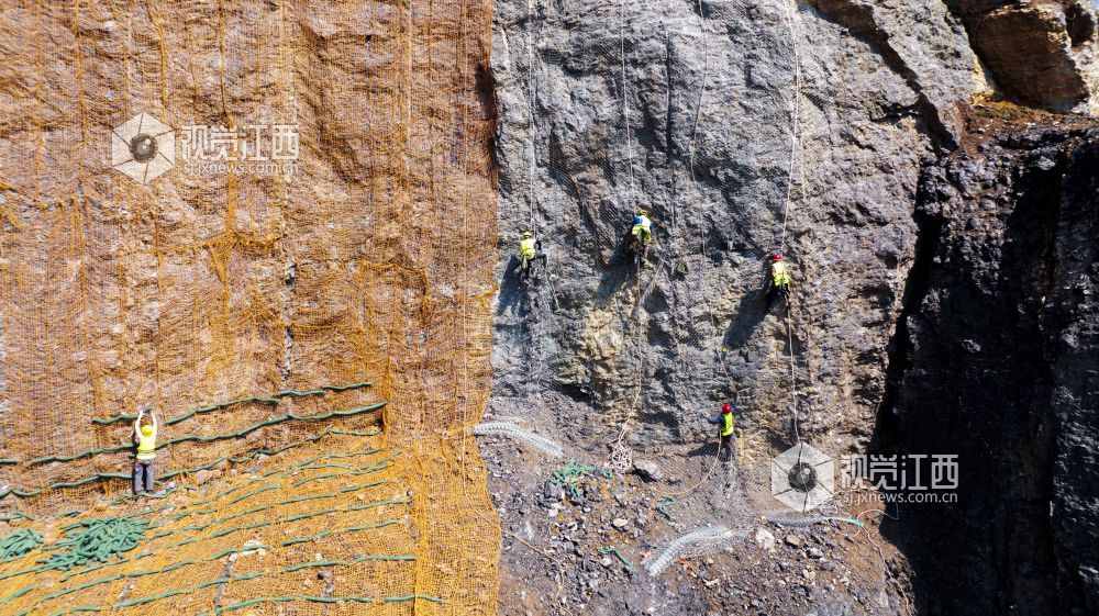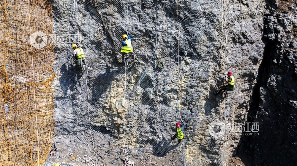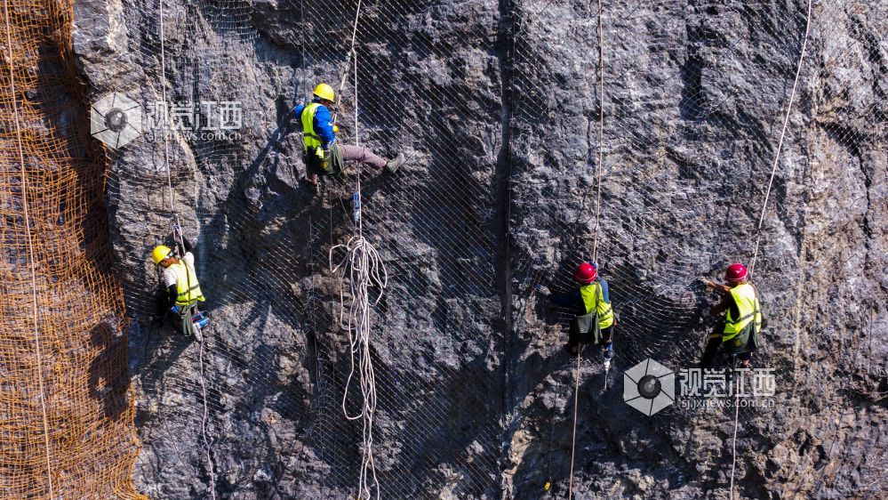 10月17日,在江西省新余市渝水区仁和乡叉里山矿山立面修复项目工地上,工人们正在岩面上打洞固网,现场一派繁忙景象。