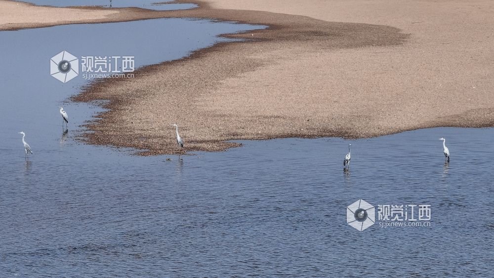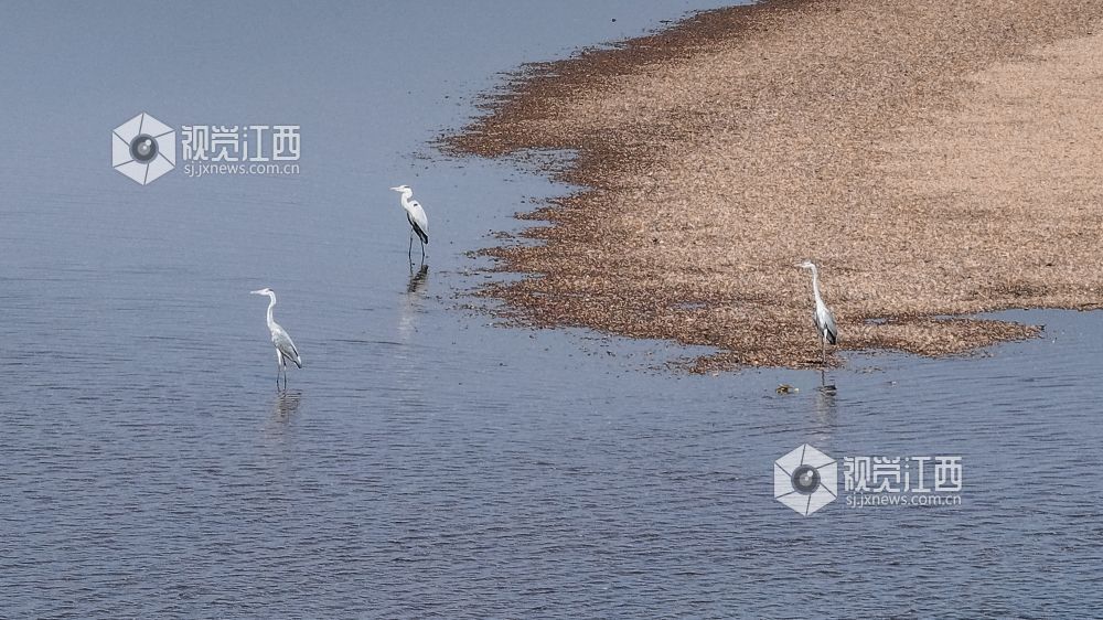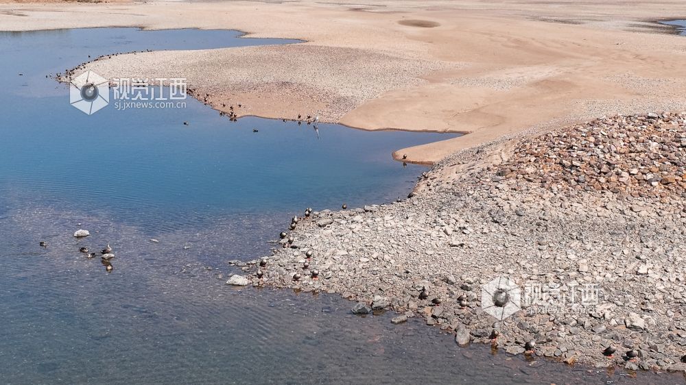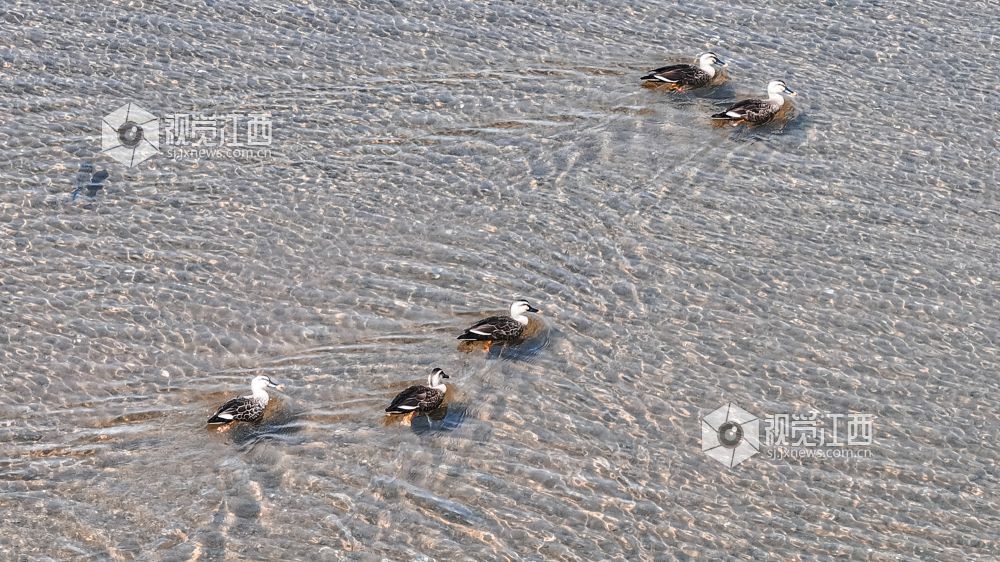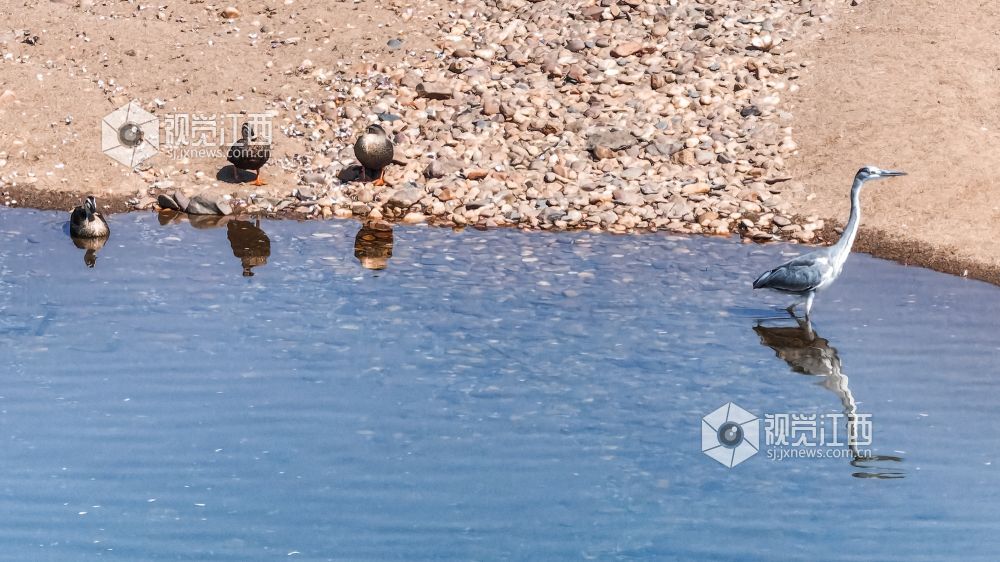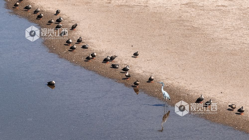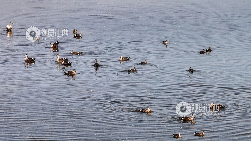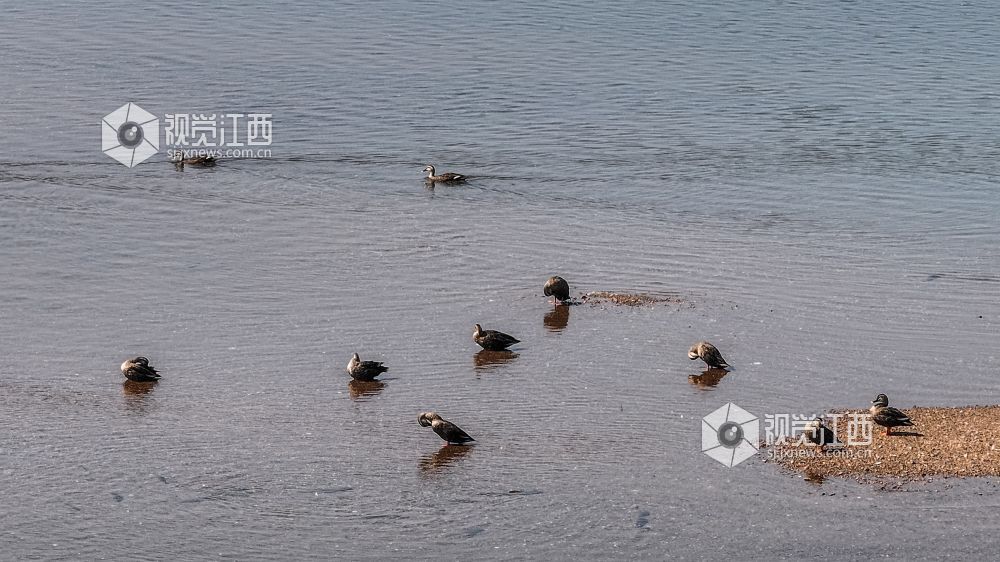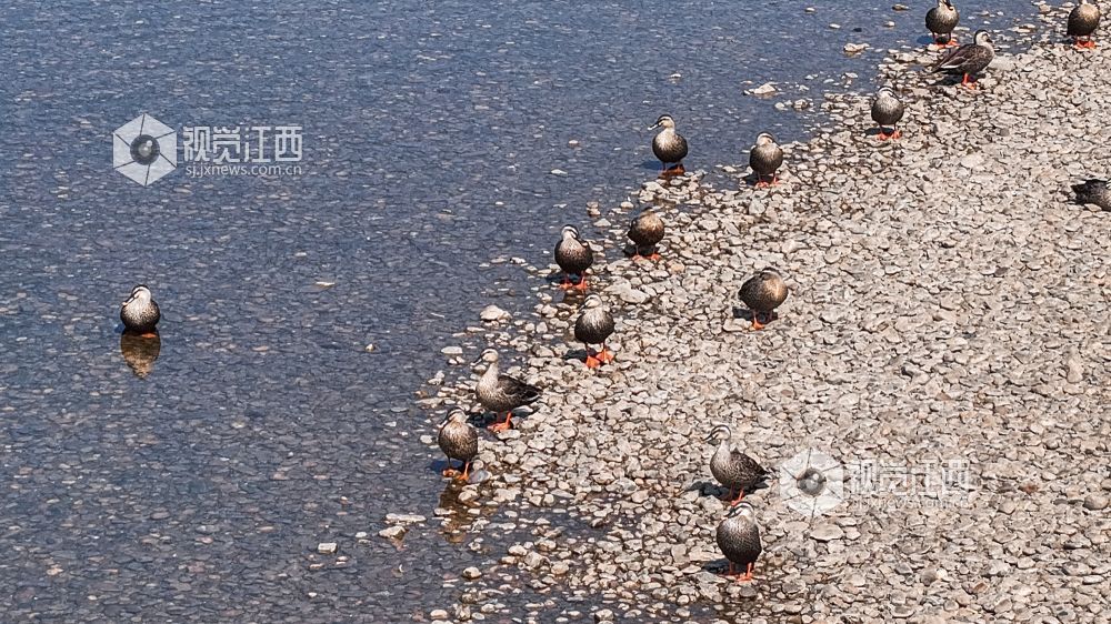 在赣江边附近居住的居民老陈告诉我们,这群野鸭在这里有一段时间了。鸭迁徙经过此地时,恰遇赣江水位低,野鸭被丰富鱼虾水草诱惑,在此停留栖息,这也说明赣江水质好转和鱼类增多。