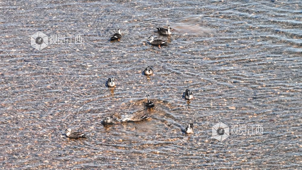 10月17日,成群的野鸭在江中觅食嬉戏,数量达到近百只。它们轻快地在江面游着,偶然把头扎进水里,然后伸回来,晃动着,把头上的水甩干,欢快地扇动着翅膀,似乎也在享受着这份暖阳带来的惬意。偶尔有鱼跃出水面,在空中划了道优美的弧线,掉入水中,溅起了一朵朵的水花。