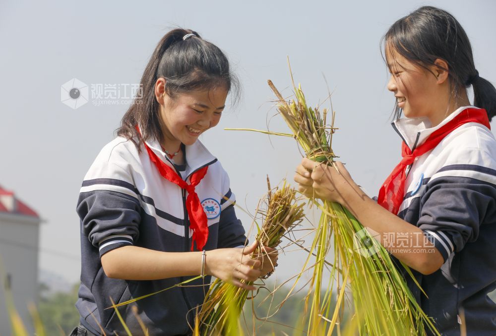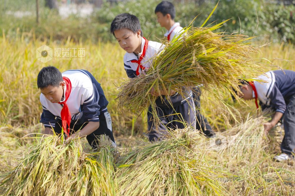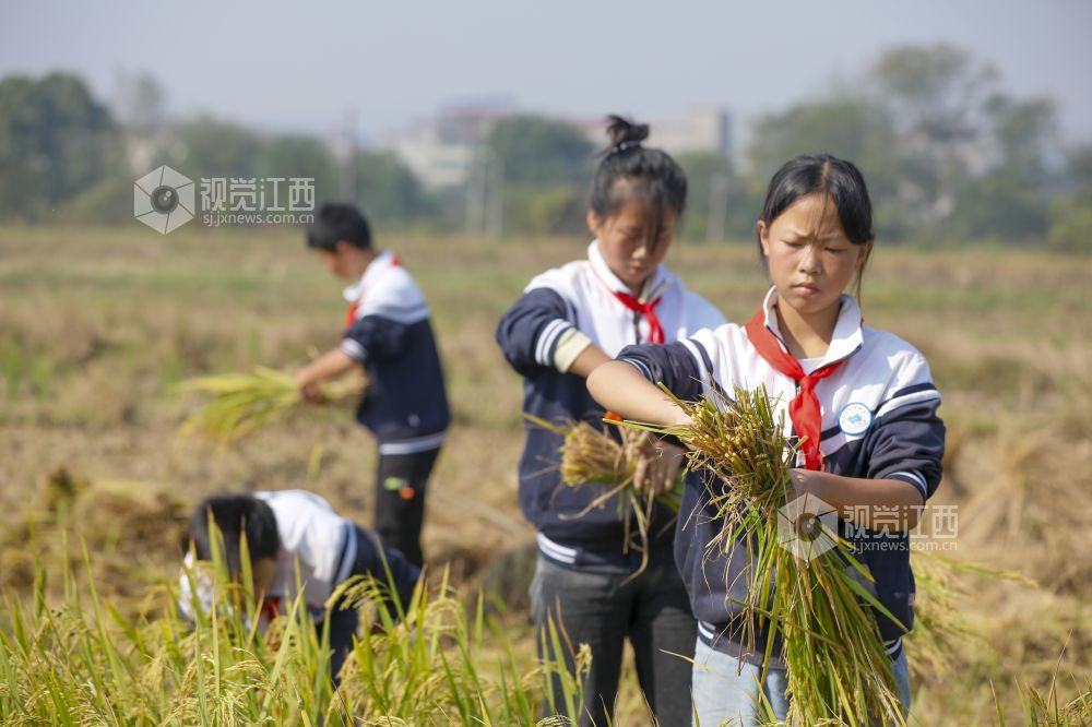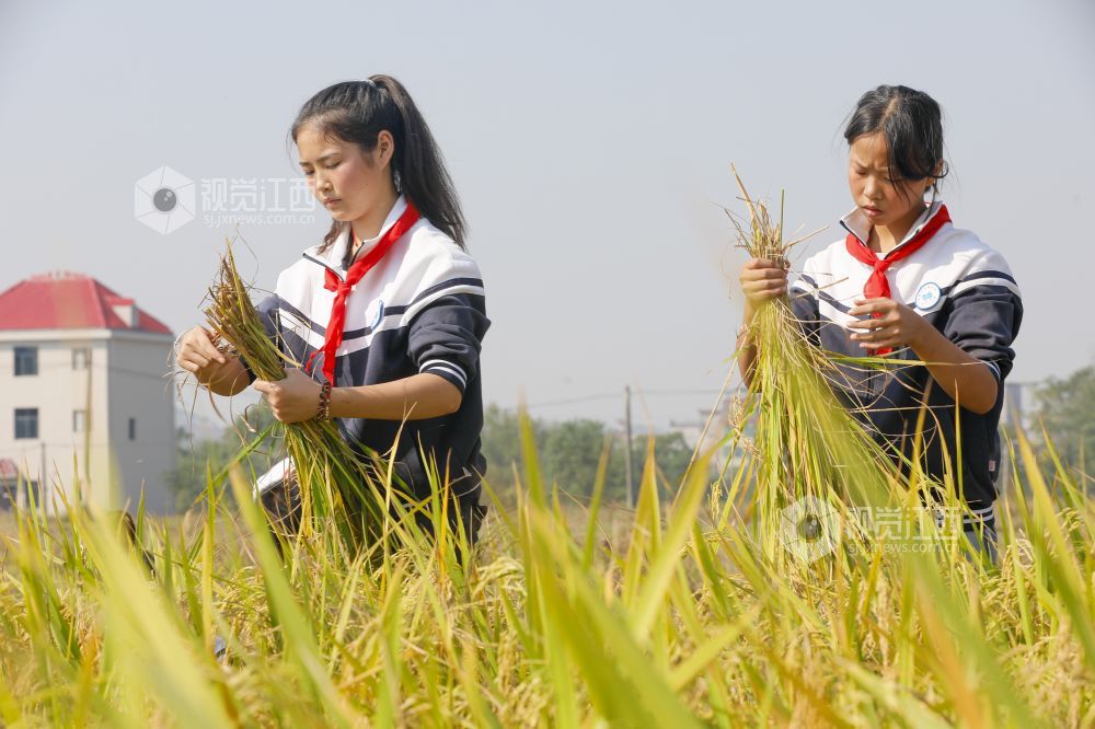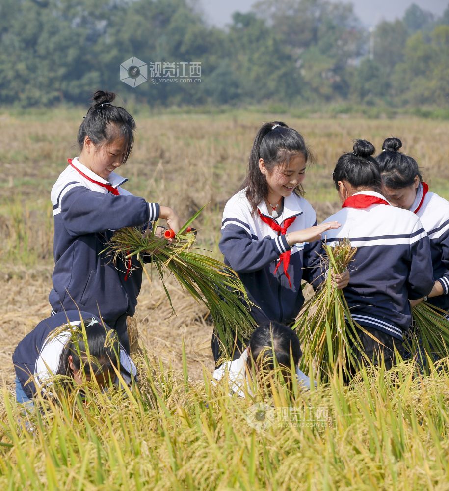 2023年10月18日,江西省吉安市吉州区长塘中学的师生在校外劳动实践基地开展田间课堂活动,通过手工收割稻谷等体验传统农耕文化、感受劳动乐趣,知晓每一粒粮食的来之不易。
