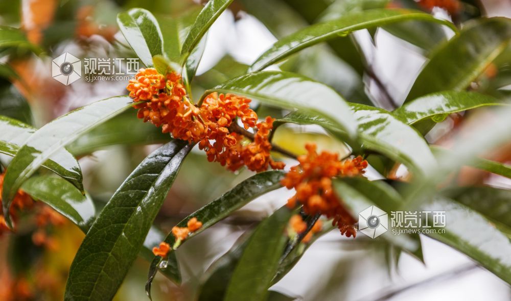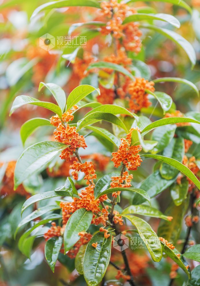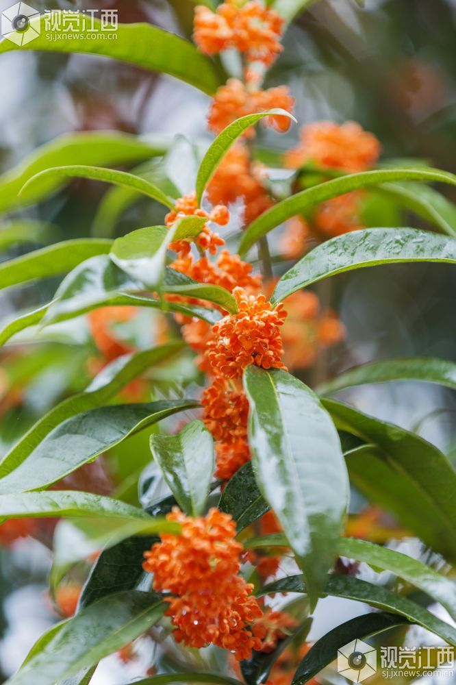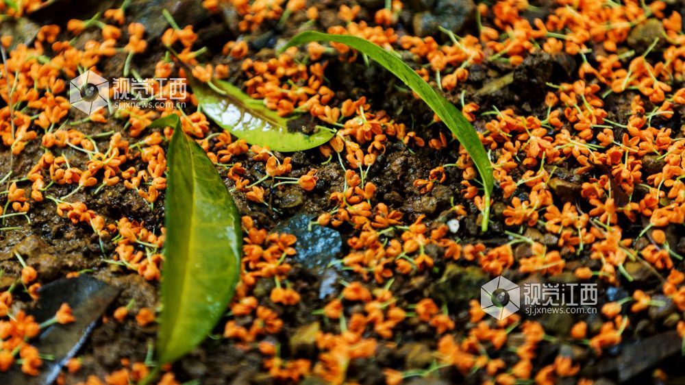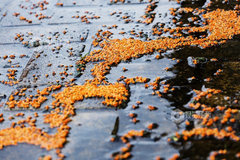 10月19日,雨淅淅沥沥地下着,在江西新余渝水区良山镇黄虎村,秋雨中的桂花枝叶显得更加光亮,似碧玉衬托着桂花的满树金黄,一阵风吹来,金色的桂花随风而落,清香四溢,满地的桂花在雨水的冲刷下,形成了一幅幅金色的图画,给人以美的享受。