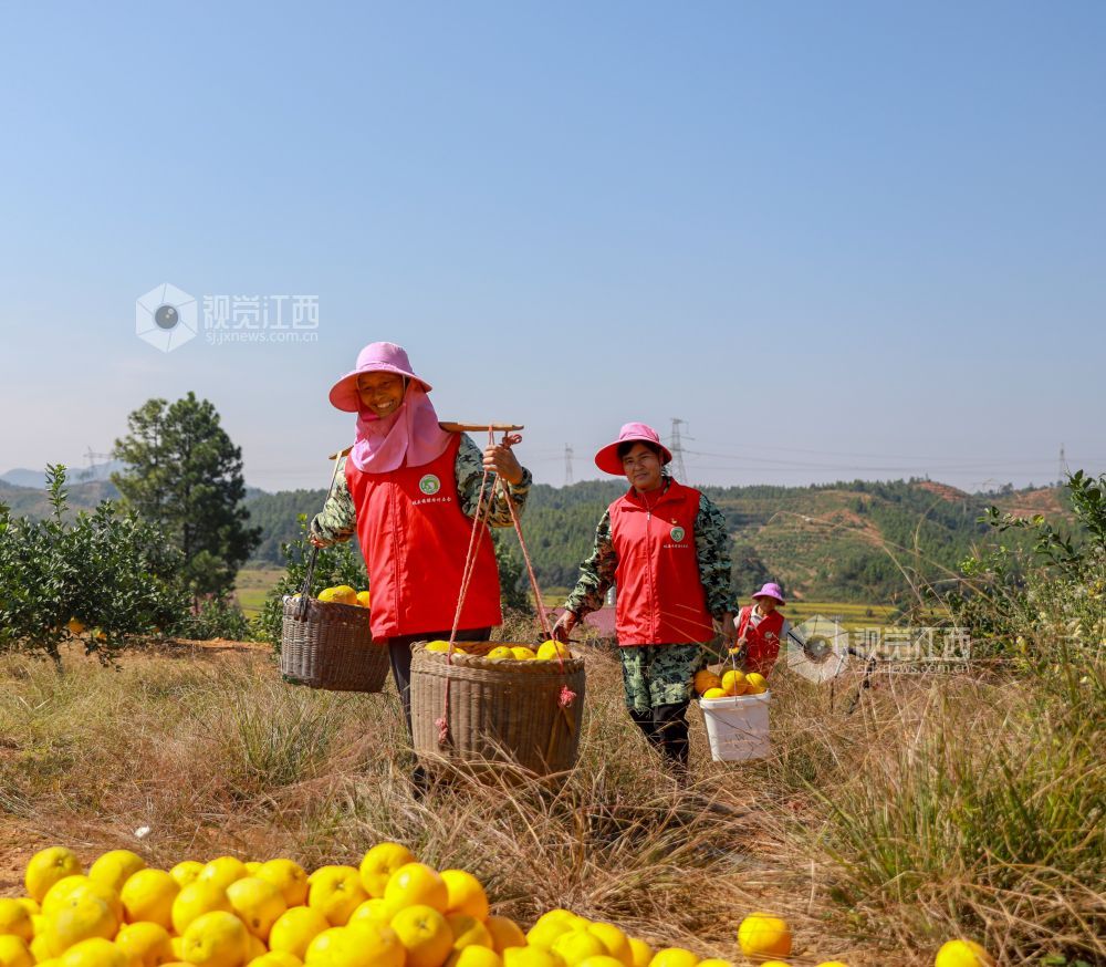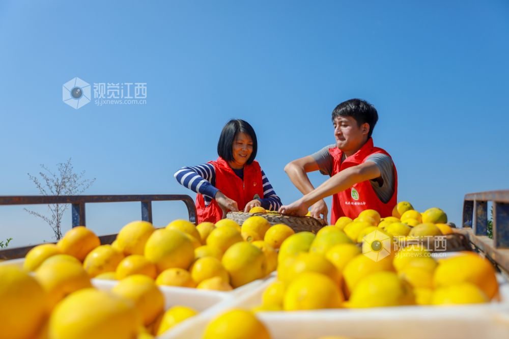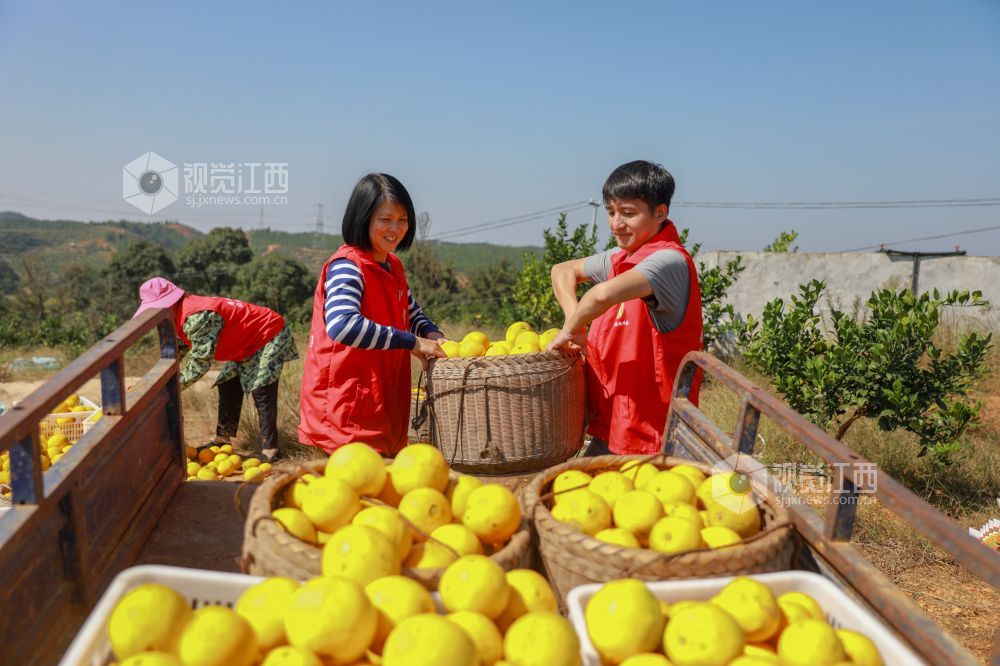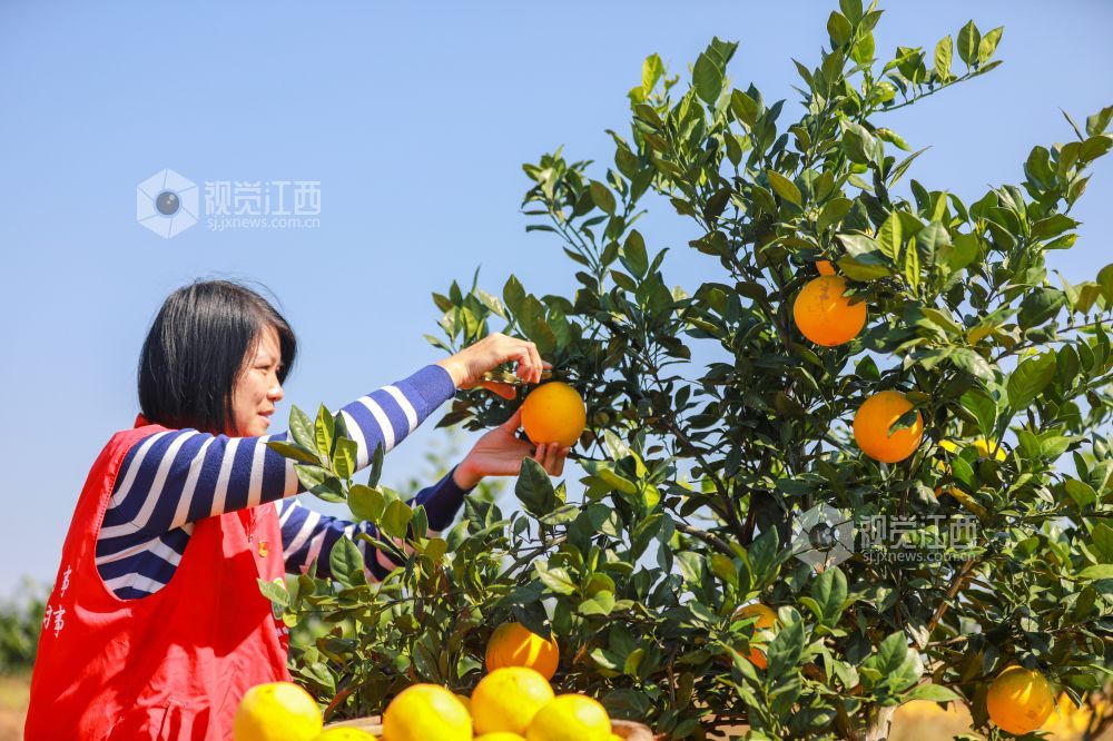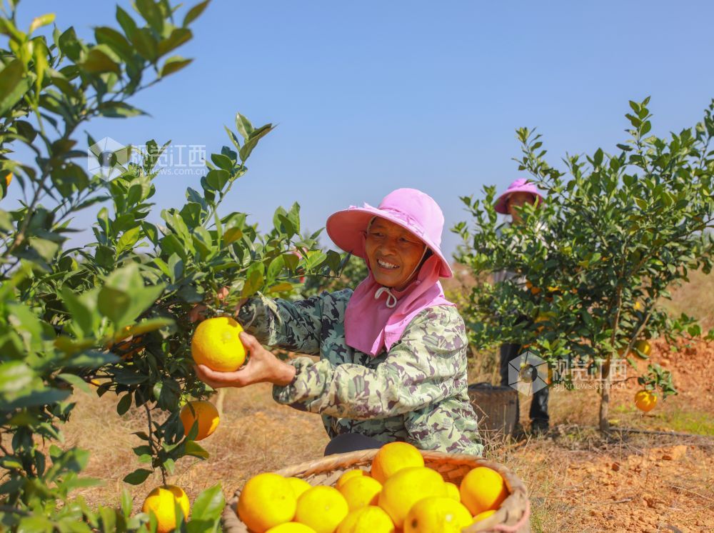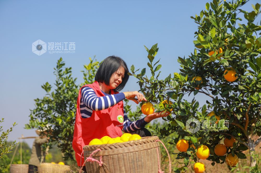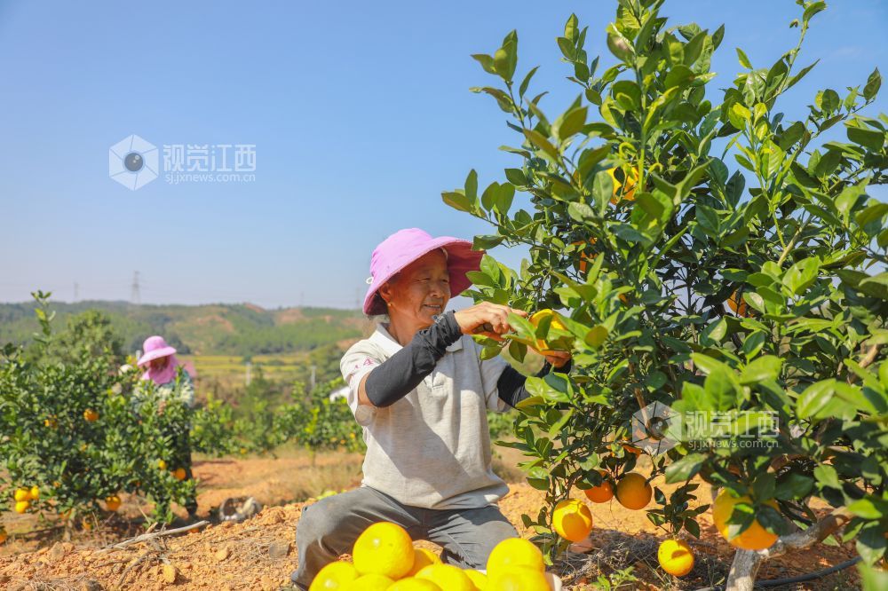 2023年10月18日,江西省吉安市万安县枧头镇横路村脐橙基地迎来丰收,党员志愿者和果农在采摘脐橙,供应市场。