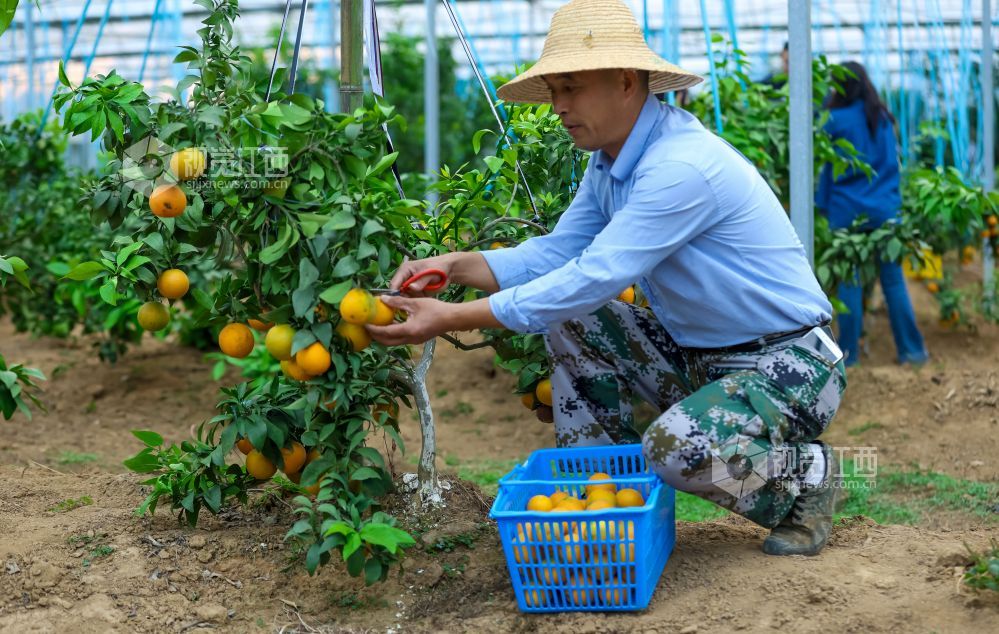 2023年10月20日,江西省瑞昌市赛湖农场精品水果采摘园沃柑基地,市民和果农正在采摘沃柑。