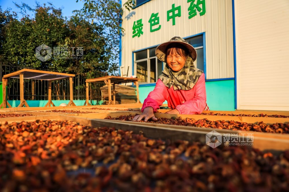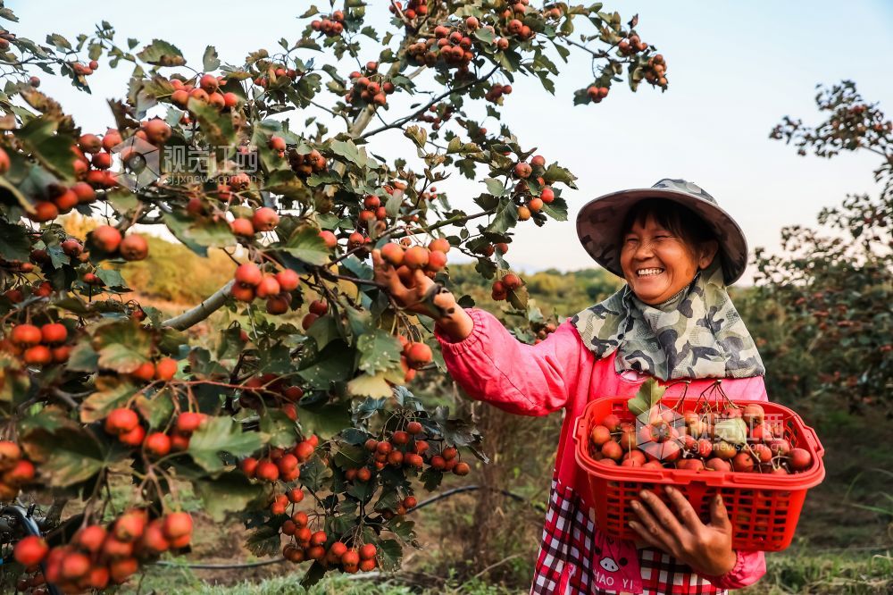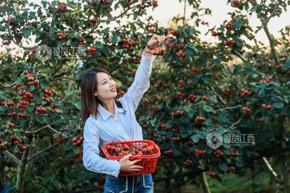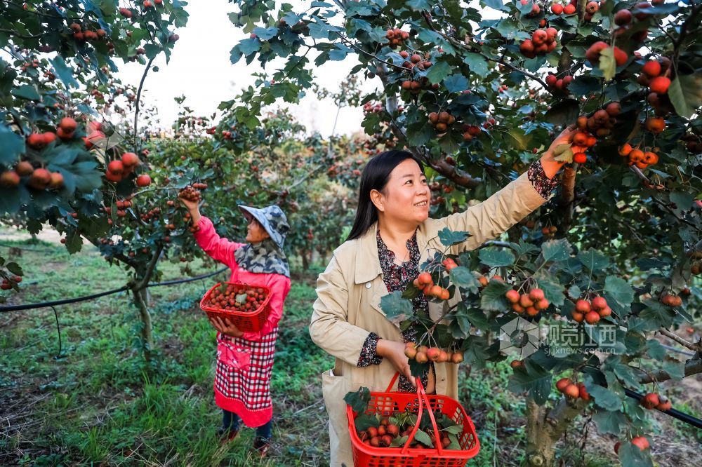 金秋时节,九江市柴桑区新合镇址坊村九江金蕾中药材种植专业合作社山楂基地里500多亩山楂硕果满枝,村民利用晴好天气采摘山楂,供应市场,实现山楂增值、农民增收。