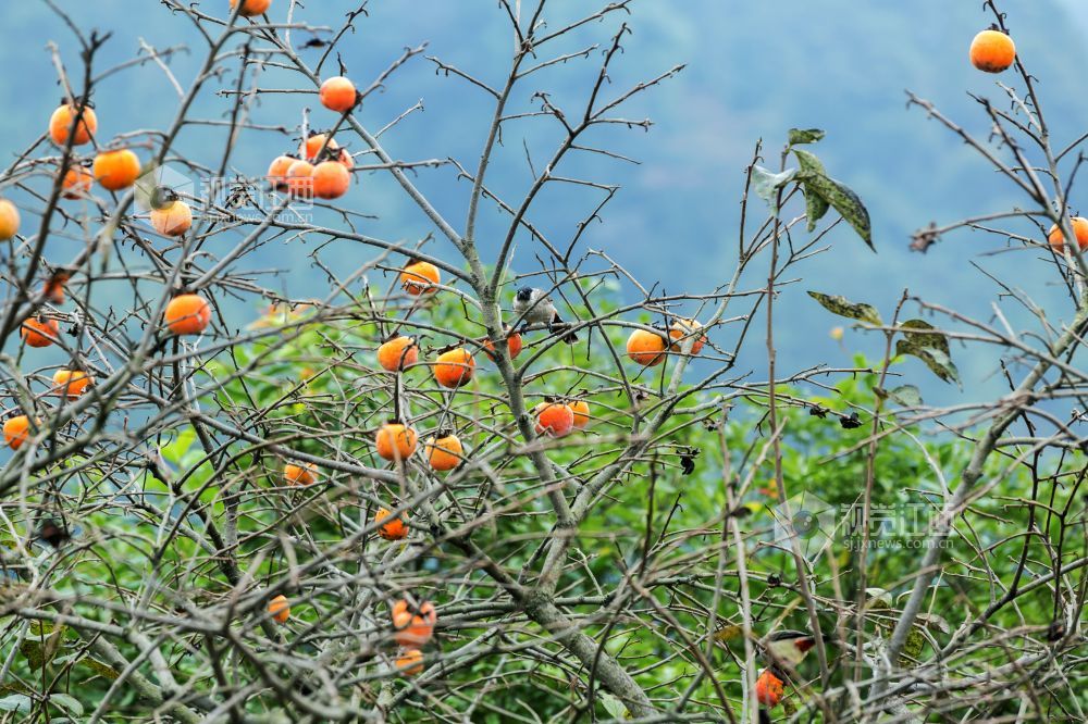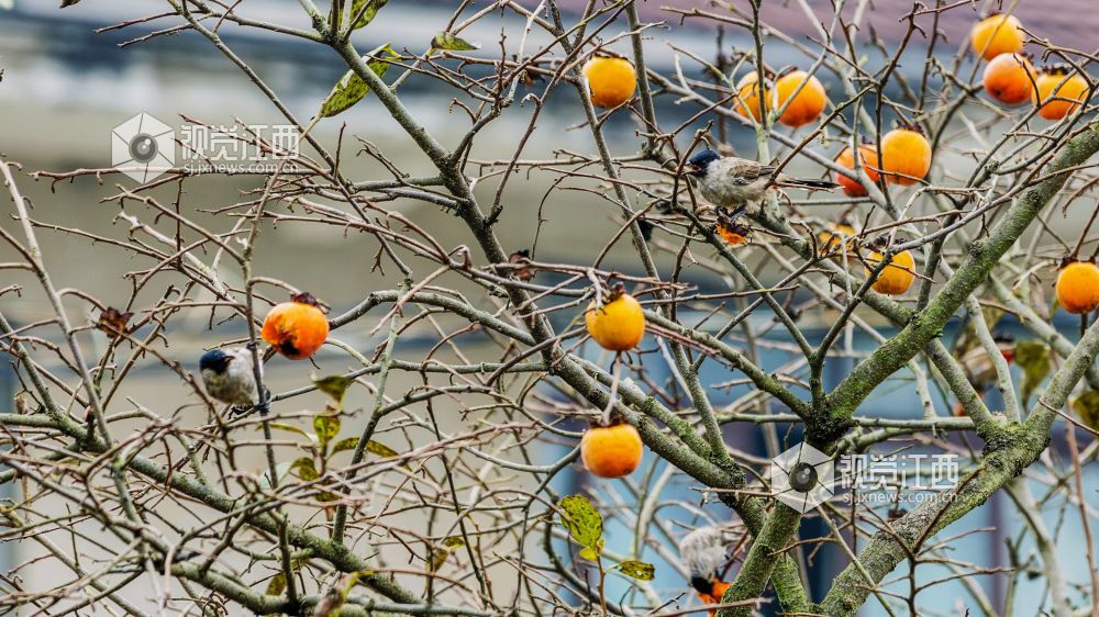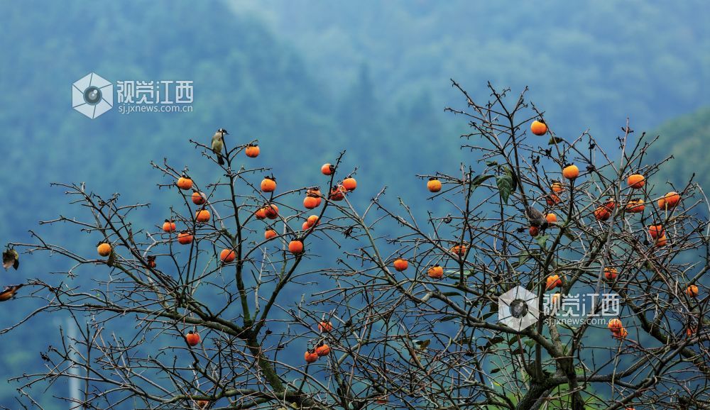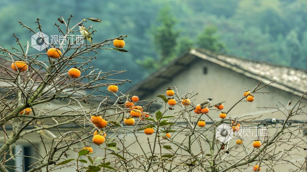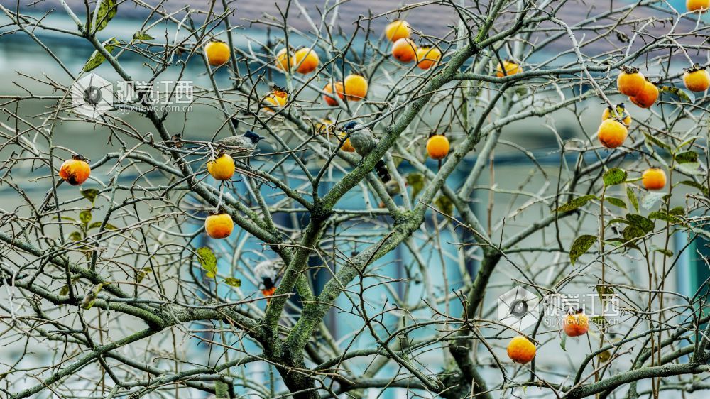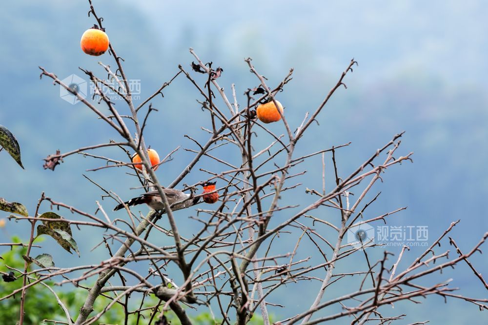 10月29日,在江西新余渝水区良山镇黄虎村,柿子树上的柿子熟了,柿子树上的鸟儿从这个枝头飞到那个枝头,叽叽喳喳地叫着,并不停地啄着柿子,树边的路上人来车往,形成了一幅人与自然和谐相处的山乡秋色风景。