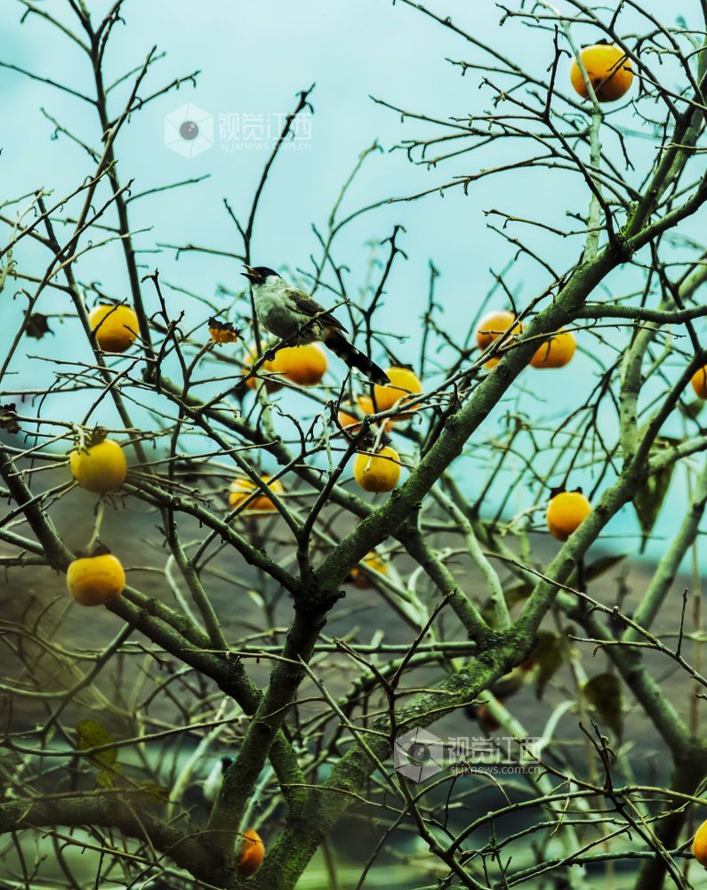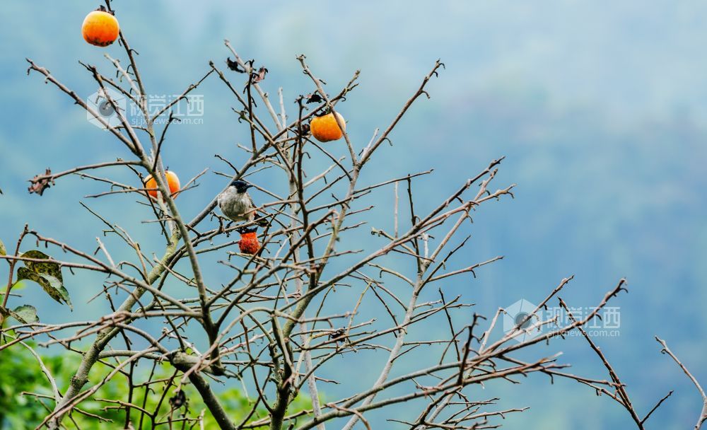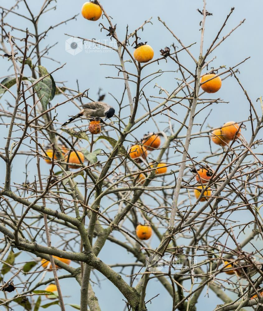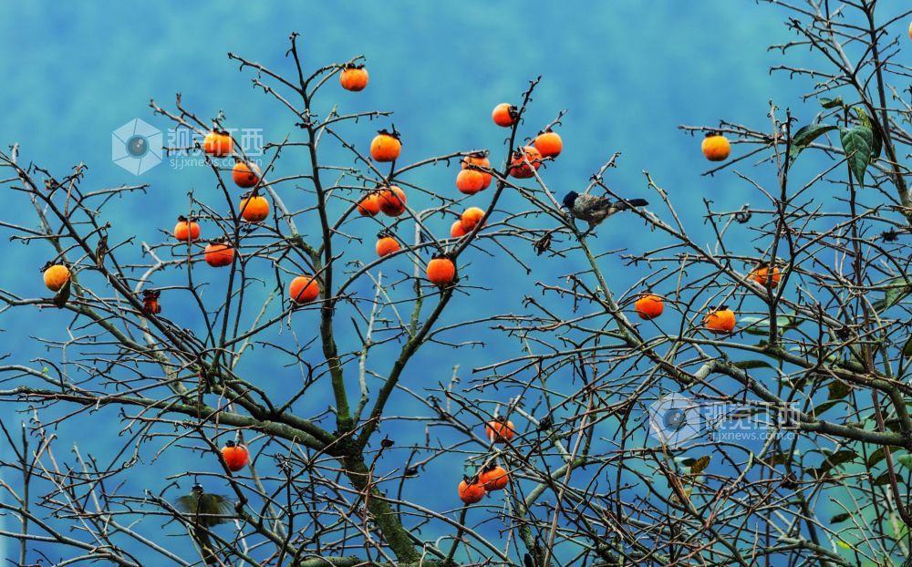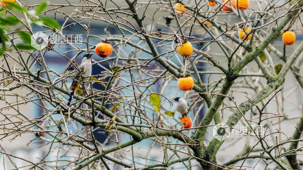 10月29日,在江西新余渝水区良山镇黄虎村,柿子树上的柿子熟了,柿子树上的鸟儿从这个枝头飞到那个枝头,叽叽喳喳地叫着,并不停地啄着柿子,树边的路上人来车往,形成了一幅人与自然和谐相处的山乡秋色风景。