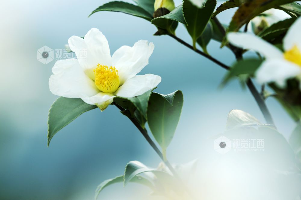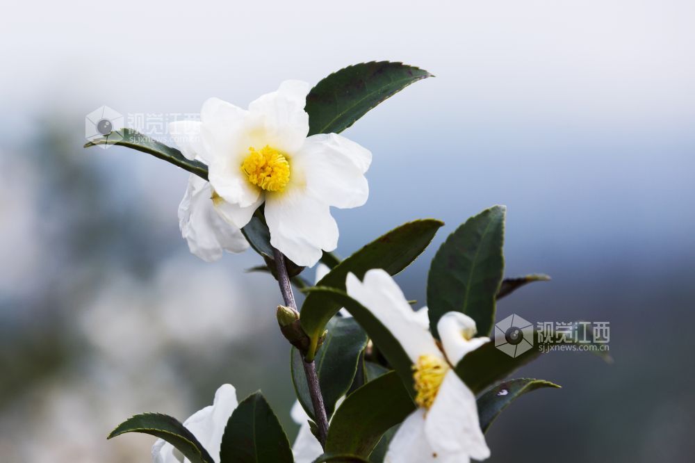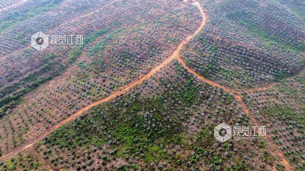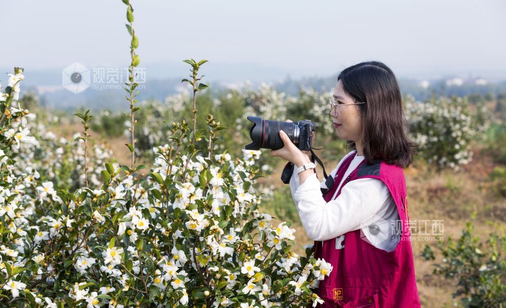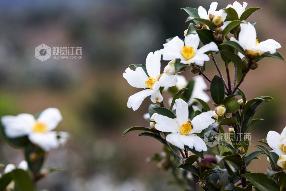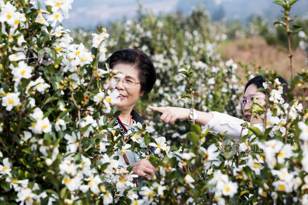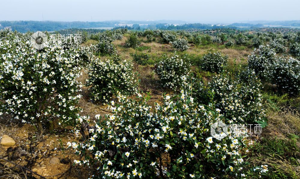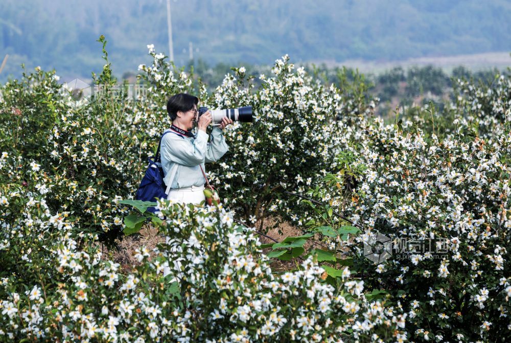11月4日,在江西省新余市渝水区南安乡油茶种植基地的600余亩油茶林的茶花竞相盛开,满山的白花,就像在山野间下了一场雪,吸引了不少游客前来观光、拍照。